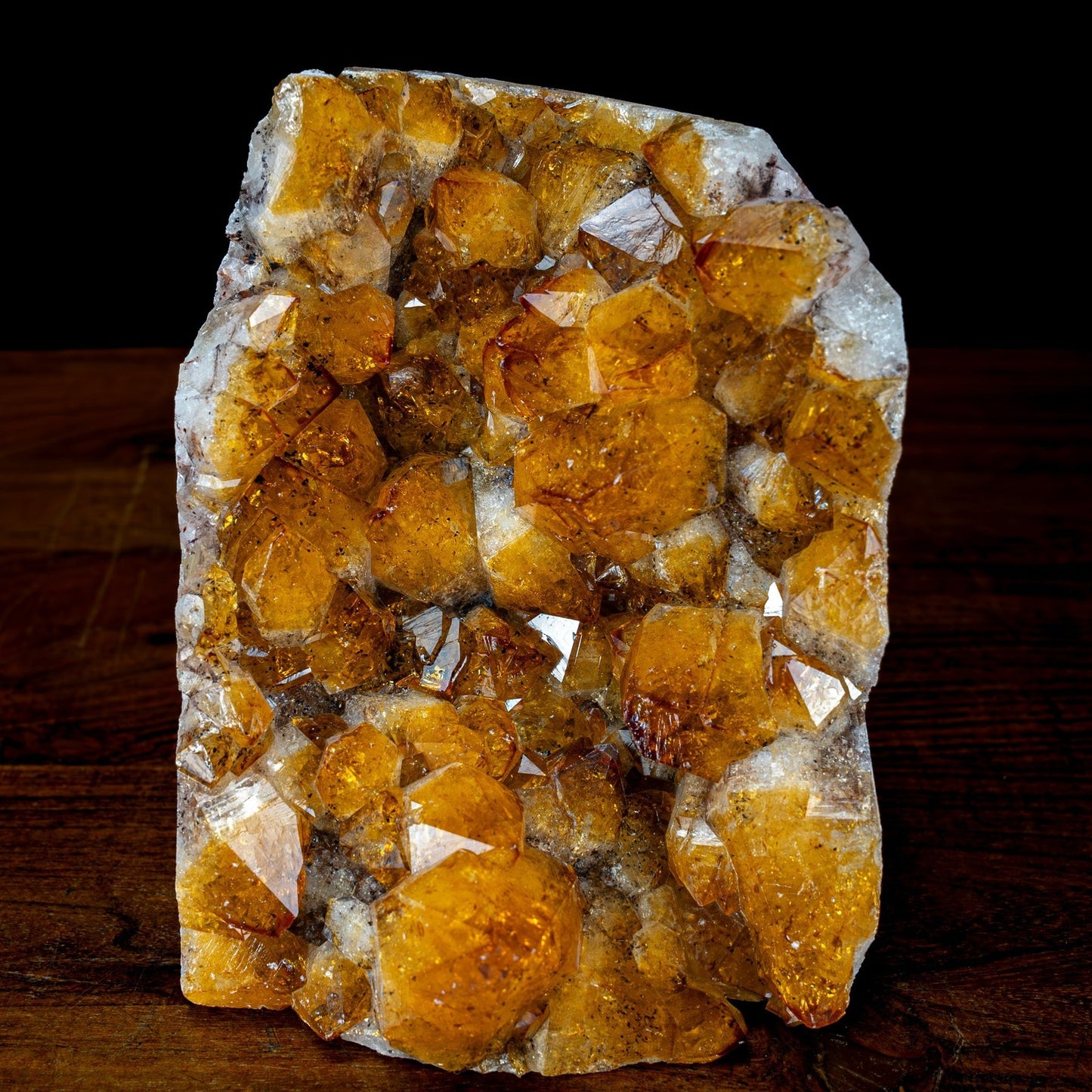 Eine erstaunliche Großer AAA++ Citrin-Quarz Druse aus Brasilien, die eine Vielzahl von Quarzkristallen von tieforanger Farbe zeigt.