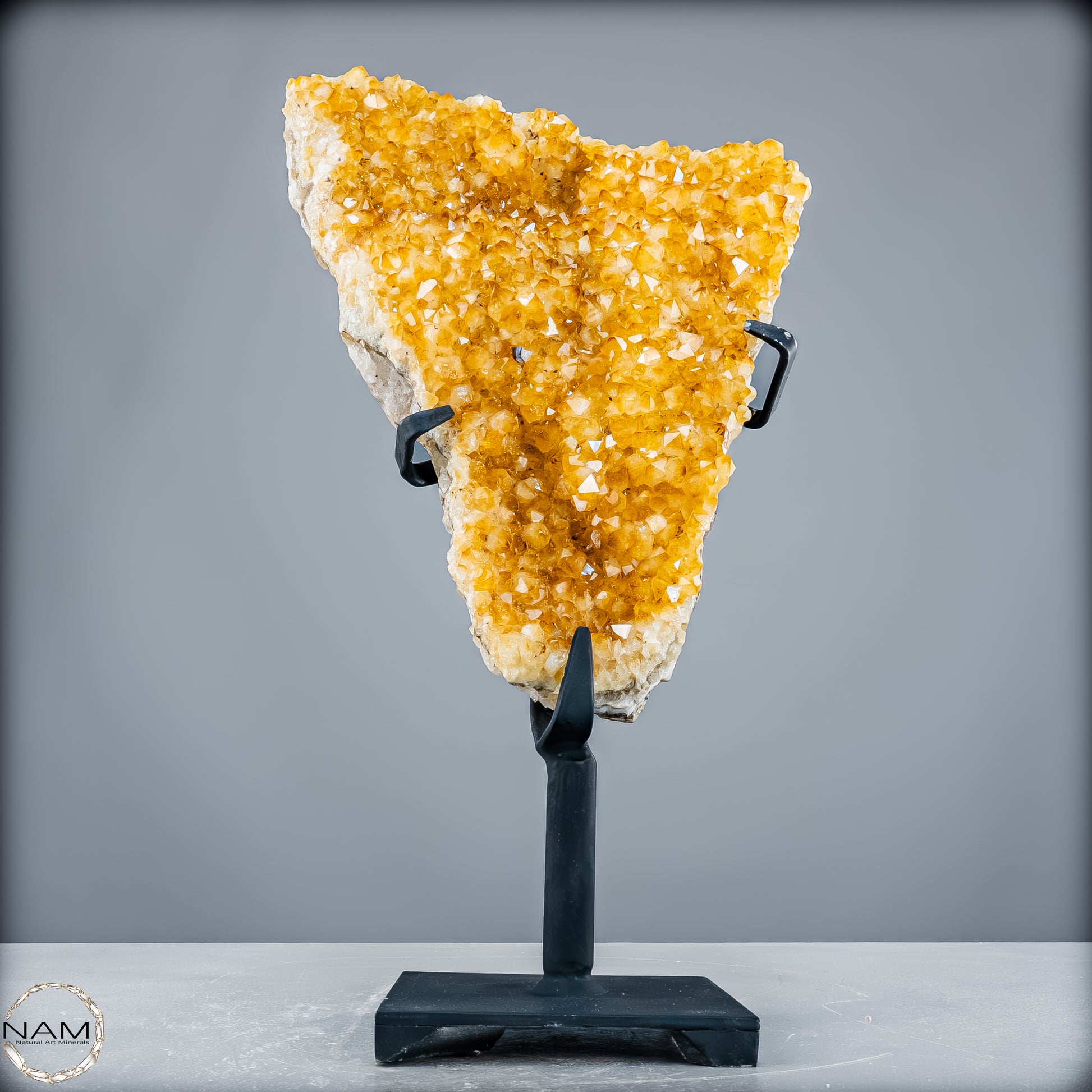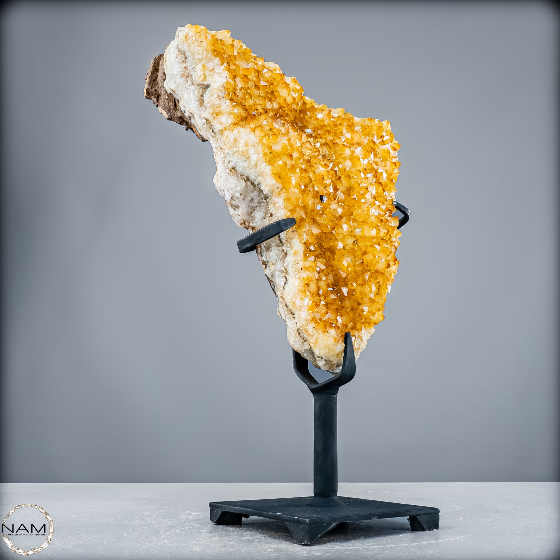 Die Druse ist sicher auf einem schlichten, schwarzen Metallständer montiert, der ihr eine schwebende, fast skulpturale Wirkung verleiht. Dadurch kommt die Kristallstruktur besonders gut zur Geltung und die Druse lässt sich hervorragend als dekoratives Einzelstück präsentieren. Der Kontrast zwischen dem warmen Citrin und dem dunklen Ständer unterstreicht die natürliche Schönheit des Minerals und sorgt für eine moderne, elegante Optik.