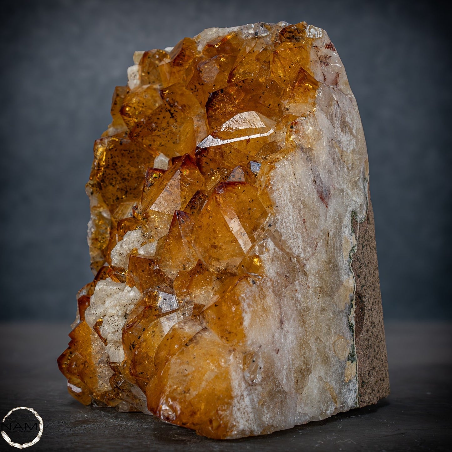 Eine erstaunliche Großer AAA++ Citrin-Quarz Druse aus Brasilien, die eine Vielzahl von Quarzkristallen von tieforanger Farbe zeigt.