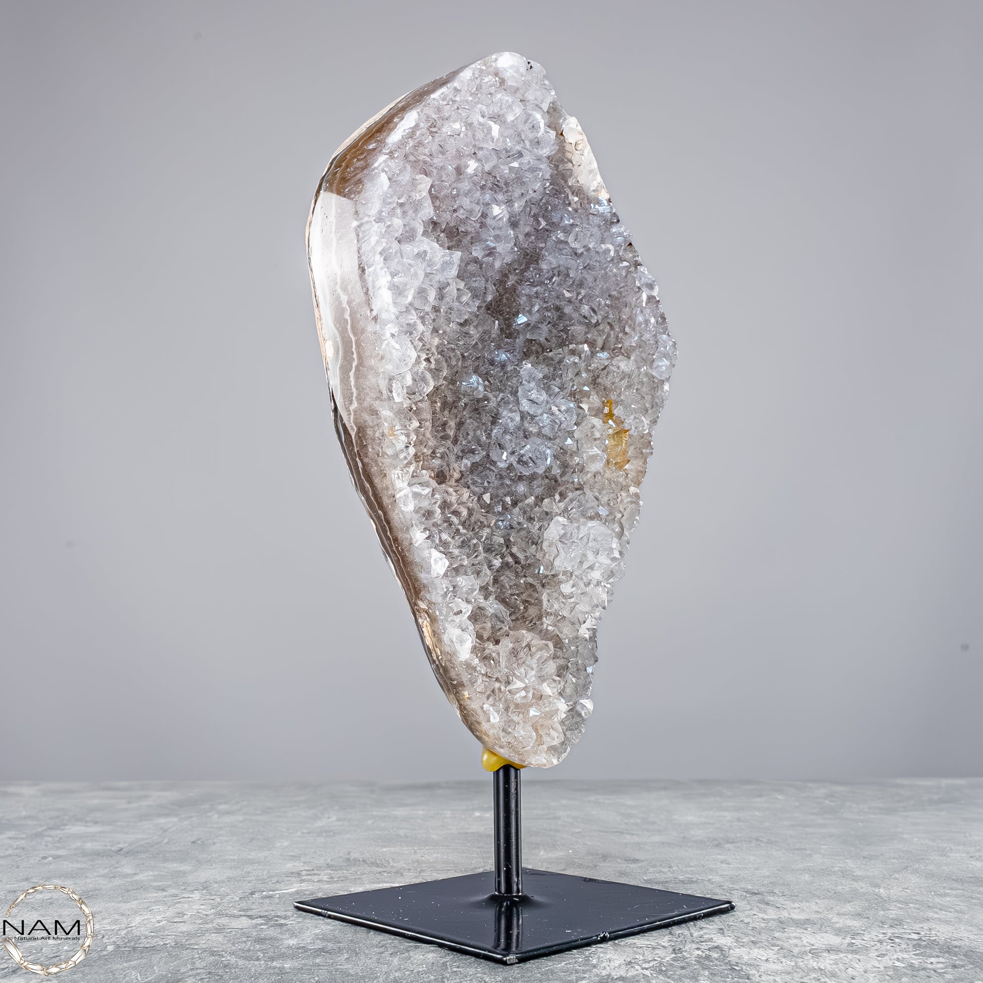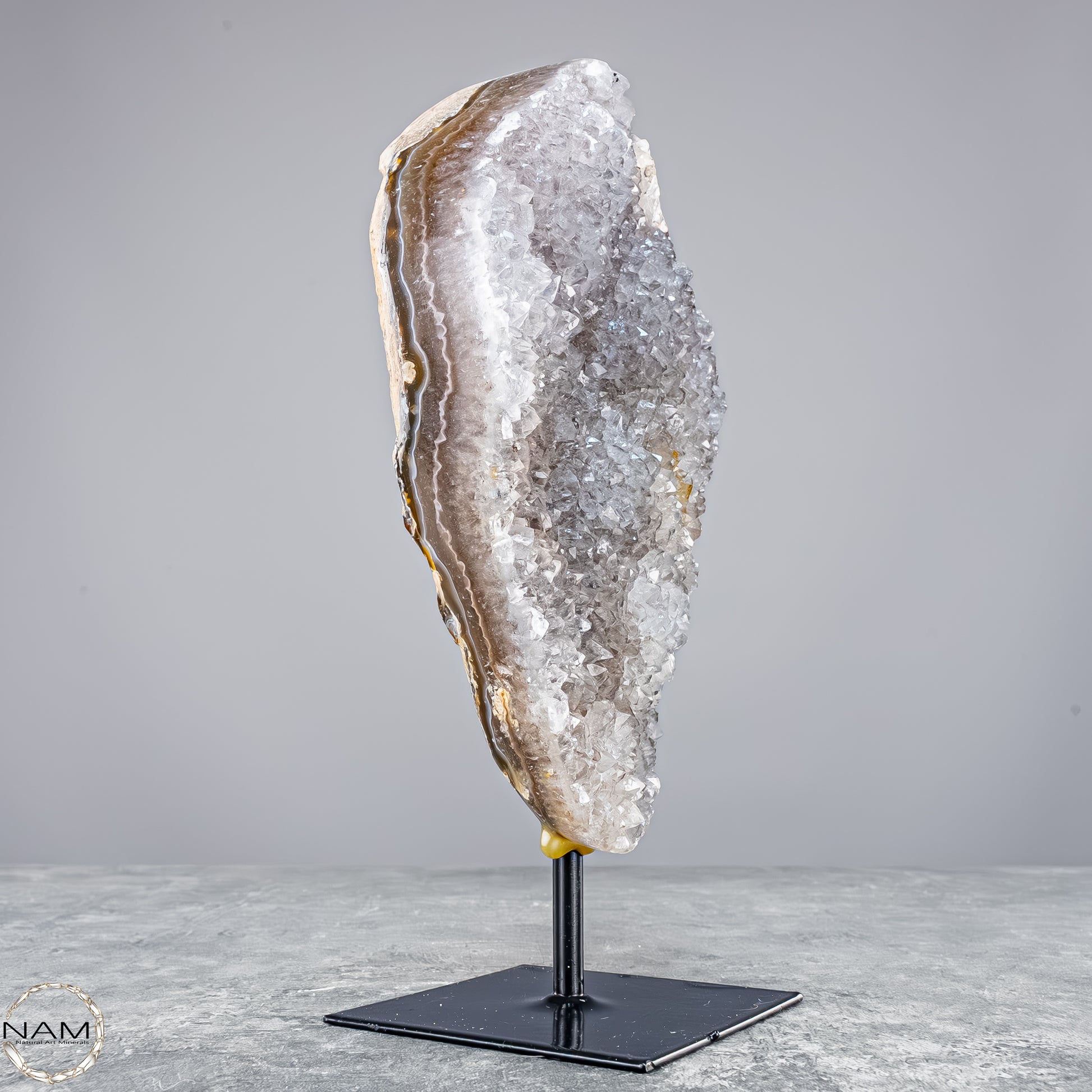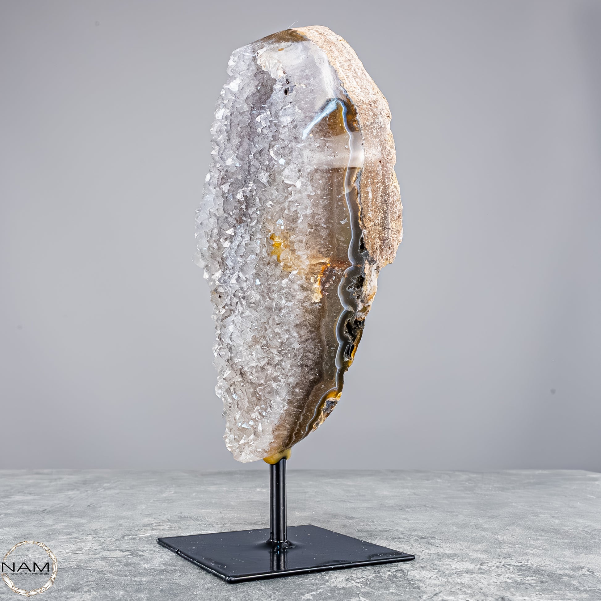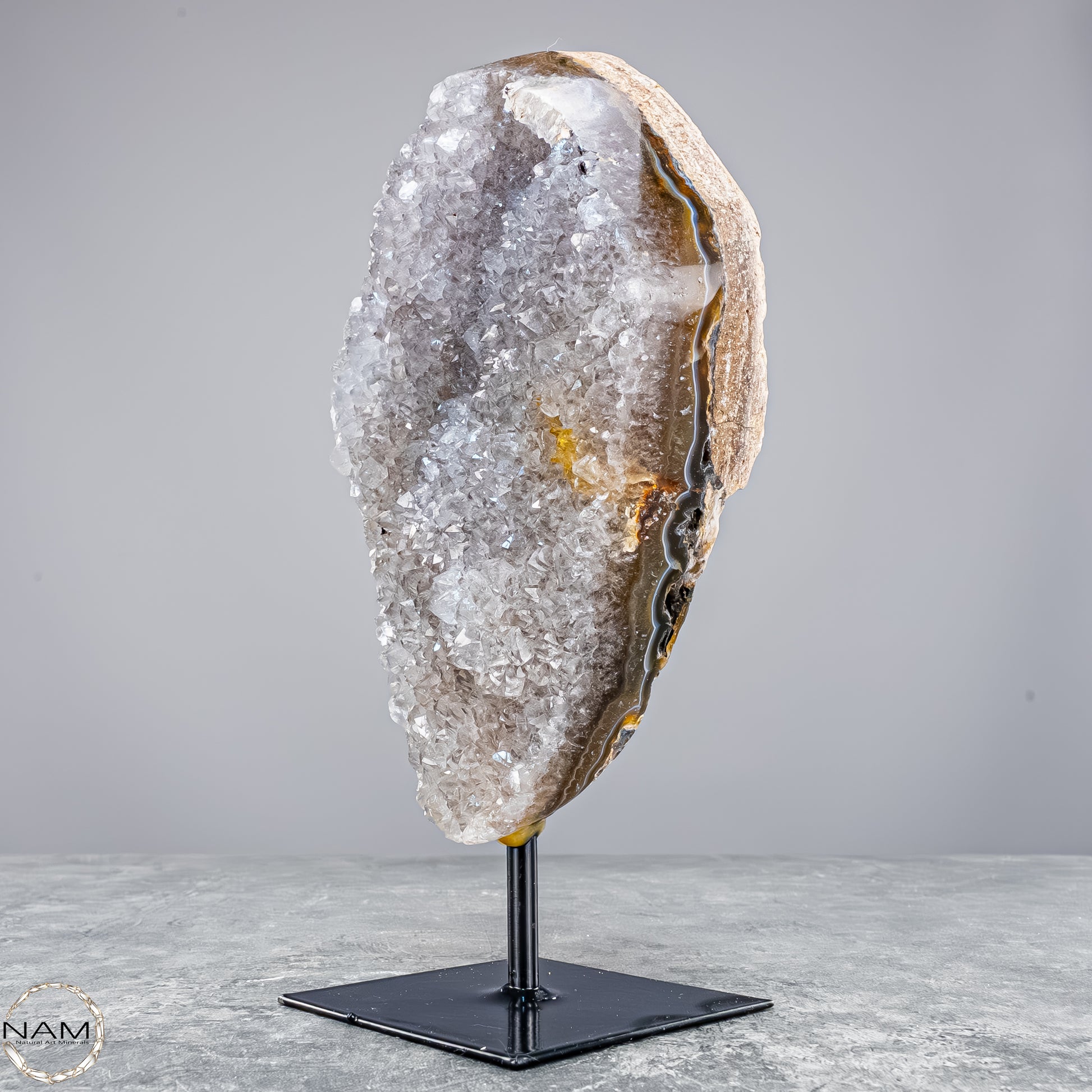 Auf seinem eleganten Metallständer präsentiert sich dieses Stück wie ein Kunstobjekt: modern, kraftvoll und zugleich tief verbunden mit der Natur. Ob als spirituelles Zentrum, Dekorationsobjekt oder Sammlerstück – dieser Achat mit Druse ist ein Symbol für die Schönheit, die im Inneren verborgen liegt.