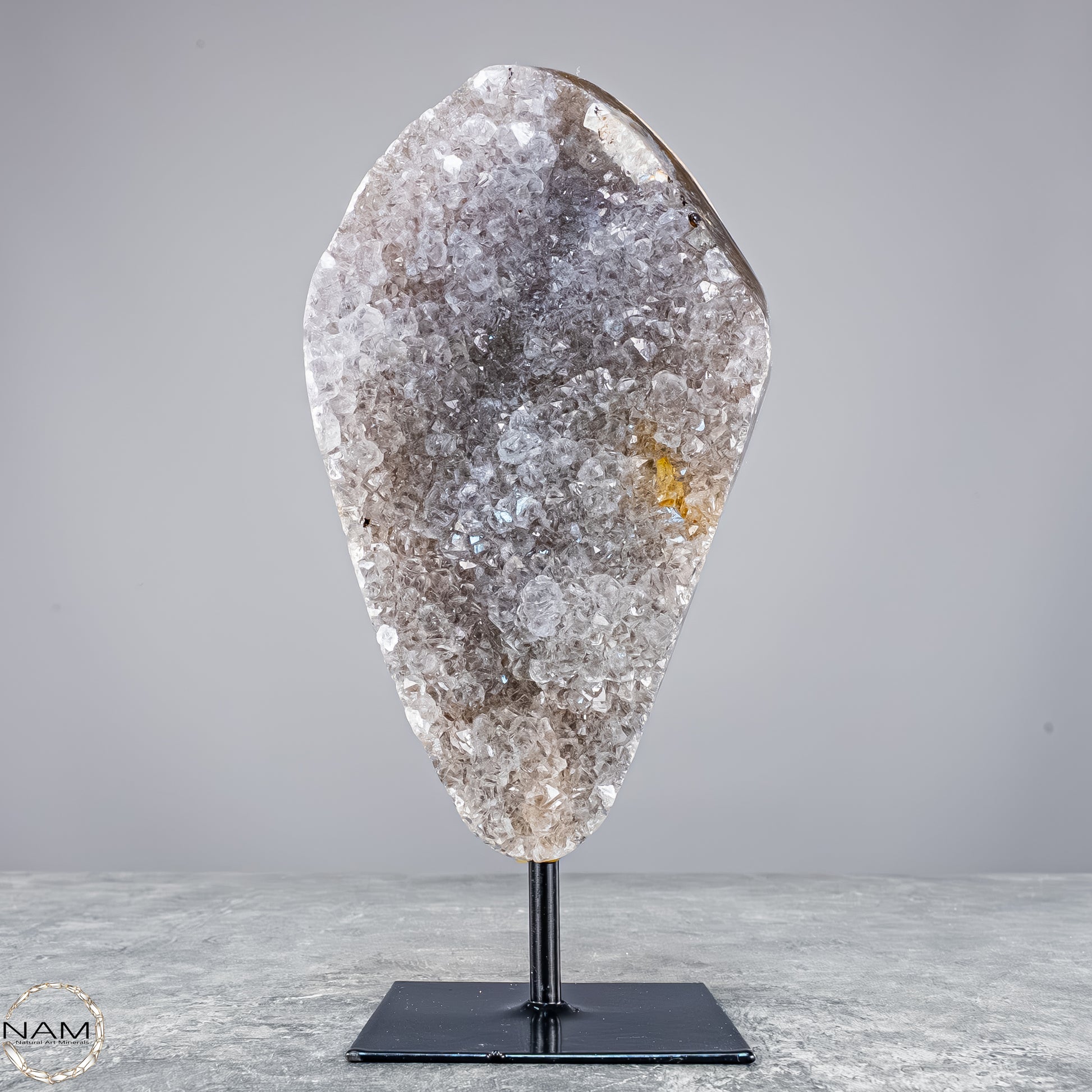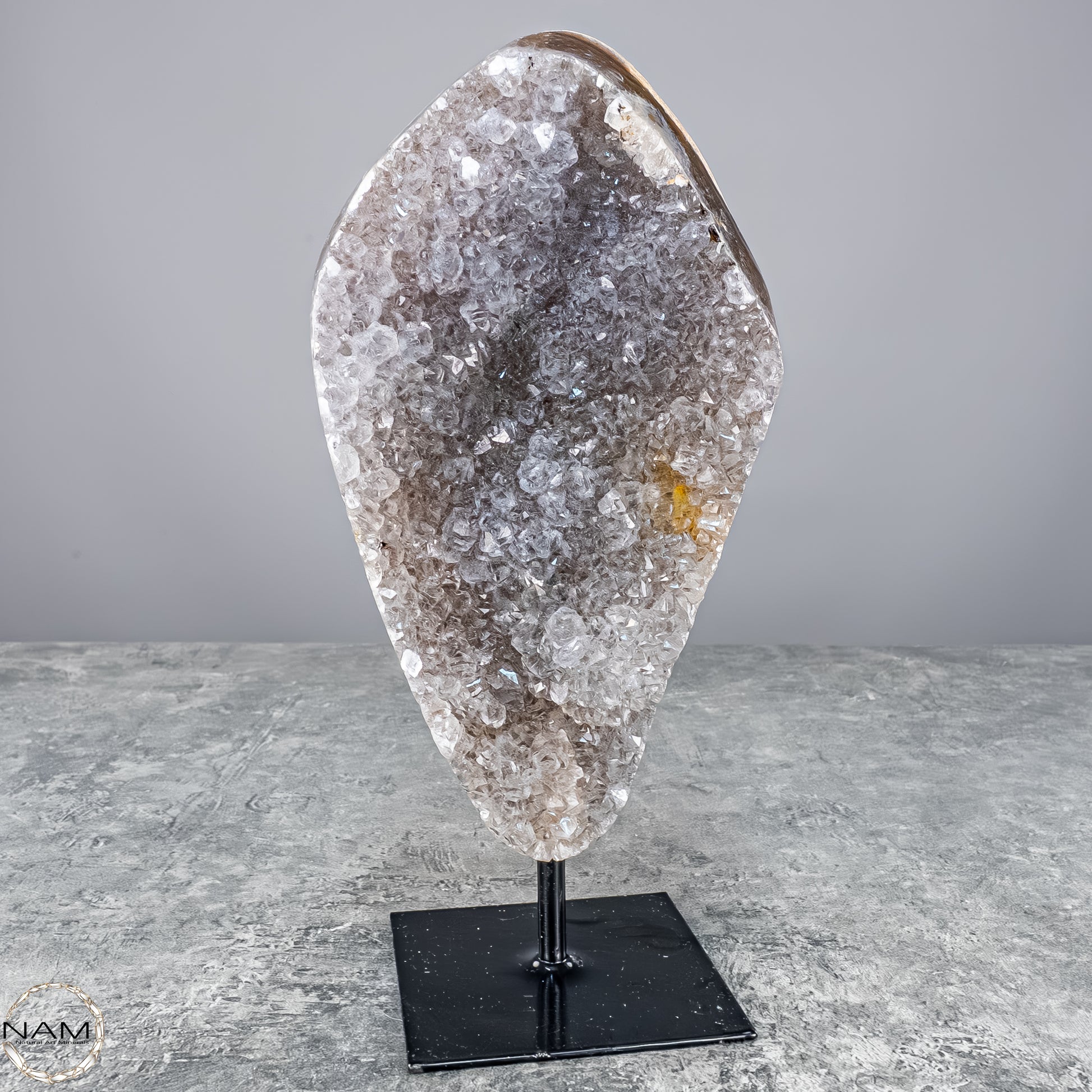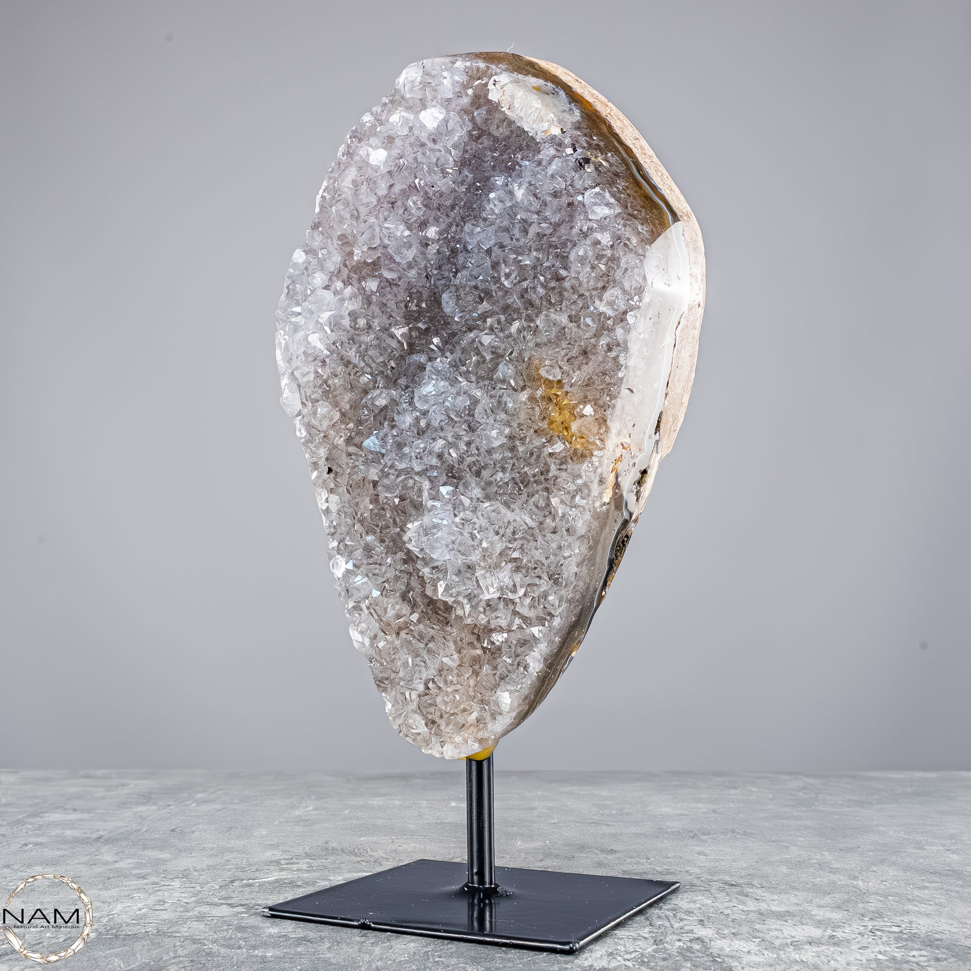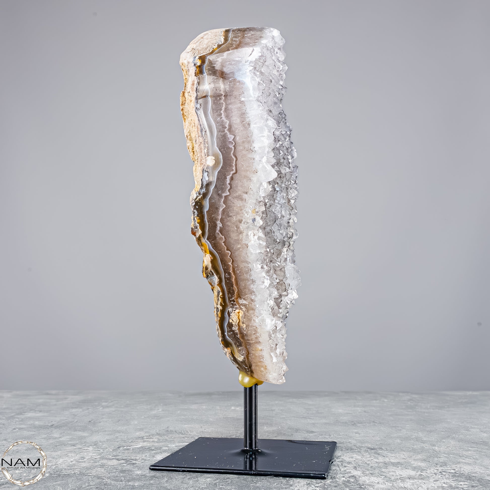 Auf seinem eleganten Metallständer präsentiert sich dieses Stück wie ein Kunstobjekt: modern, kraftvoll und zugleich tief verbunden mit der Natur. Ob als spirituelles Zentrum, Dekorationsobjekt oder Sammlerstück – dieser Achat mit Druse ist ein Symbol für die Schönheit, die im Inneren verborgen liegt.