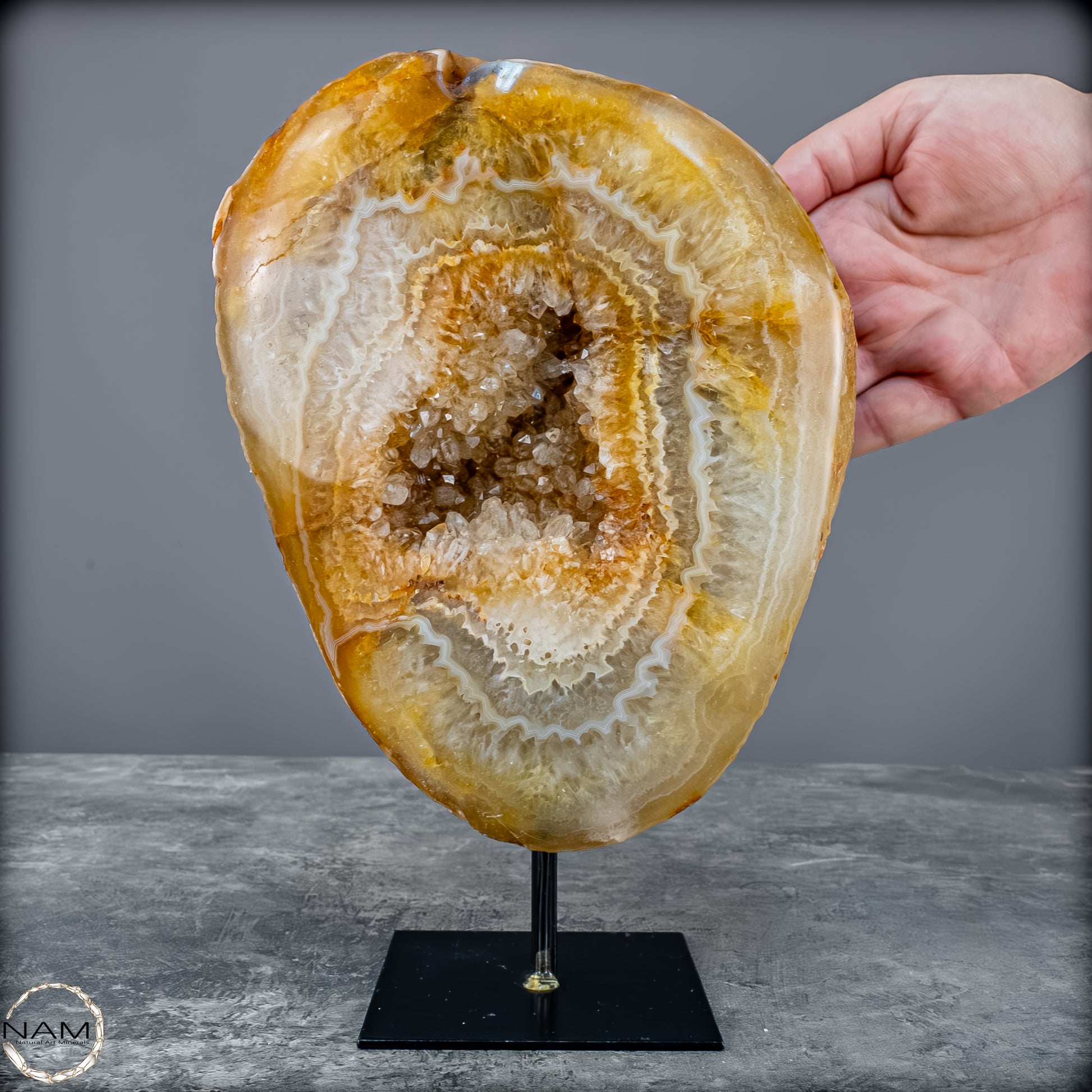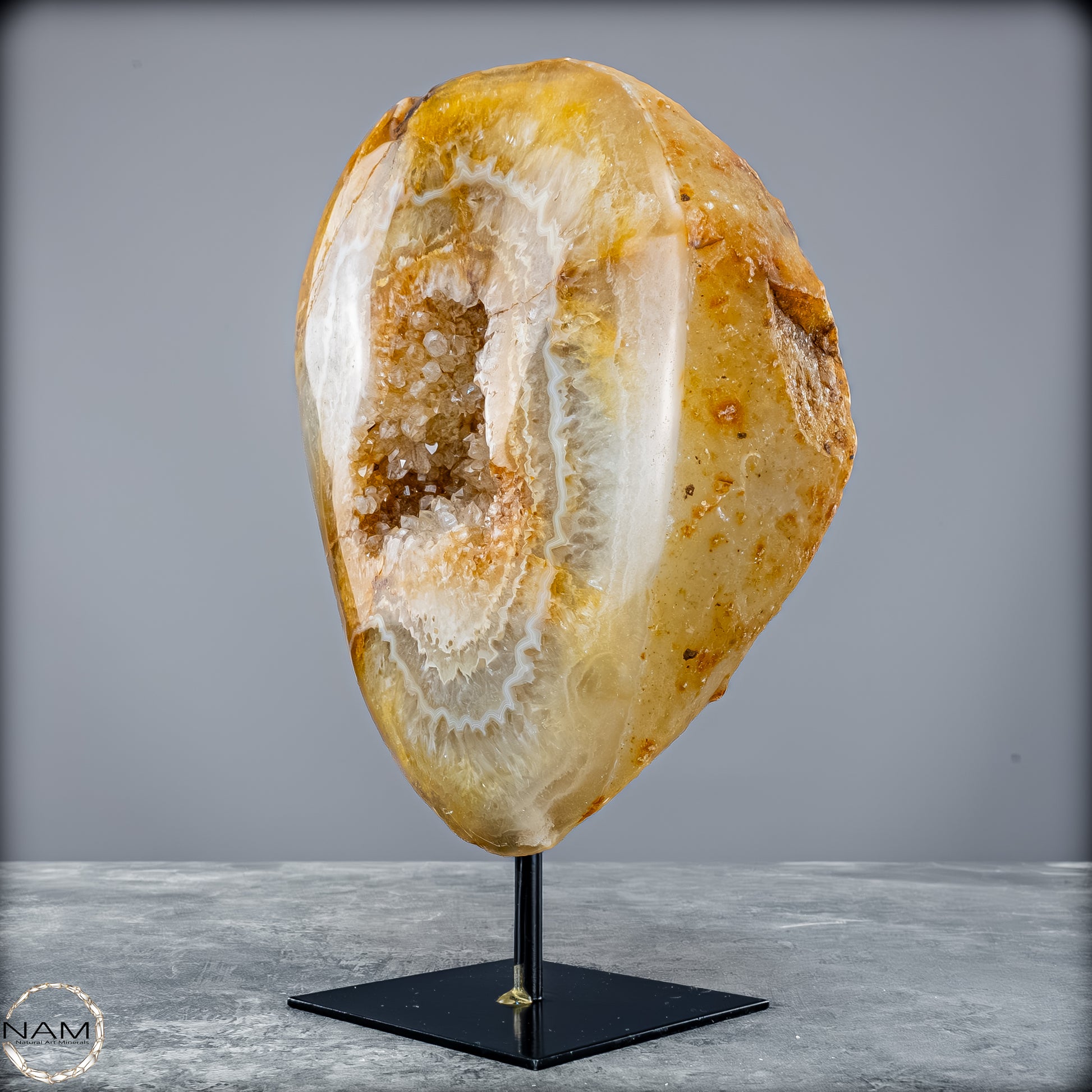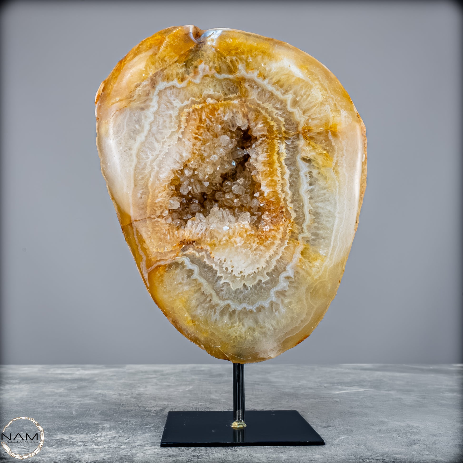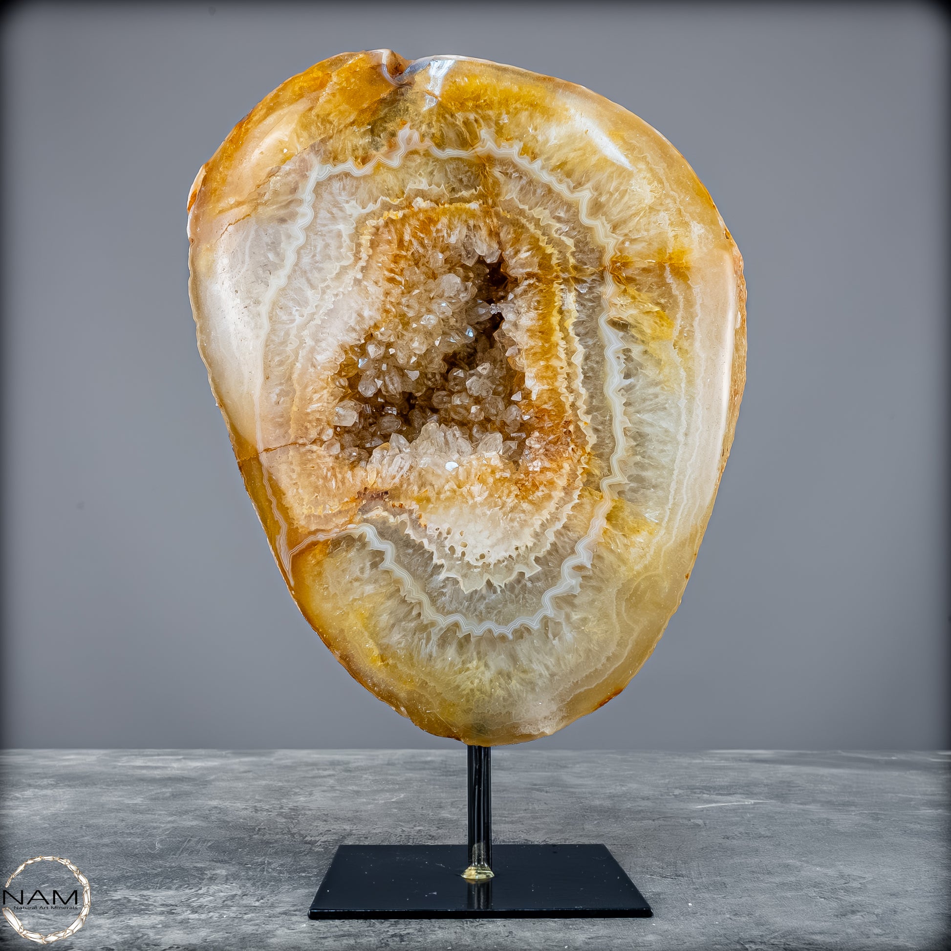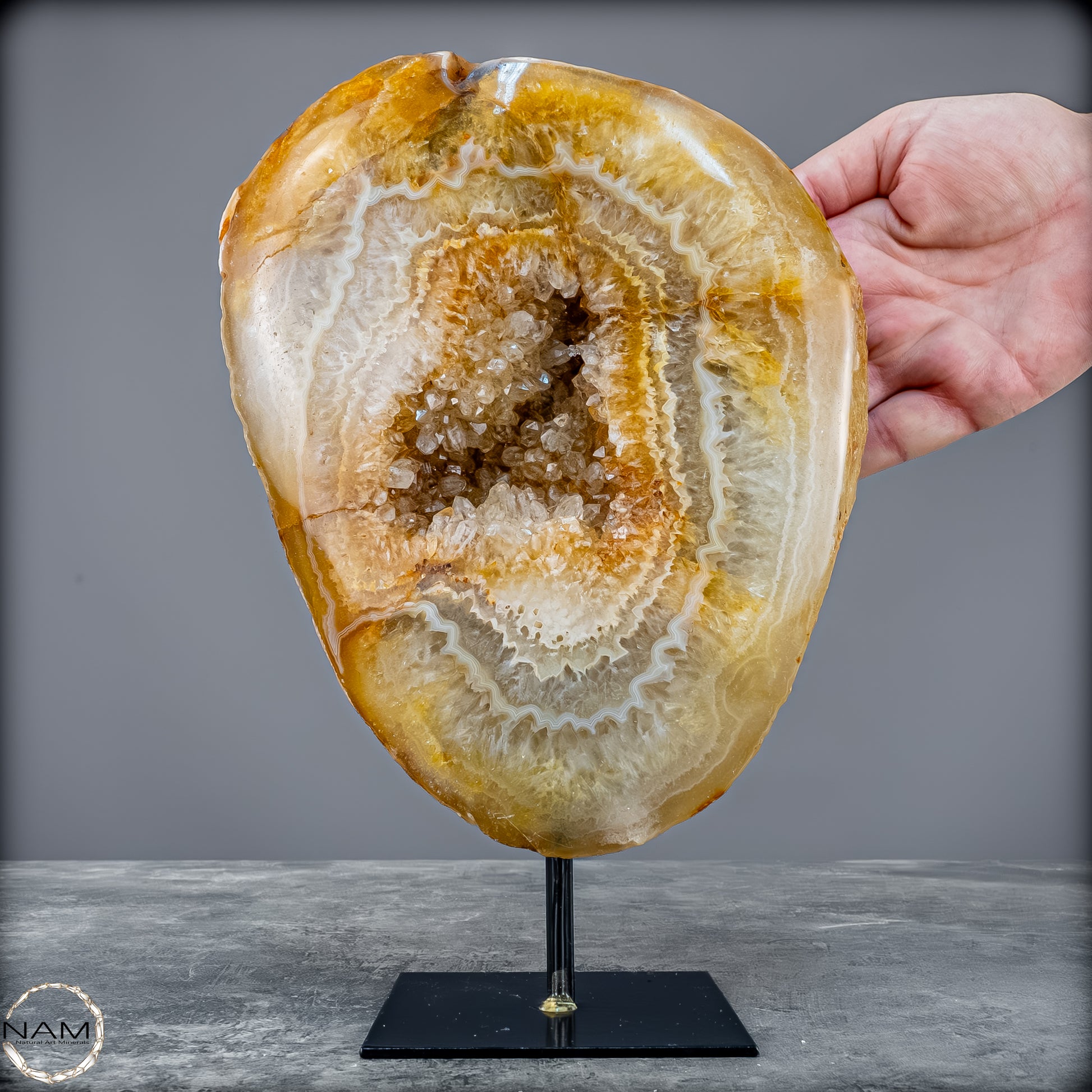 Diese exquisite Achat-Druse auf Ständer ist ein wahres Meisterwerk der Natur – kunstvoll geformt und reich an faszinierenden Details. Im Inneren offenbart sich ein kristalliner Kern aus funkelnden Quarzkristallen, die in warmen Gold-, Bernstein- und Honigtönen schimmern. Umrahmt wird die Druse von sanft gebänderten Achatstrukturen, deren cremige, graue und braune Nuancen ein harmonisches Farbspiel erzeugen.