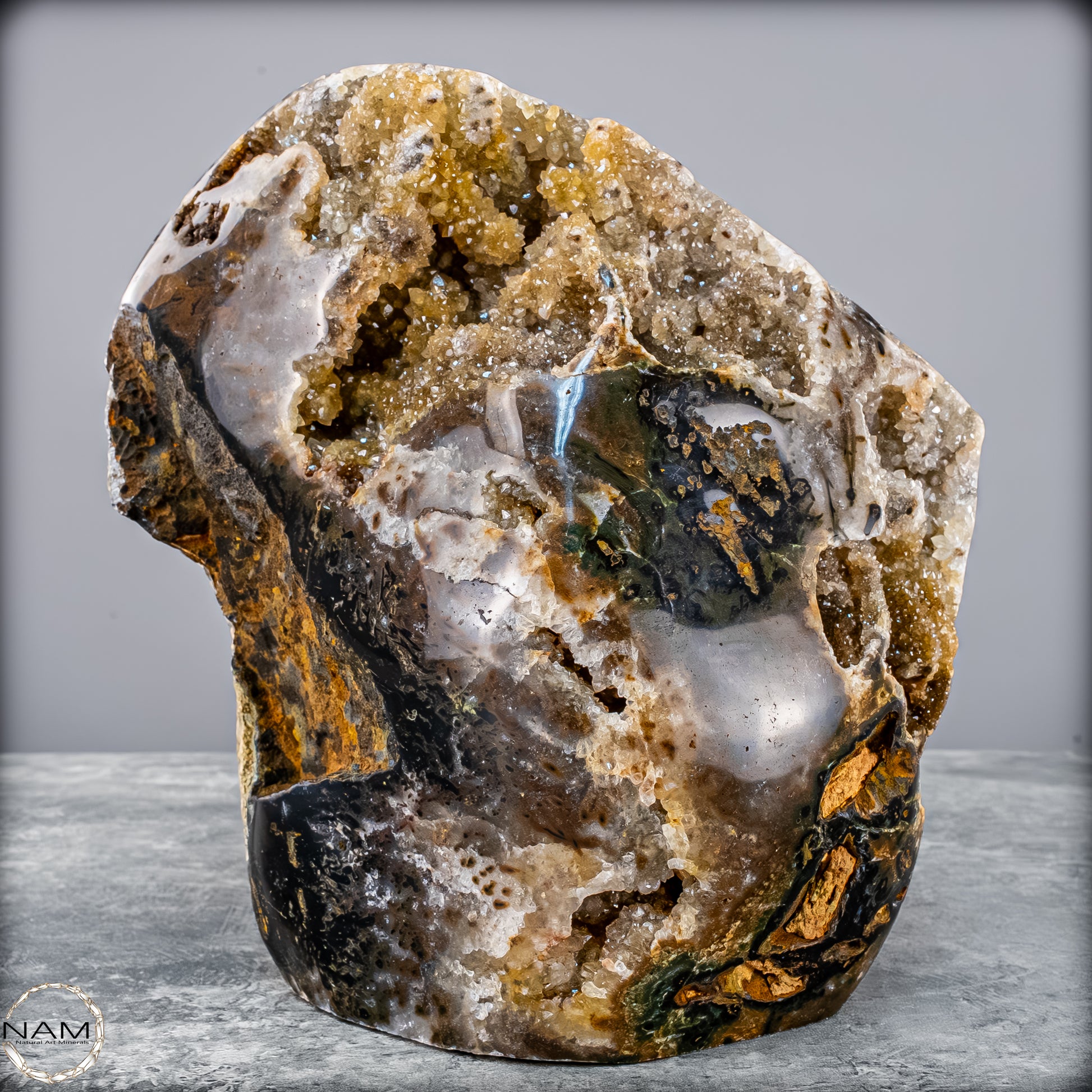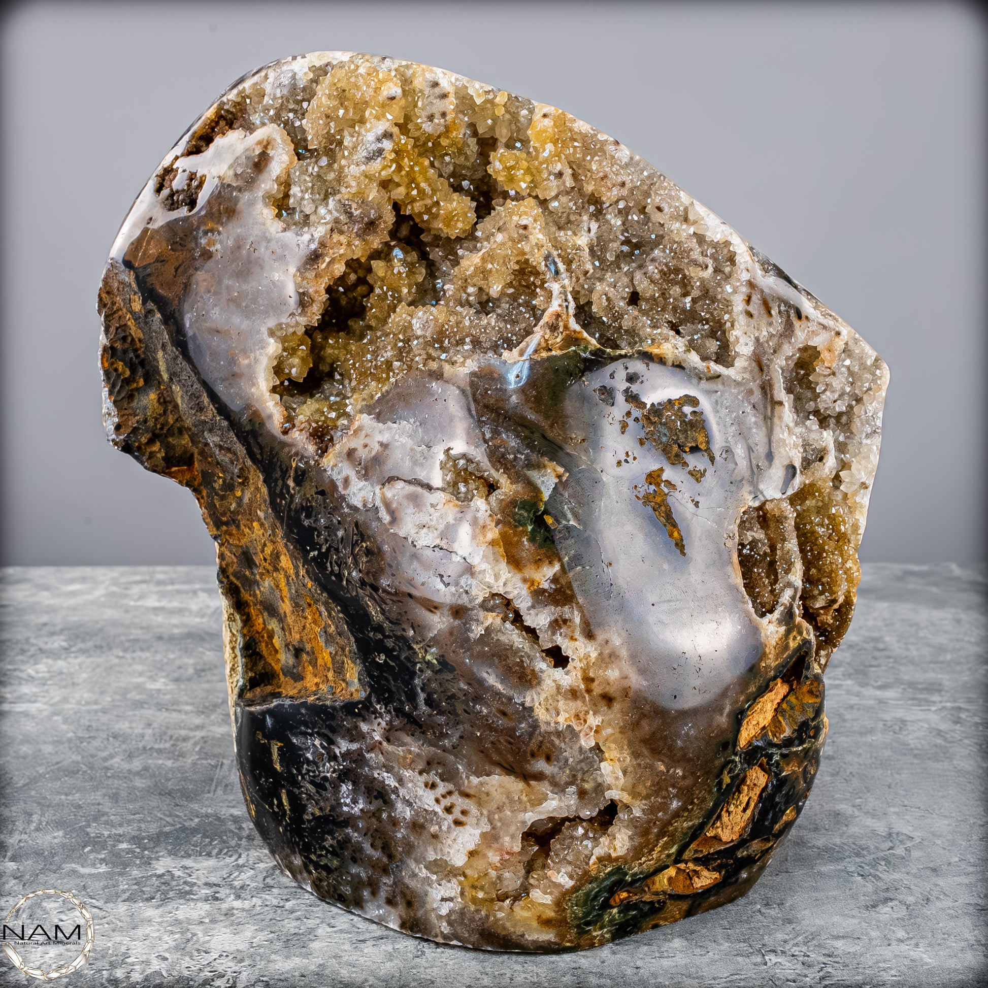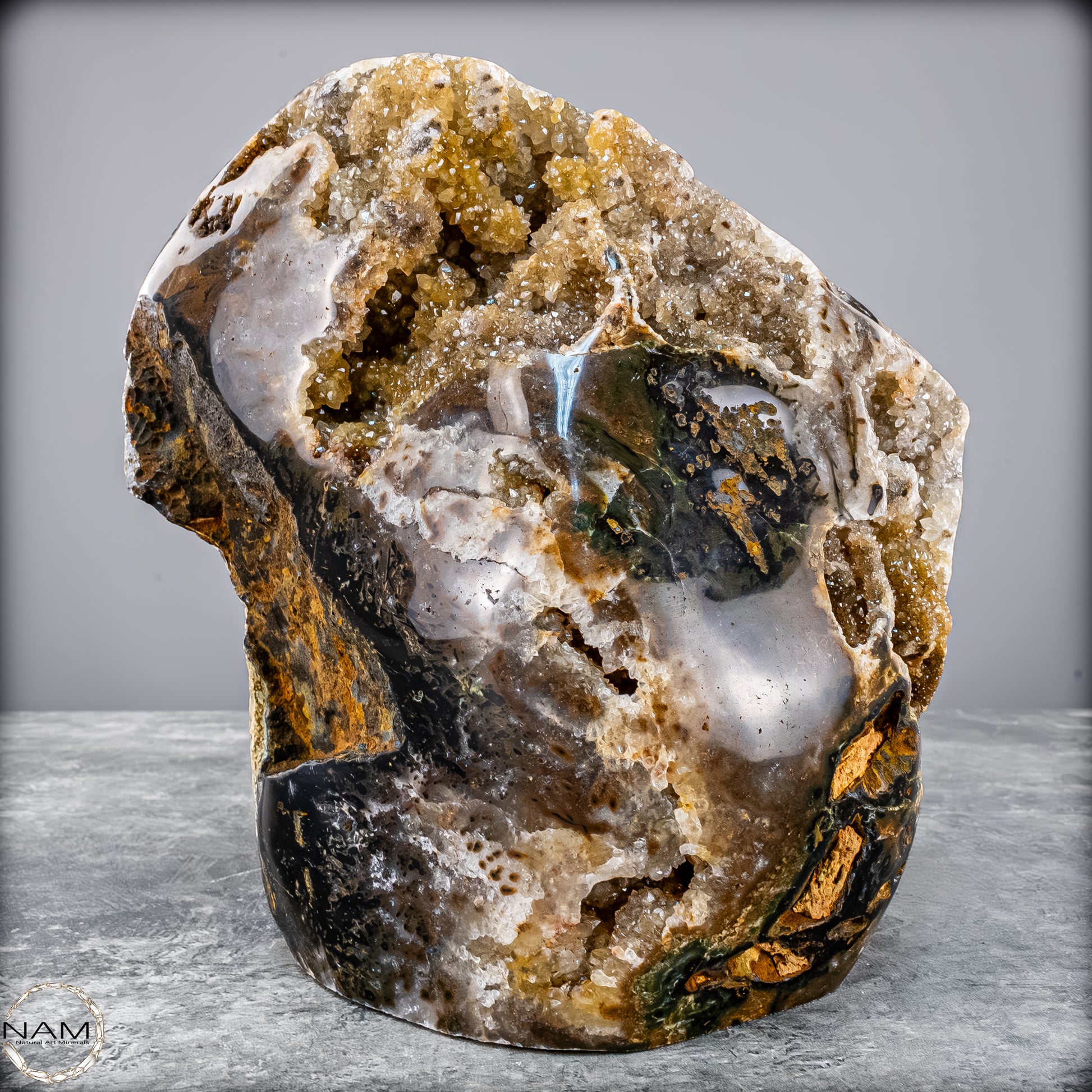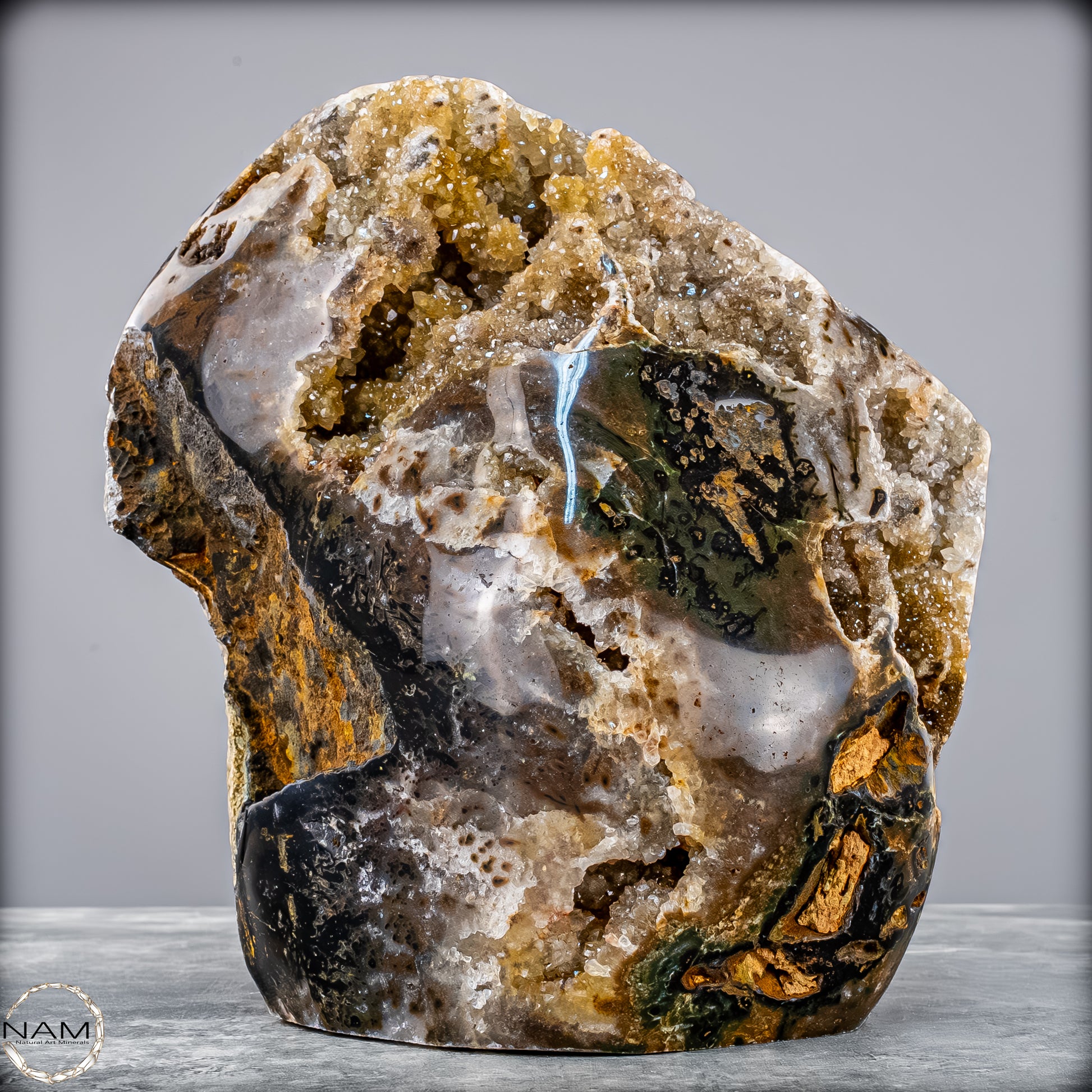 Diese beeindruckende Achat-Freiform mit Druse bringt die rohe Schönheit der Natur in ihrer reinsten Form zum Ausdruck. Mit einem Gewicht von 4,8 Kilogramm vereint sie harmonisch erdige Brauntöne, sanftes Grau, Moosgrün und goldene Akzente zu einem einzigartigen Naturkunstwerk.