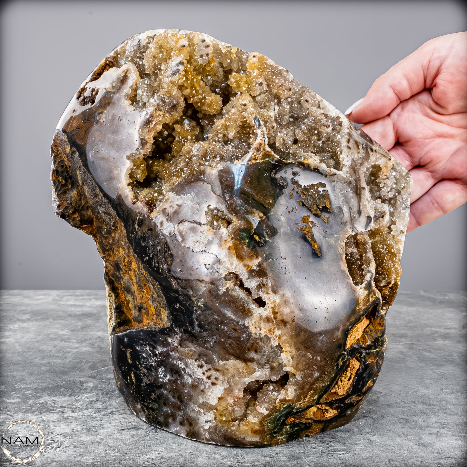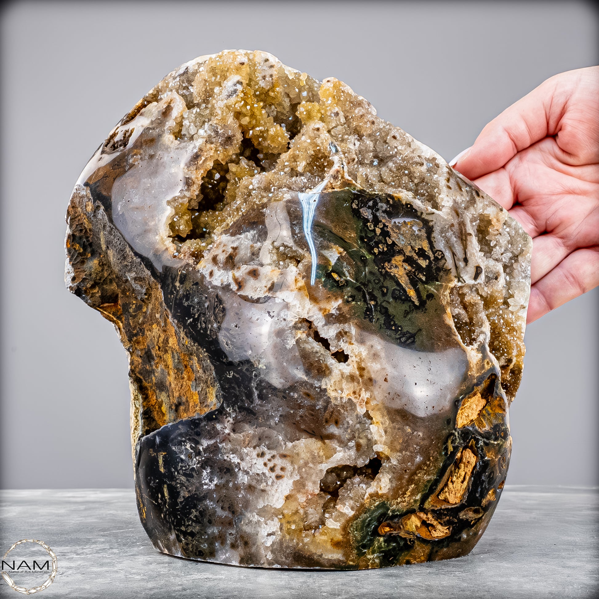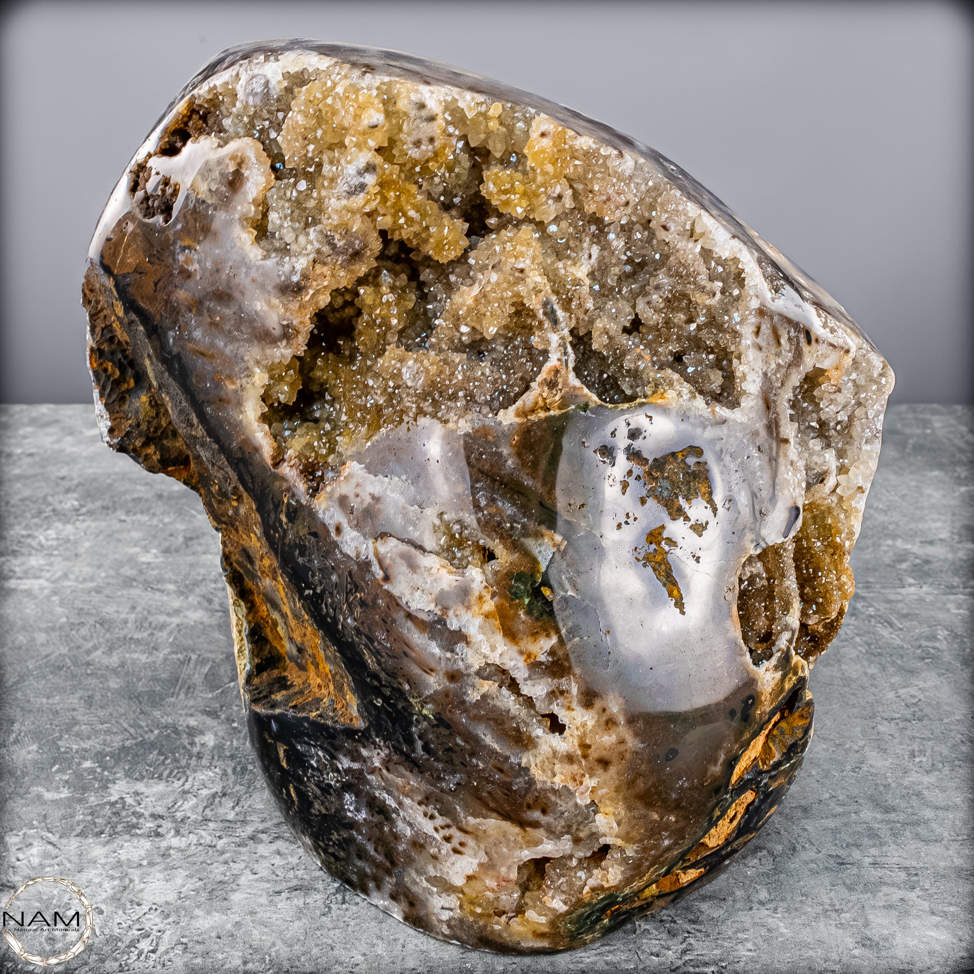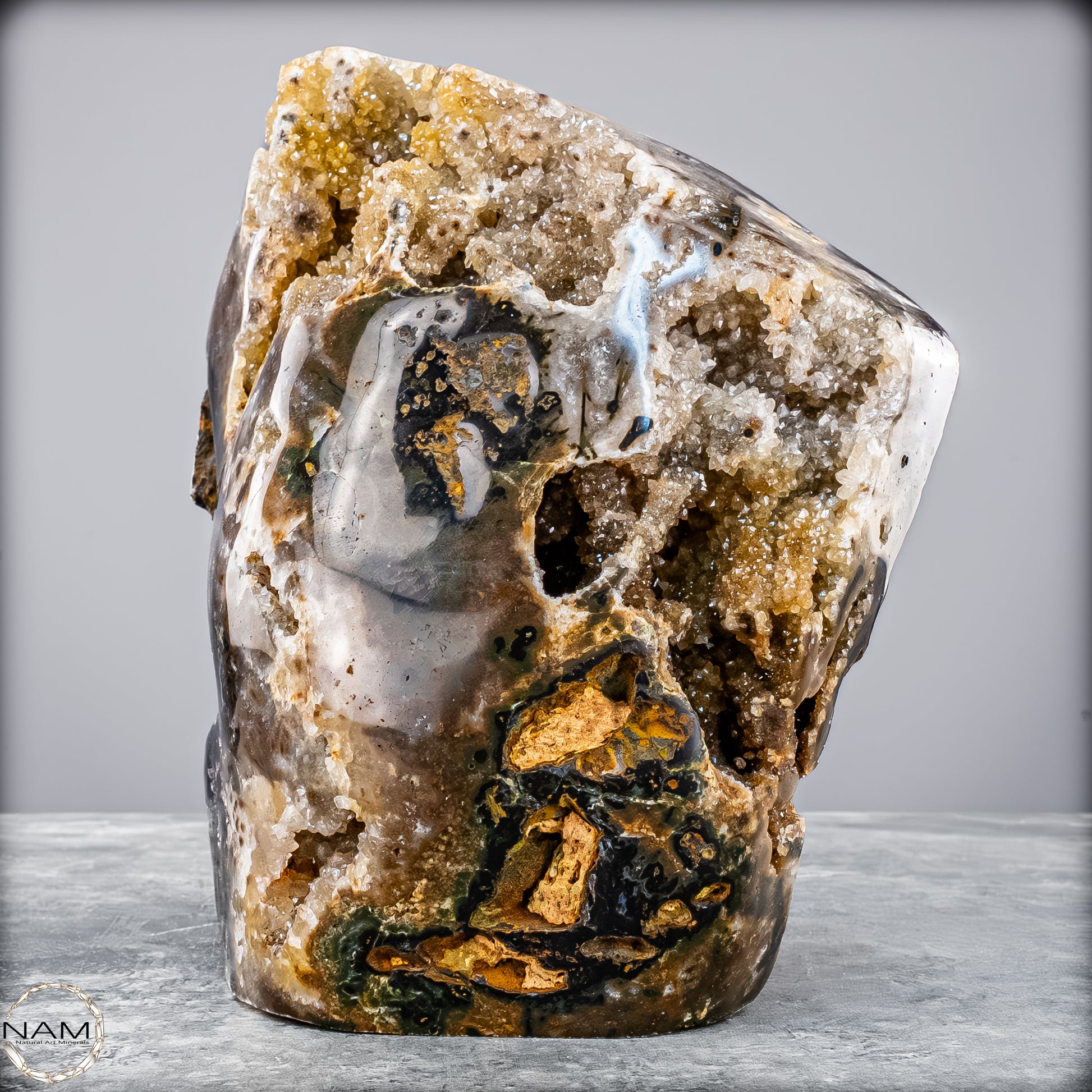 Diese beeindruckende Achat-Freiform mit Druse bringt die rohe Schönheit der Natur in ihrer reinsten Form zum Ausdruck. Mit einem Gewicht von 4,8 Kilogramm vereint sie harmonisch erdige Brauntöne, sanftes Grau, Moosgrün und goldene Akzente zu einem einzigartigen Naturkunstwerk.