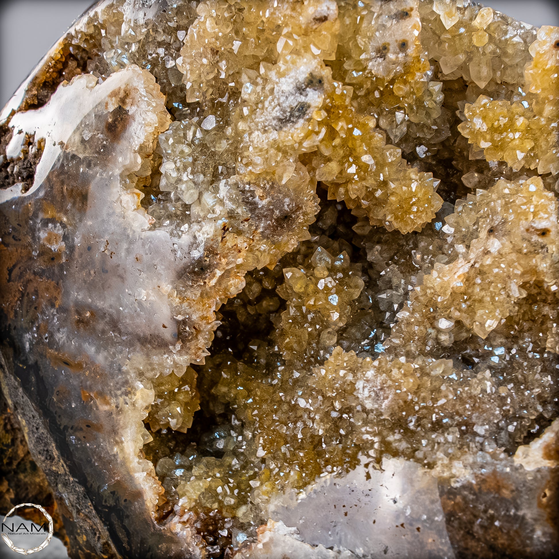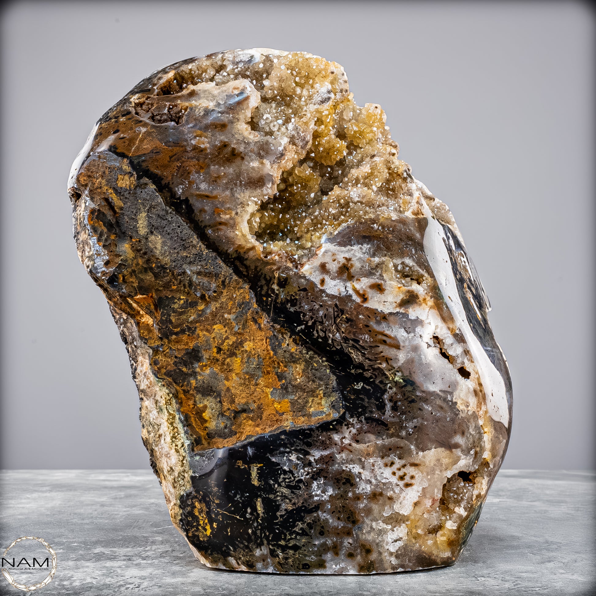Im oberen Bereich öffnet sich eine funkelnde Druse aus feinen Kristallen, die im Licht glitzern und dem Stein Tiefe und Lebendigkeit verleihen. Die polierte Vorderseite hebt die farblichen Schichten und Strukturen des Achats hervor, während die natürliche Rückseite seine ursprüngliche Erdverbundenheit bewahrt.