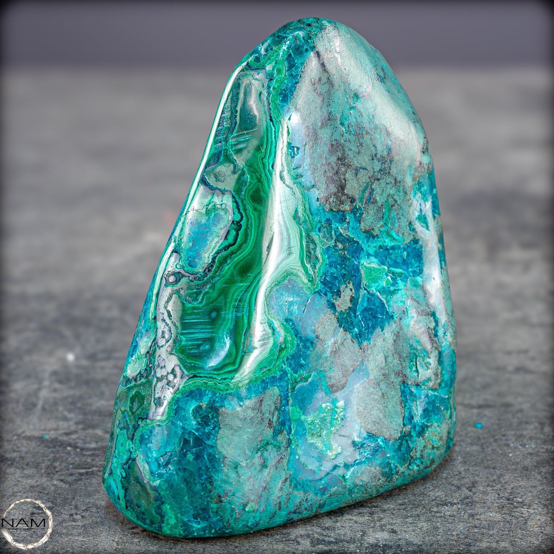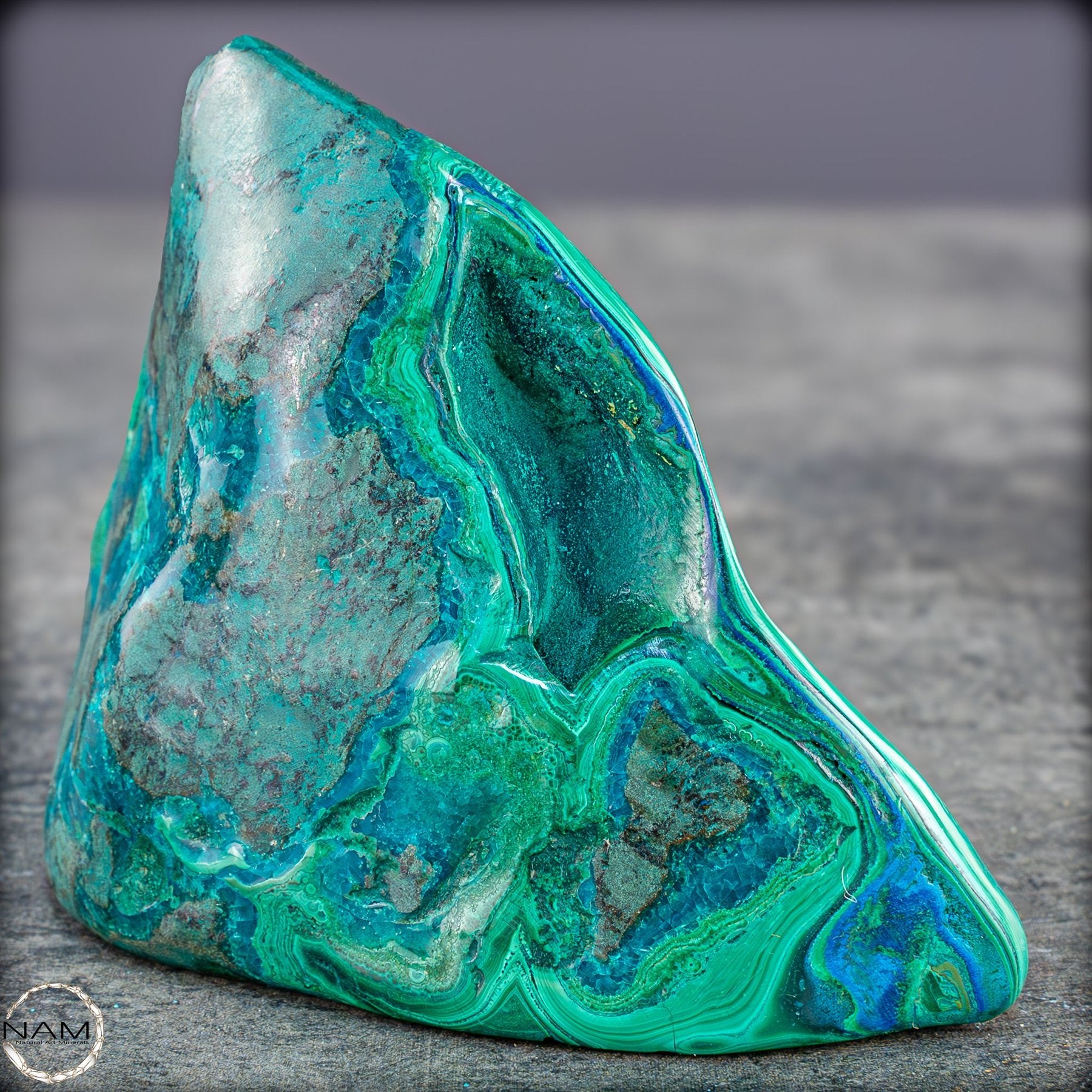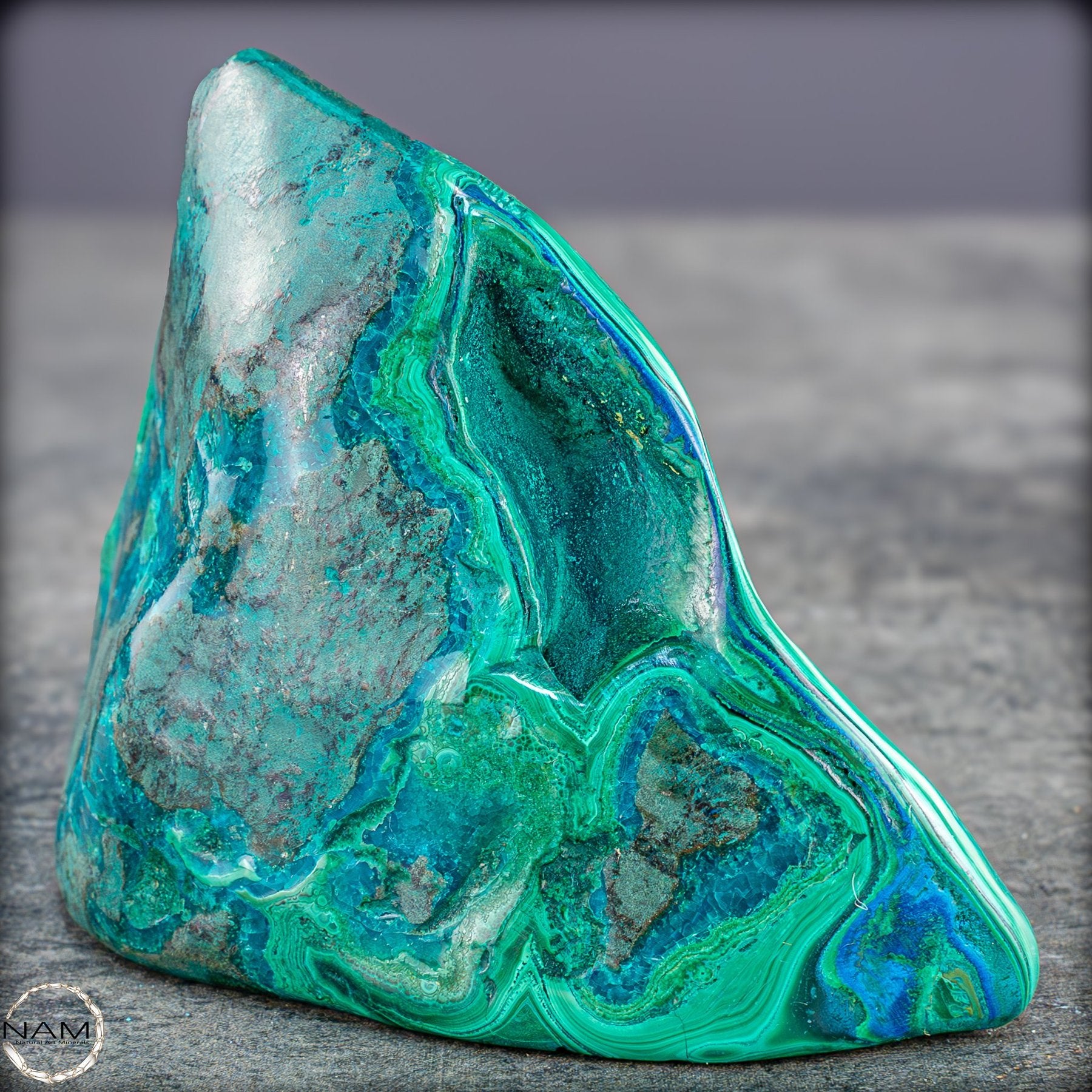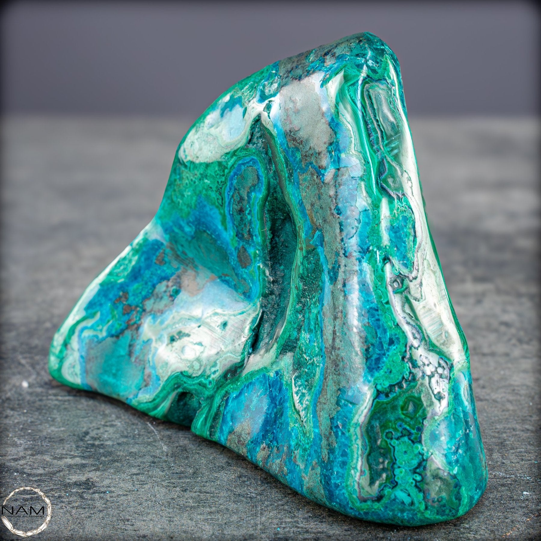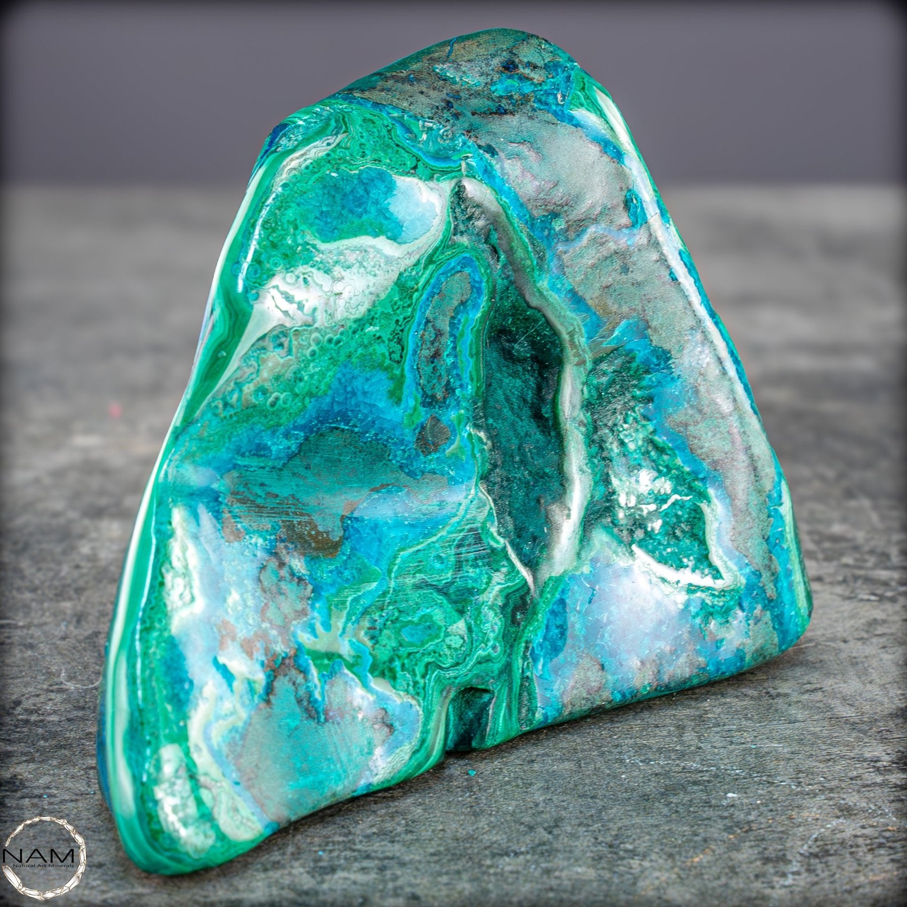 Dieses außergewöhnliche Stück besteht aus botryoidalem Malachit in Kombination mit Chrysocolla. Der Malachit zeigt seine charakteristische, blasenartige Oberfläche mit tiefen Grüntönen, die in faszinierenden Mustern angeordnet sind. In Verbindung mit dem leuchtend blauen Chrysocolla ergibt sich eine kontrastreiche und lebendige Farbkomposition, die diese Formation zu einem visuellen Erlebnis macht. Die glatte, wachsartige Oberfläche des Malachits kontrastiert mit den texturierten Bereichen, in denen Chrysocolla durchscheint.