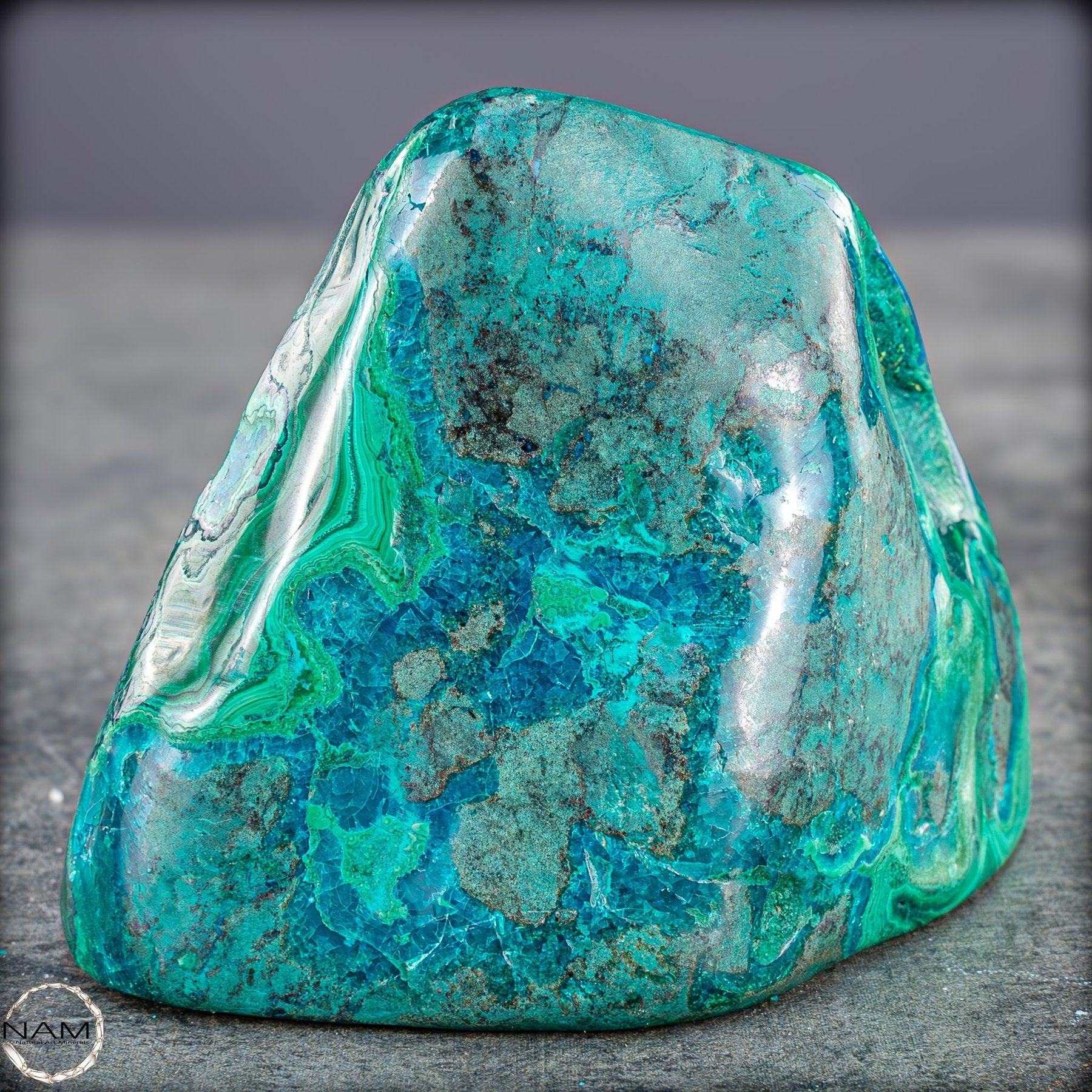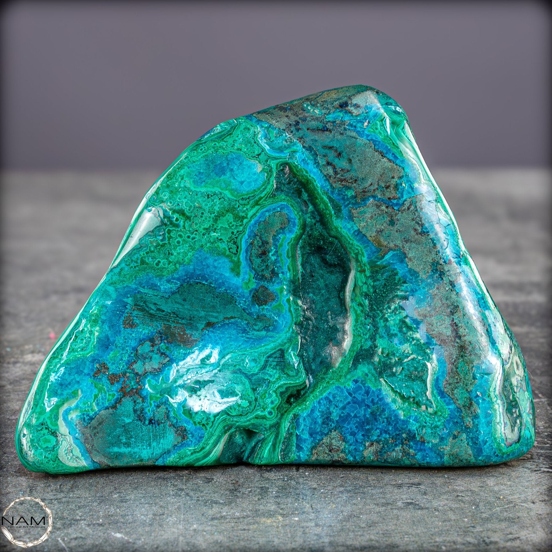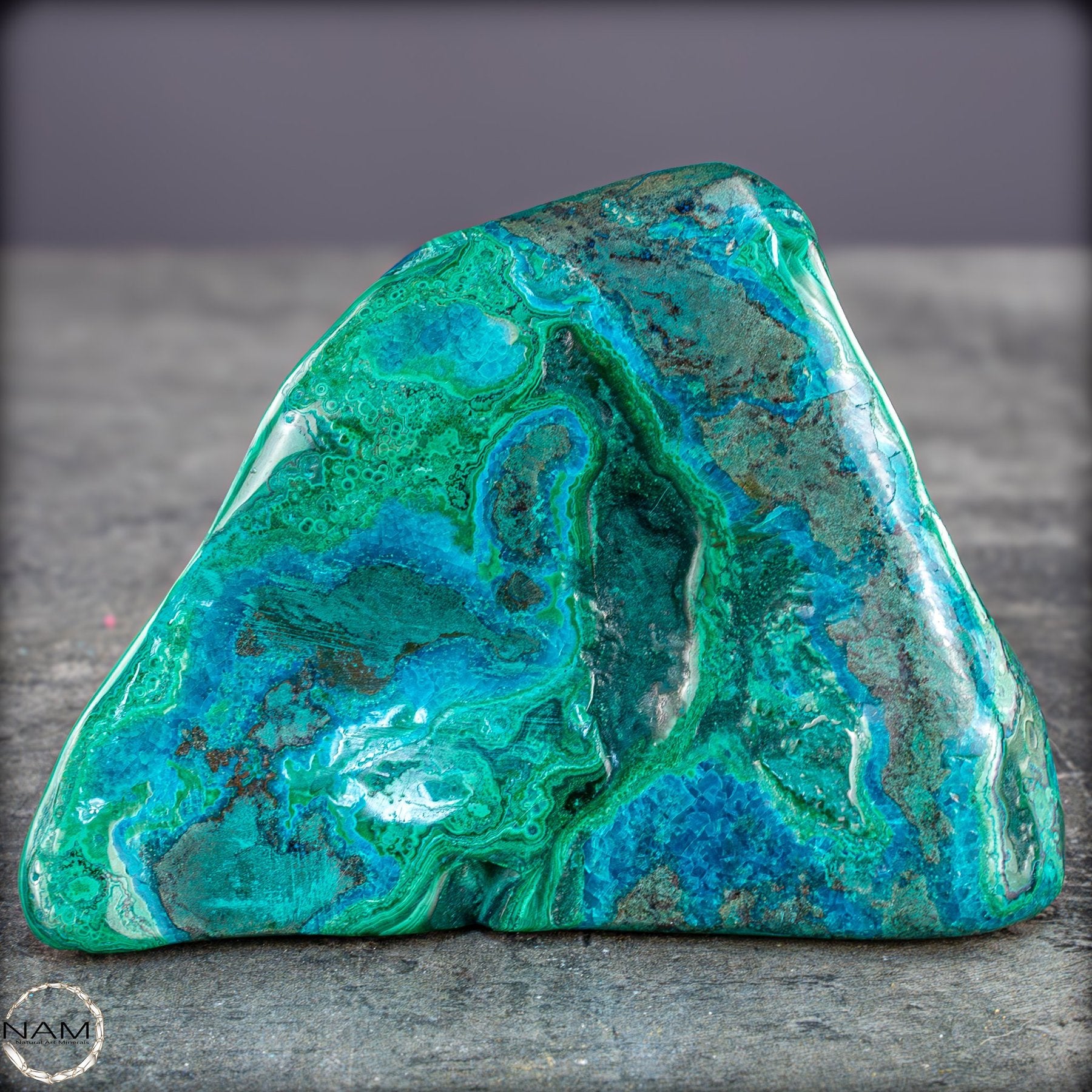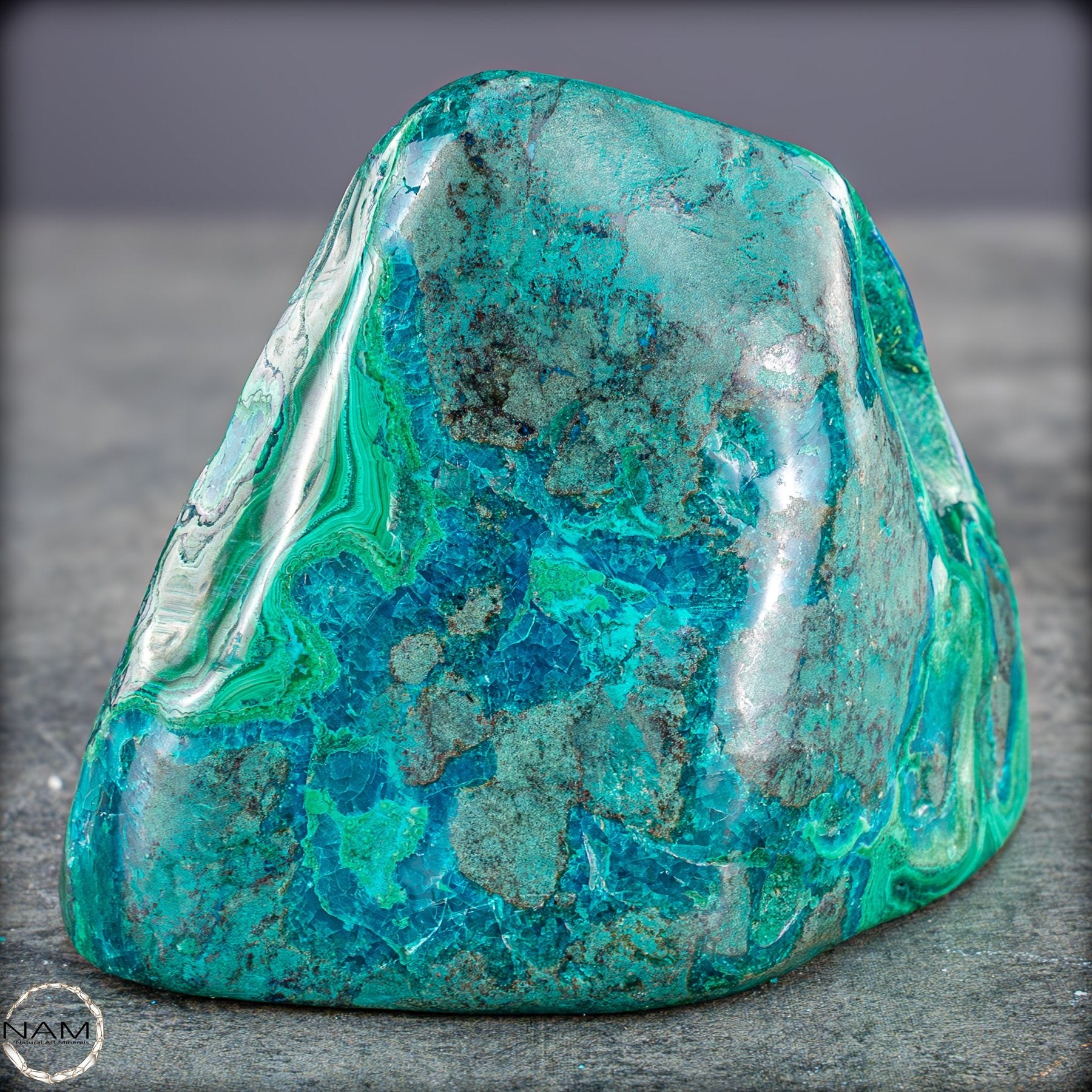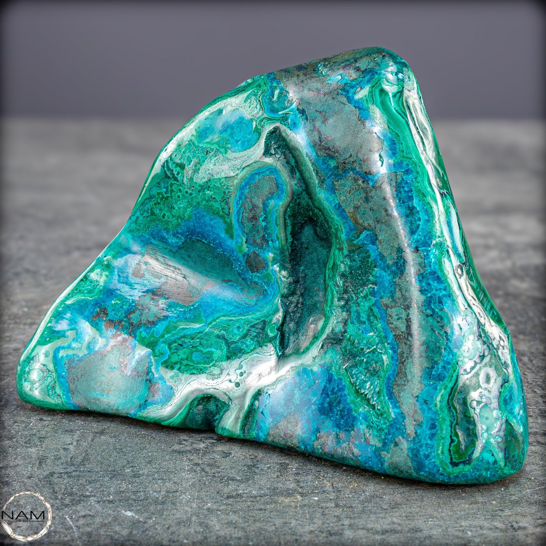 Dieses außergewöhnliche Stück besteht aus botryoidalem Malachit in Kombination mit Chrysocolla. Der Malachit zeigt seine charakteristische, blasenartige Oberfläche mit tiefen Grüntönen, die in faszinierenden Mustern angeordnet sind. In Verbindung mit dem leuchtend blauen Chrysocolla ergibt sich eine kontrastreiche und lebendige Farbkomposition, die diese Formation zu einem visuellen Erlebnis macht. Die glatte, wachsartige Oberfläche des Malachits kontrastiert mit den texturierten Bereichen, in denen Chrysocolla durchscheint.
