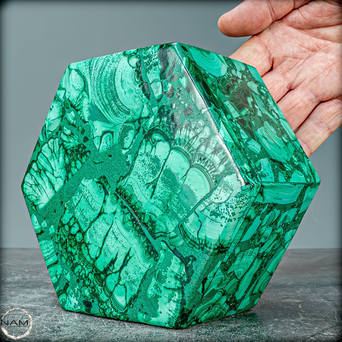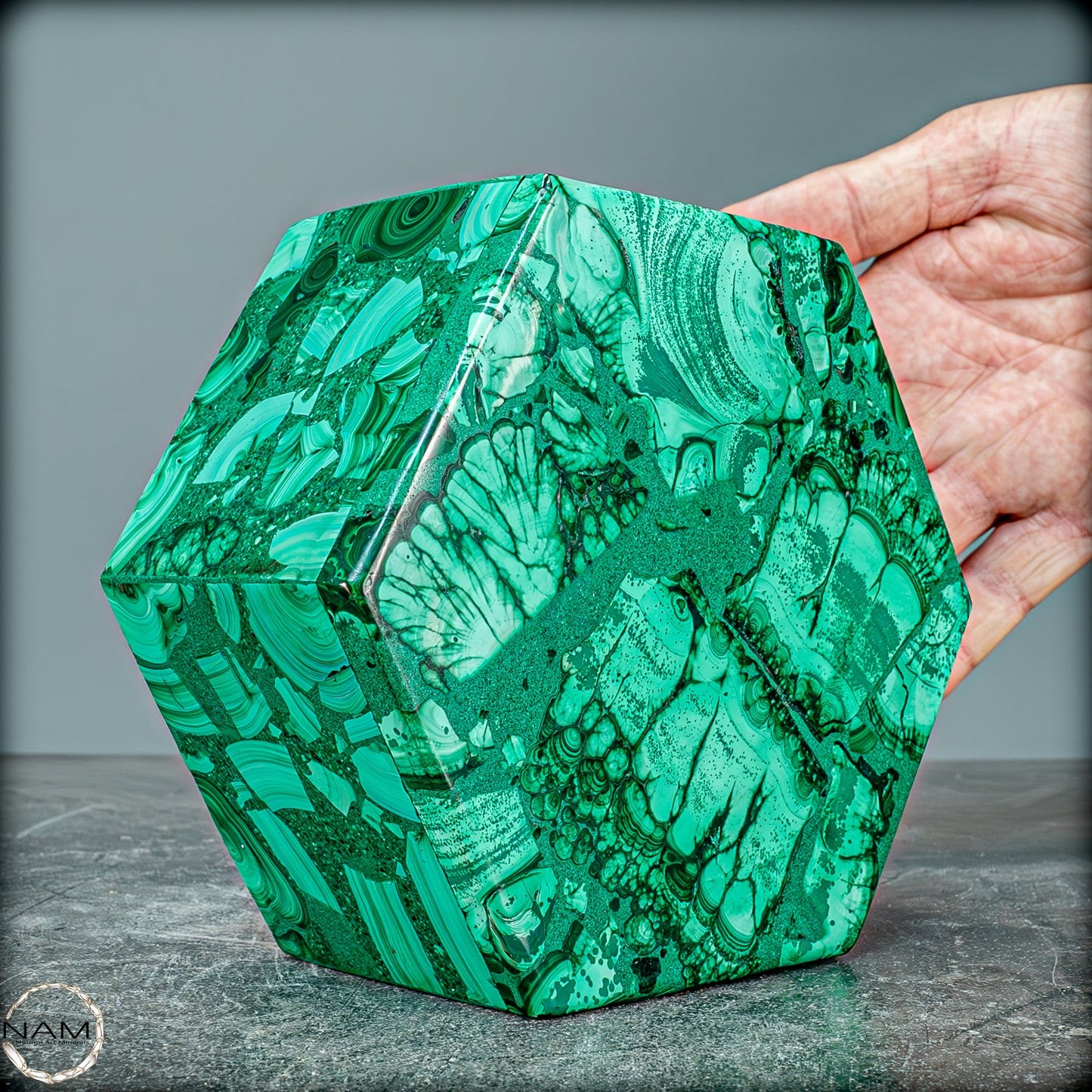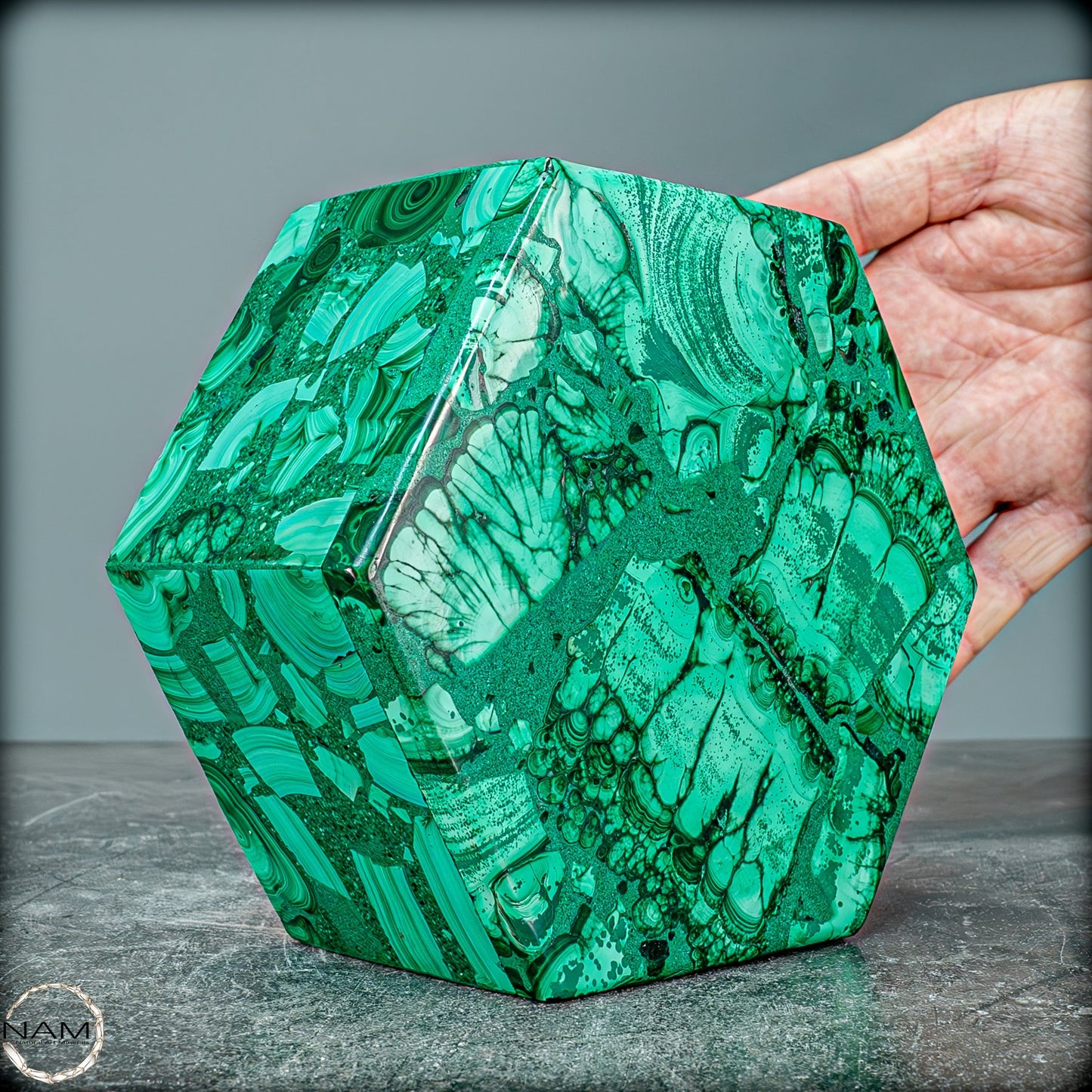 Natürlicher Malachit, eine echte Halbedelsteindose aus der Demokratischen Republik Kongo. Sie erhalten genau die abgebildete Malachit-Kristallbox. Der Deckel lässt sich vollständig aufklappen, bleibt aber im geschlossenen Zustand sicher an Ort und Stelle. Es kann zum Sammeln, zur Inneneinrichtung/Ausstellung oder zum Aufbewahren kleiner Gegenstände verwendet werden.