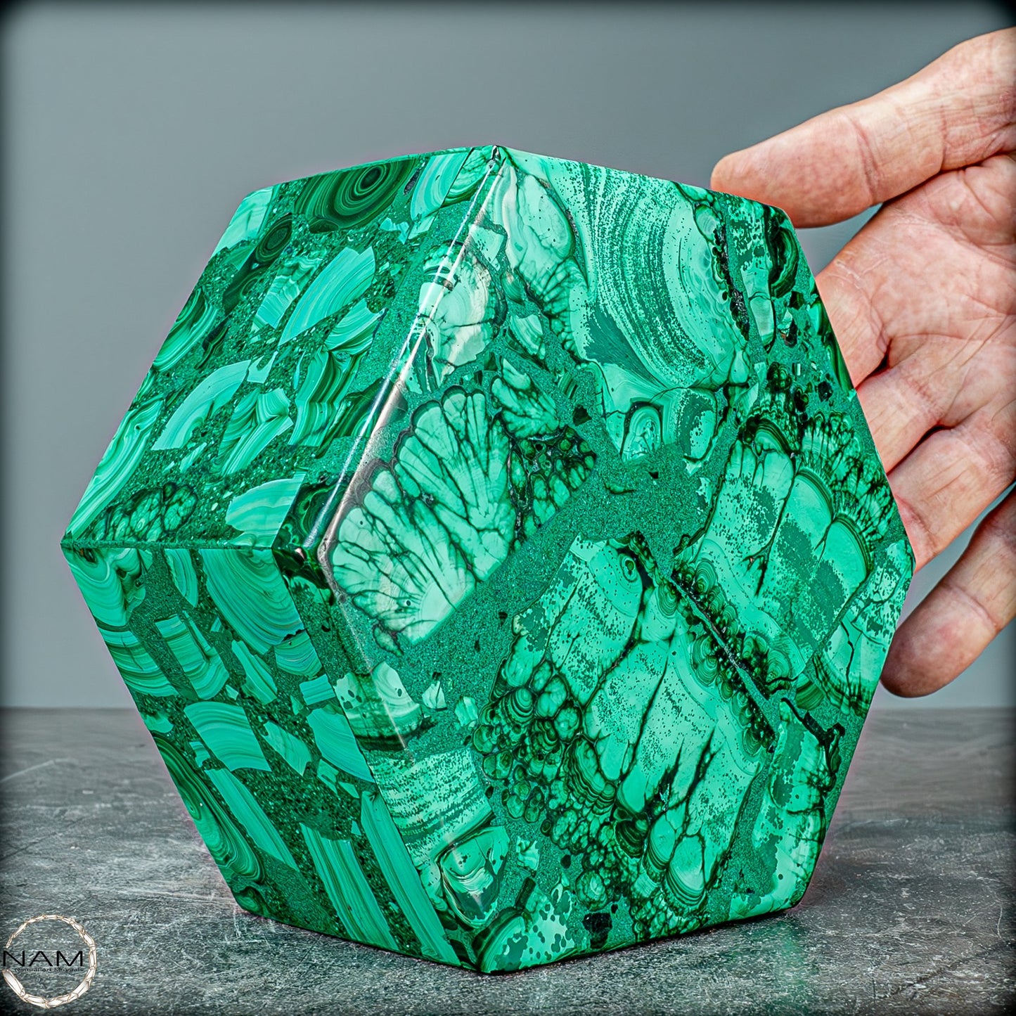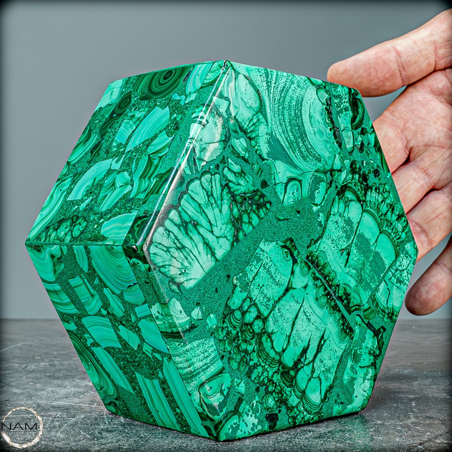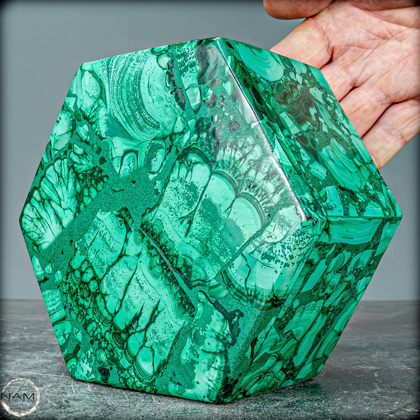 Natürlicher Malachit, eine echte Halbedelsteindose aus der Demokratischen Republik Kongo. Sie erhalten genau die abgebildete Malachit-Kristallbox. Der Deckel lässt sich vollständig aufklappen, bleibt aber im geschlossenen Zustand sicher an Ort und Stelle. Es kann zum Sammeln, zur Inneneinrichtung/Ausstellung oder zum Aufbewahren kleiner Gegenstände verwendet werden.