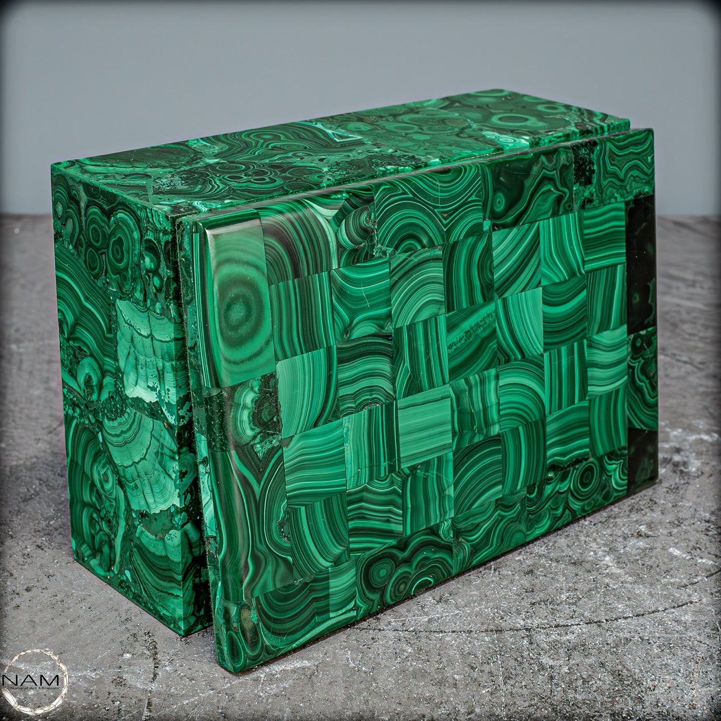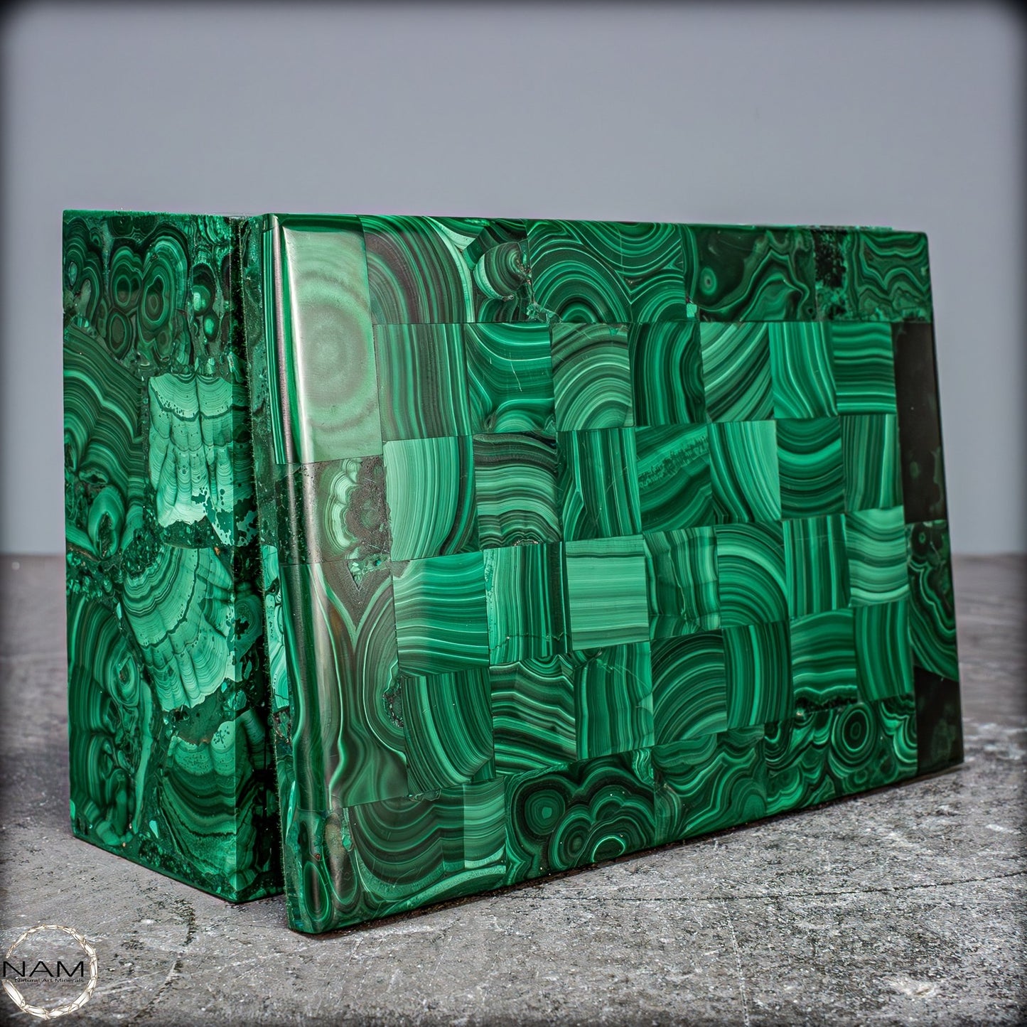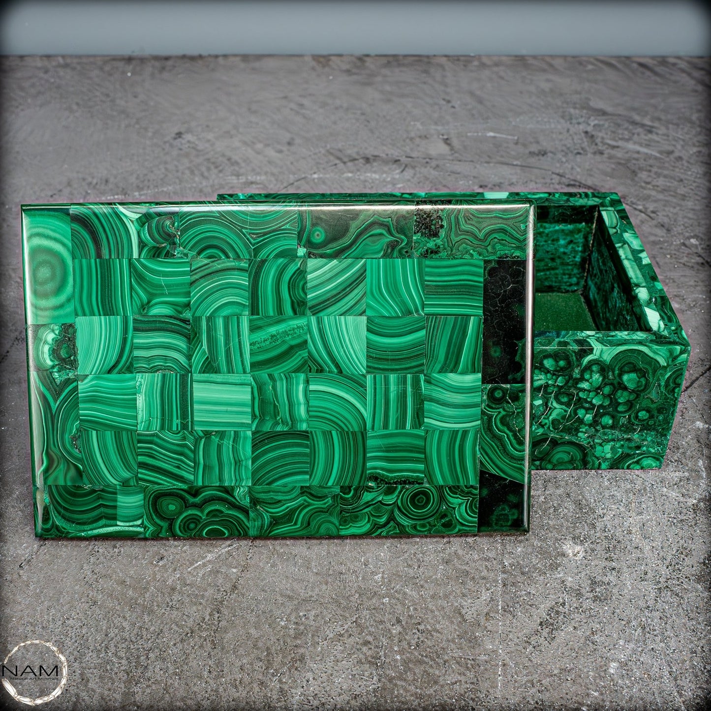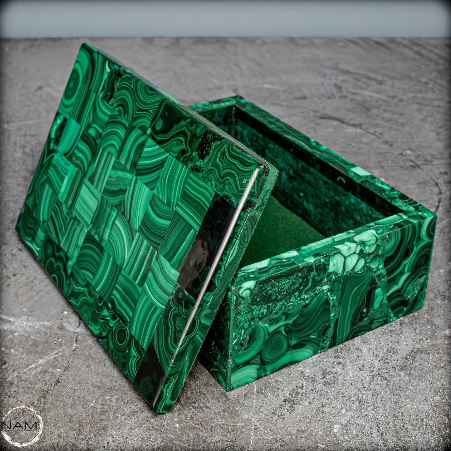 Dieses exquisite Schmuckkästchen ist vollständig aus hochwertigem Malachit gefertigt. Der intensive grüne Farbton und die charakteristischen, konzentrischen Muster des Malachits verleihen dem Kästchen eine unverwechselbare und luxuriöse Ausstrahlung. Jedes Detail dieses Kästchens wurde sorgfältig gestaltet, um die natürliche Schönheit des Malachits zu betonen.