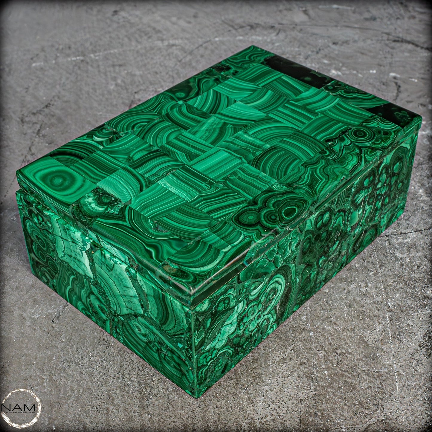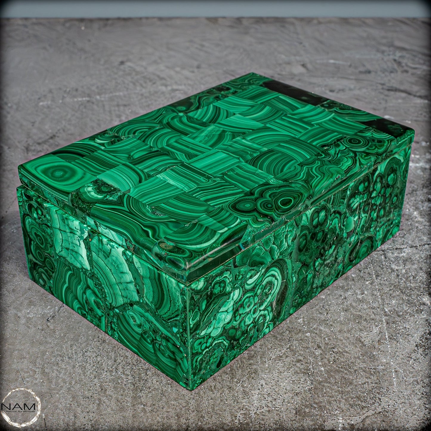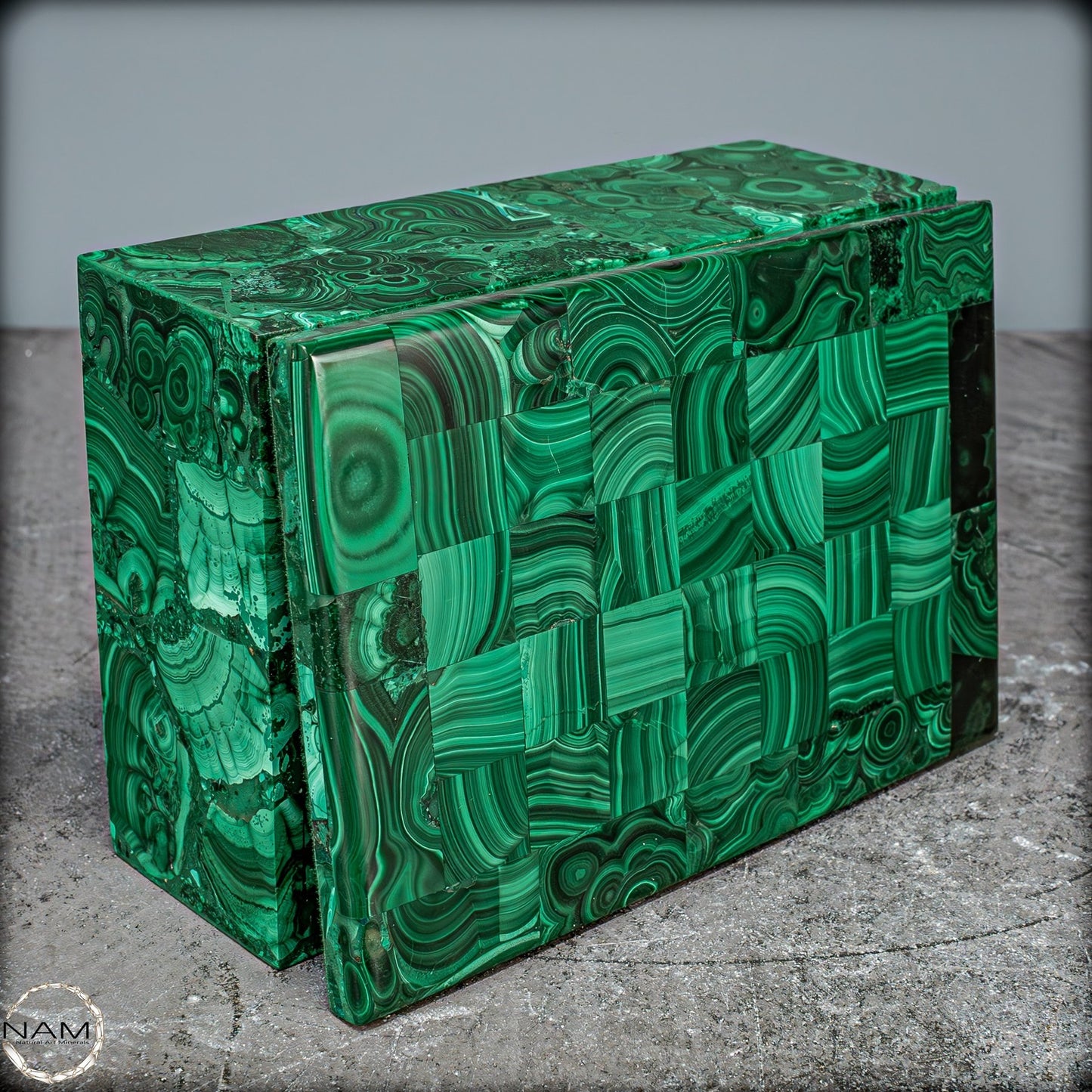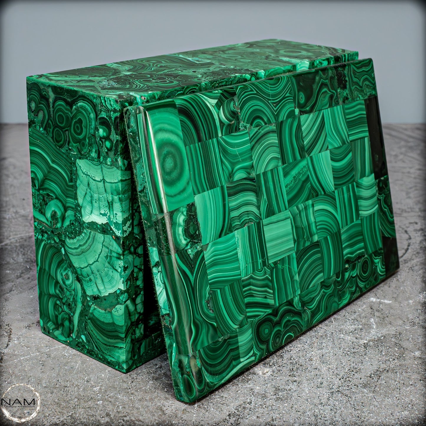 Dieses exquisite Schmuckkästchen ist vollständig aus hochwertigem Malachit gefertigt. Der intensive grüne Farbton und die charakteristischen, konzentrischen Muster des Malachits verleihen dem Kästchen eine unverwechselbare und luxuriöse Ausstrahlung. Jedes Detail dieses Kästchens wurde sorgfältig gestaltet, um die natürliche Schönheit des Malachits zu betonen.