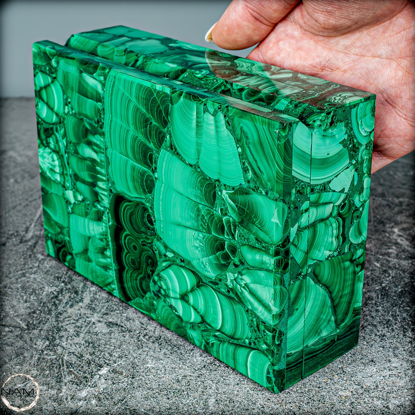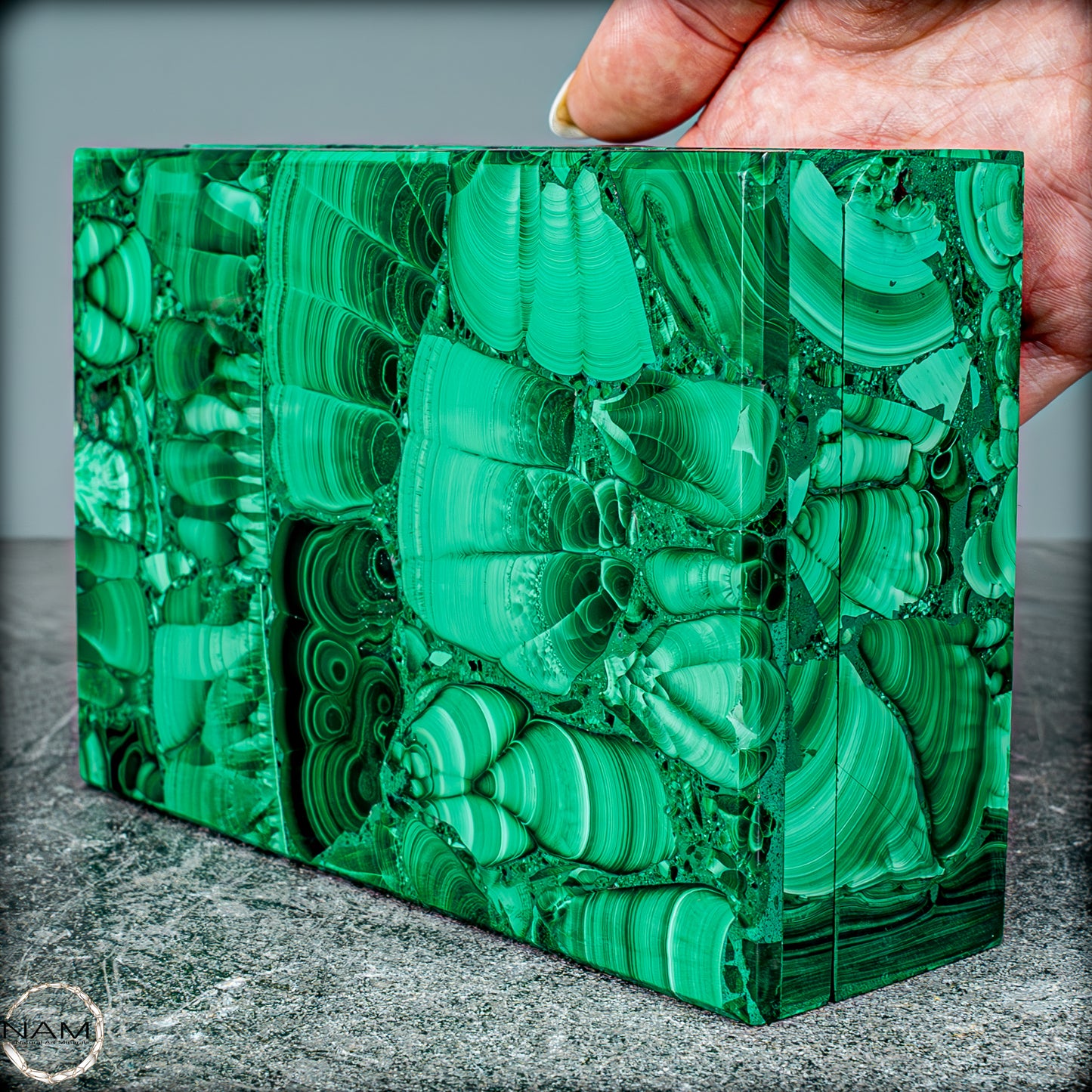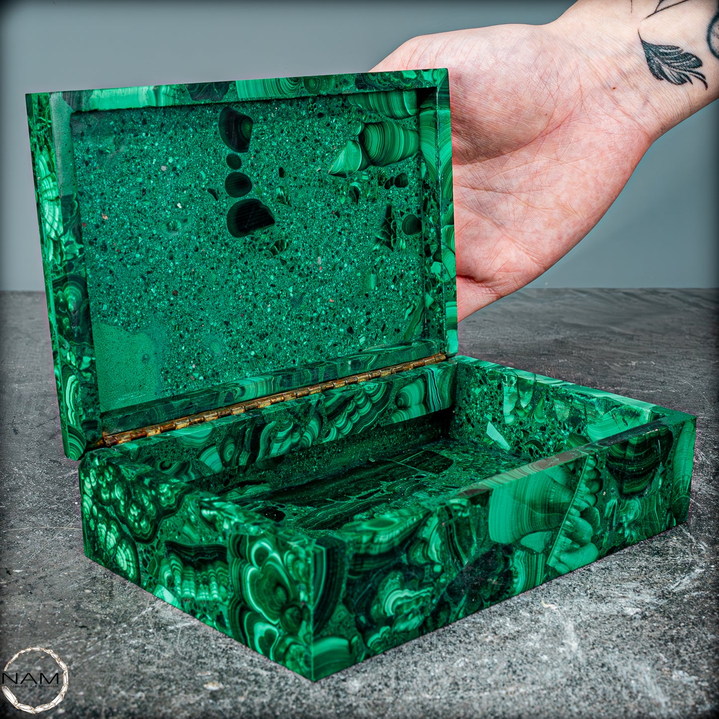 Der natürliche Ursprung des Malachits und die sorgfältige Bearbeitung machen dieses Schmuckkästchen zu einem einzigartigen Sammlerstück, das sowohl in der Welt der Mineralienliebhaber als auch unter Kunst- und Designfreunden sehr geschätzt wird. Der Malachit aus dem Kongo ist bekannt für seine außergewöhnliche Qualität und wird in dieser Form zu einem seltenen und wertvollen Objekt.