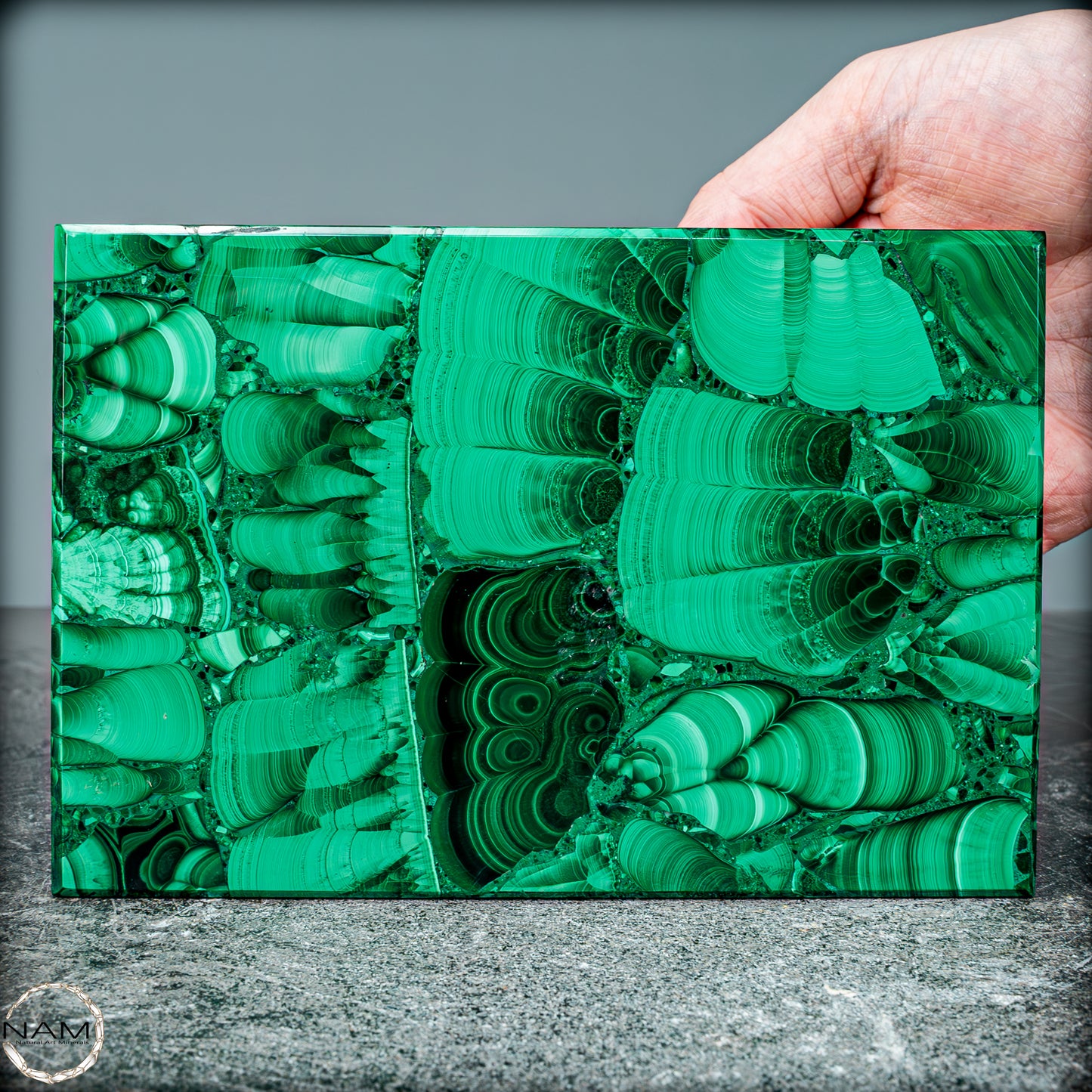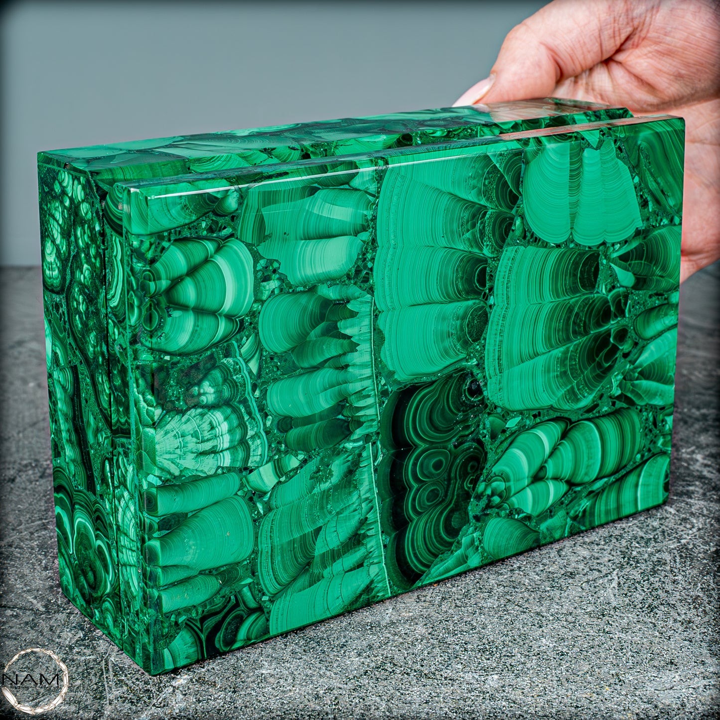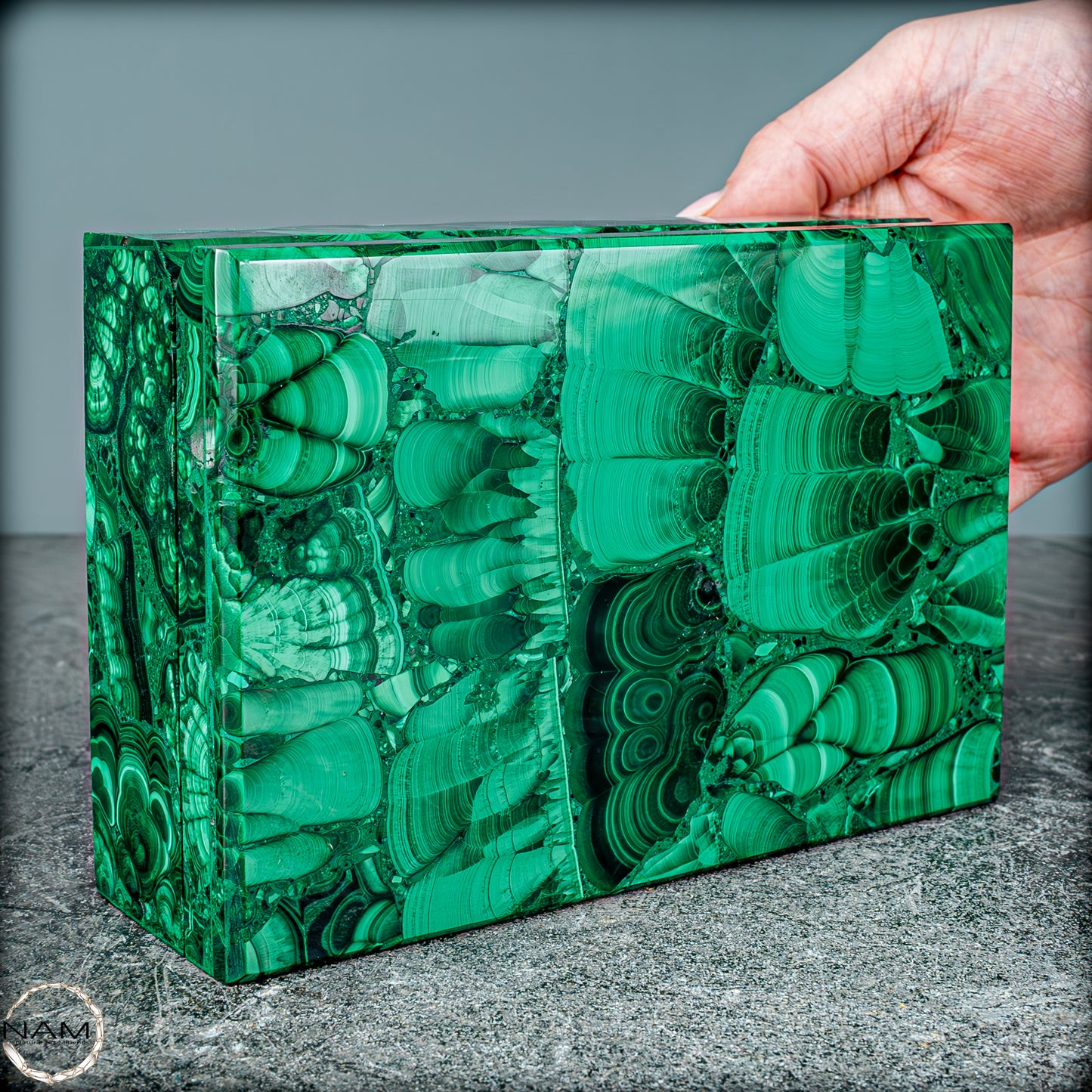 Der natürliche Ursprung des Malachits und die sorgfältige Bearbeitung machen dieses Schmuckkästchen zu einem einzigartigen Sammlerstück, das sowohl in der Welt der Mineralienliebhaber als auch unter Kunst- und Designfreunden sehr geschätzt wird. Der Malachit aus dem Kongo ist bekannt für seine außergewöhnliche Qualität und wird in dieser Form zu einem seltenen und wertvollen Objekt.