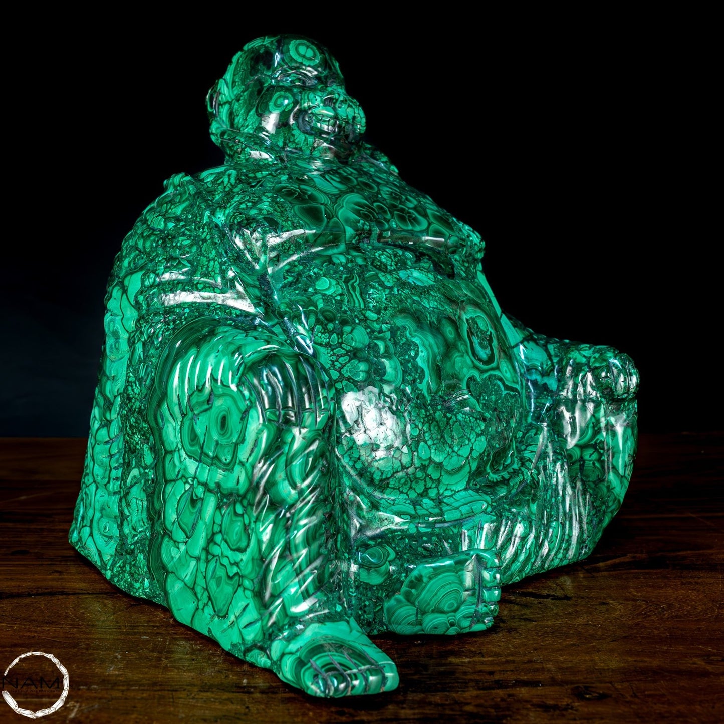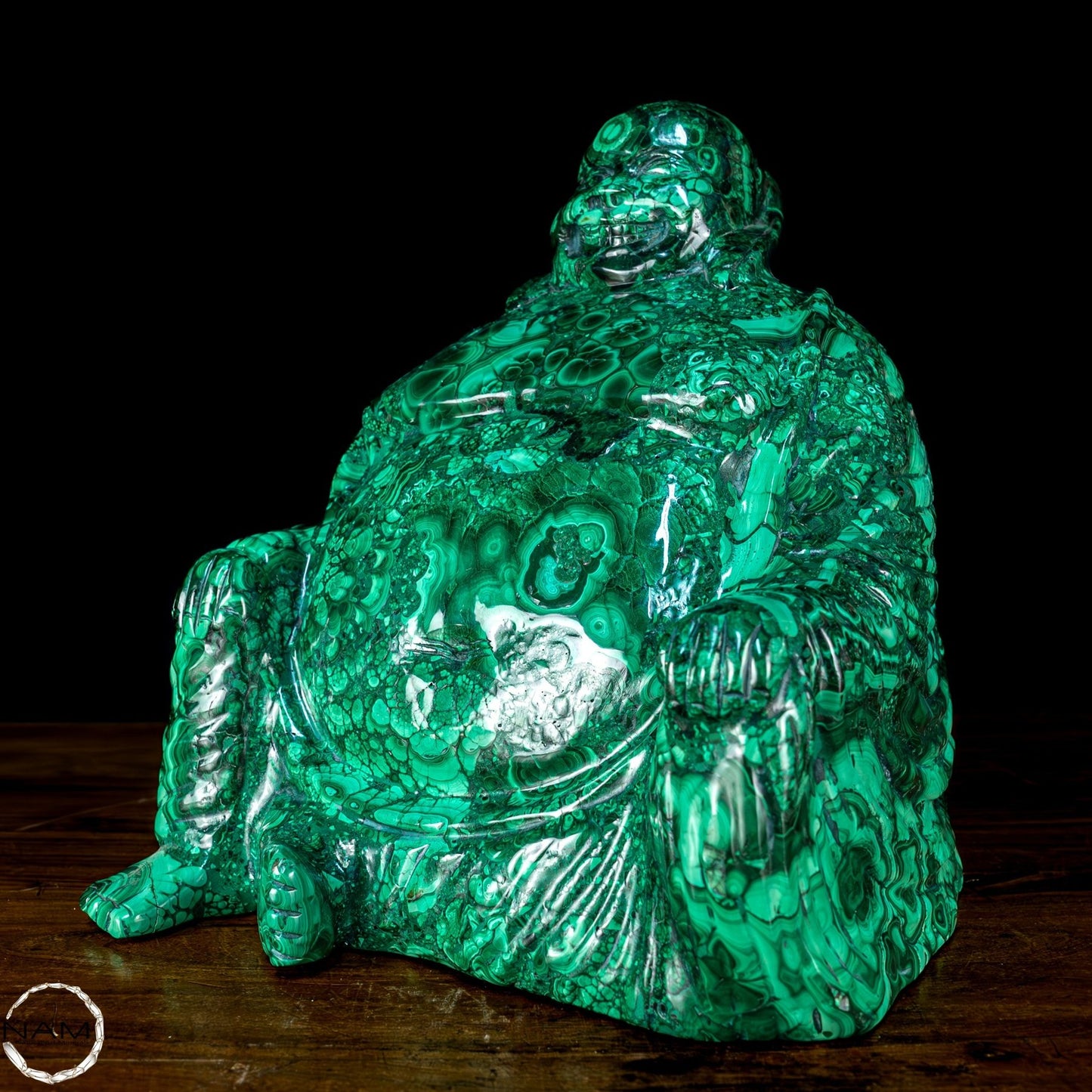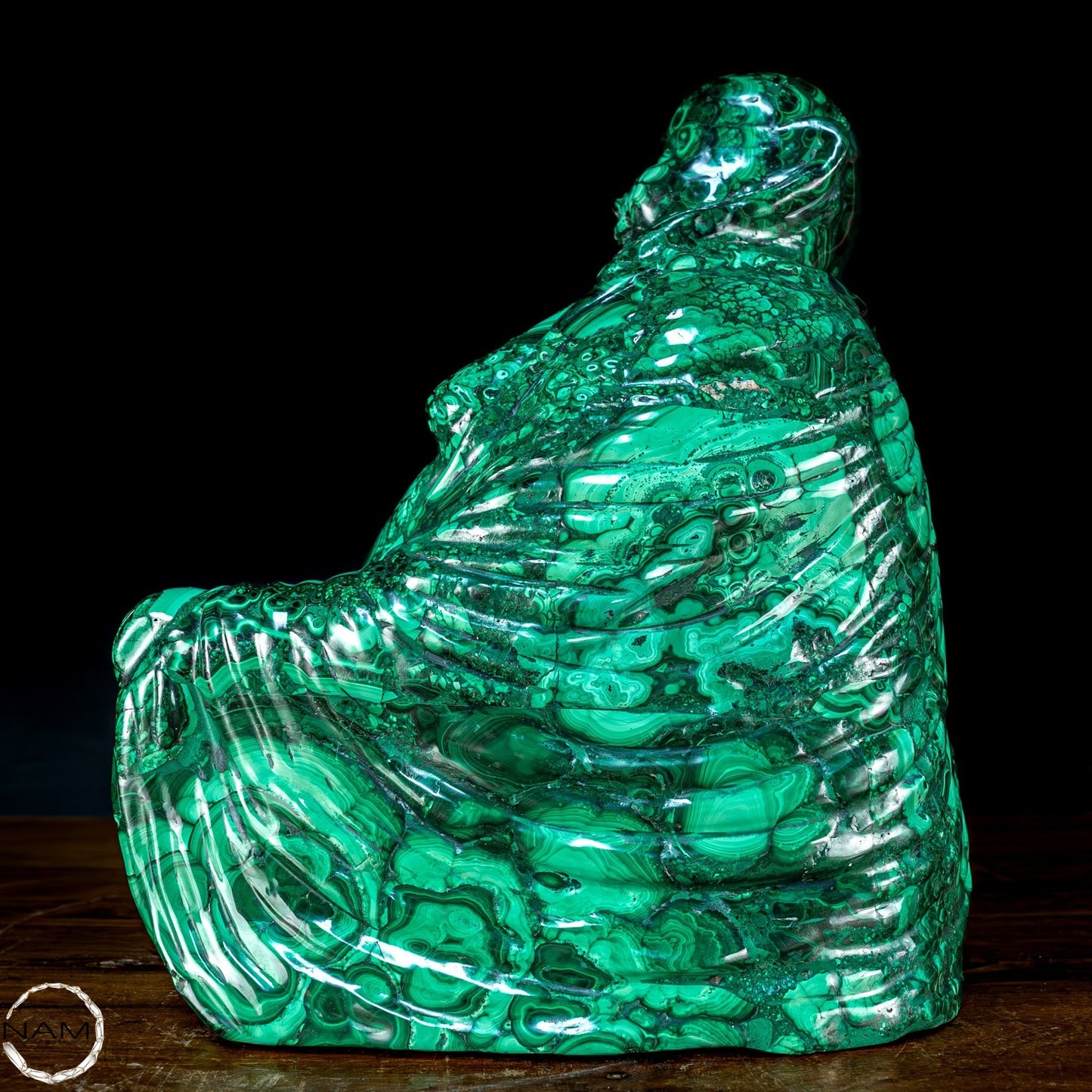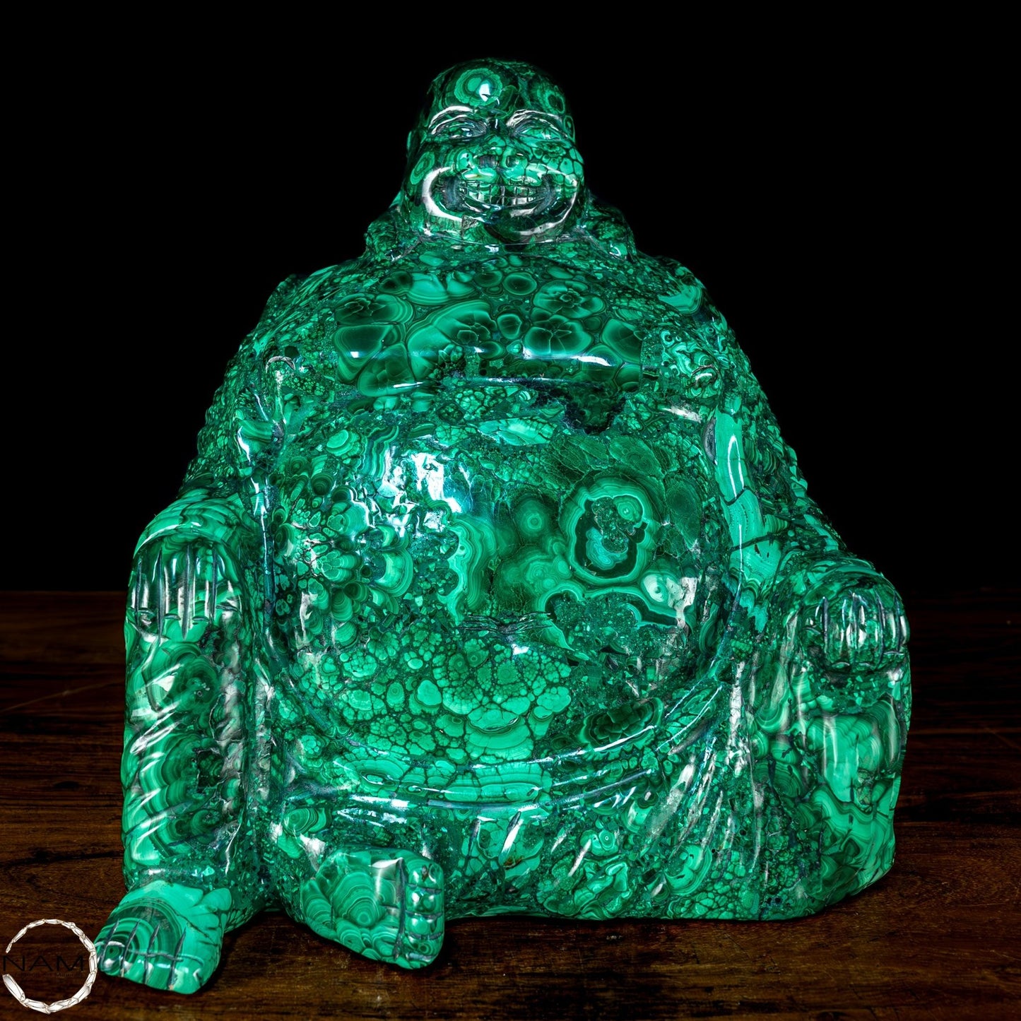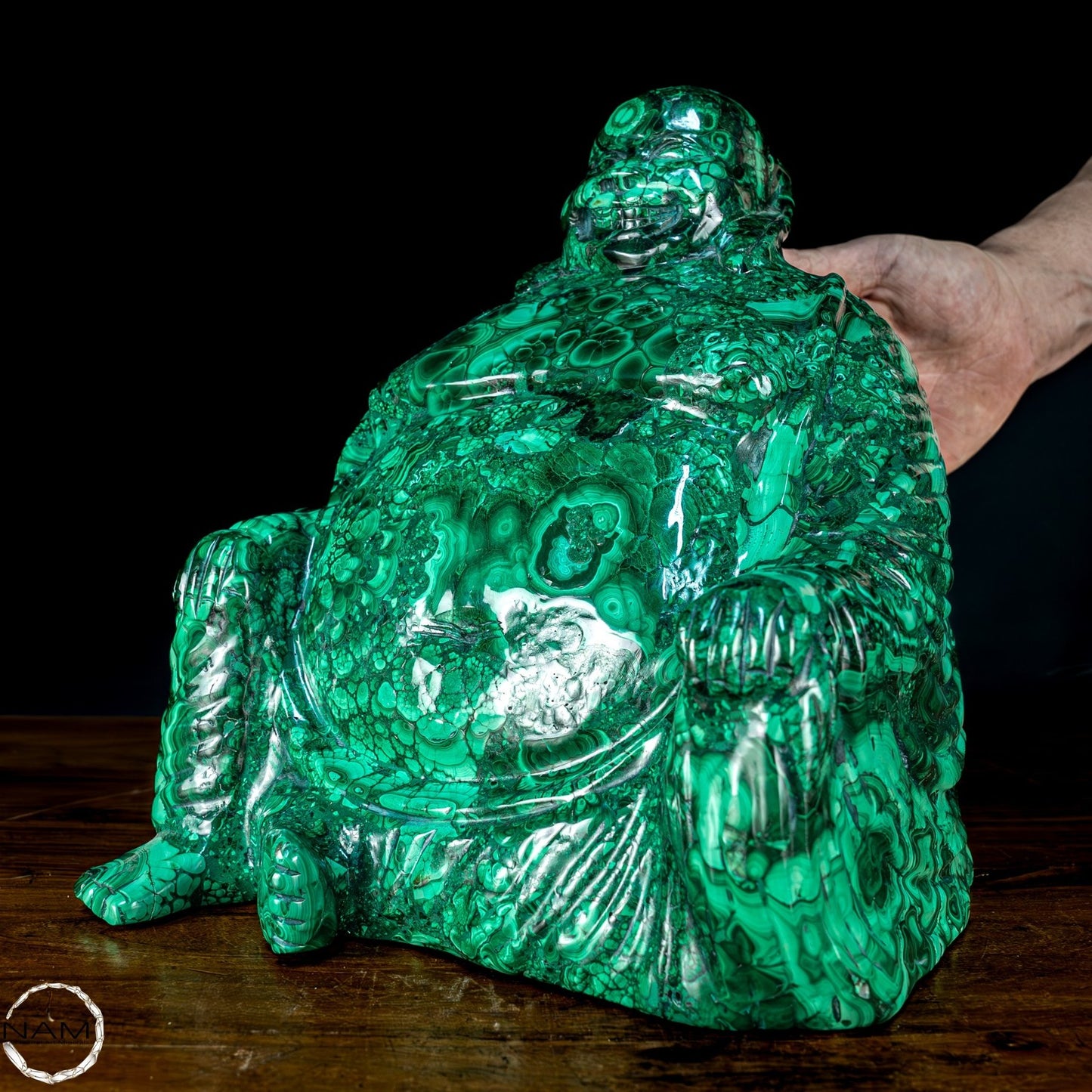 Mit Geschick und Fachwissen handgefertigt, ist es aufgrund seiner Schönheit und Eleganz die perfekte Wahl, um jede Umgebung mit Stil und Raffinesse einzurichten. Malachit, ursprünglich aus dem Kongo, ist ein hochwertiges Material, das für seine Schönheit und dekorativen Eigenschaften bekannt ist, die der Statue einen außergewöhnlichen natürlichen Glanz und eine außergewöhnliche Farbtiefe verleihen. Die perfekte Figur und die Liebe zum Detail des Buddha vermitteln Frieden und Gelassenheit und machen ihn zu einer wunderbaren Ergänzung für jeden Raum, der Harmonie und Ausgeglichenheit fördert. Diese Statue ist ein wahrer Schatz für Liebhaber orientalischer Kunst und Kultur.