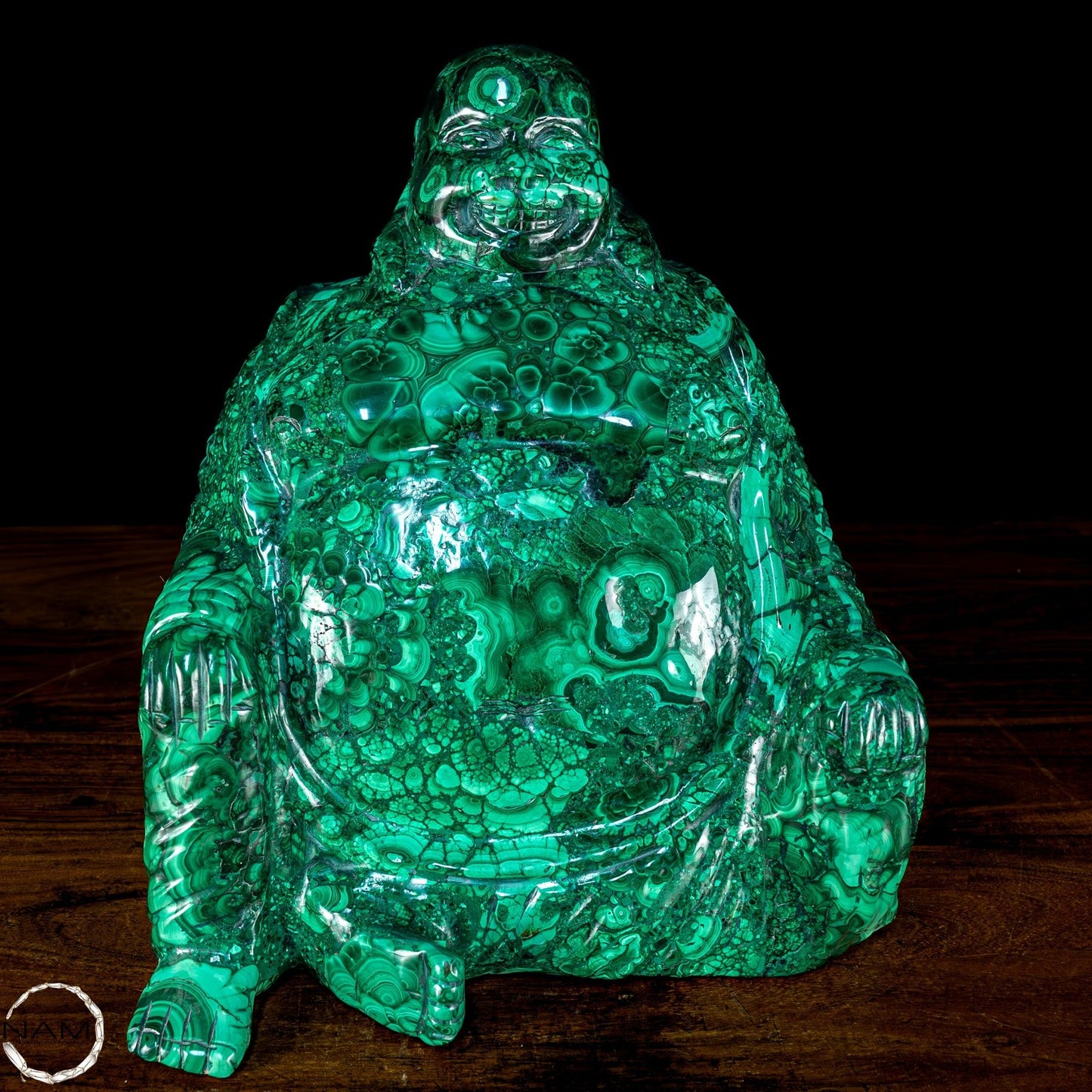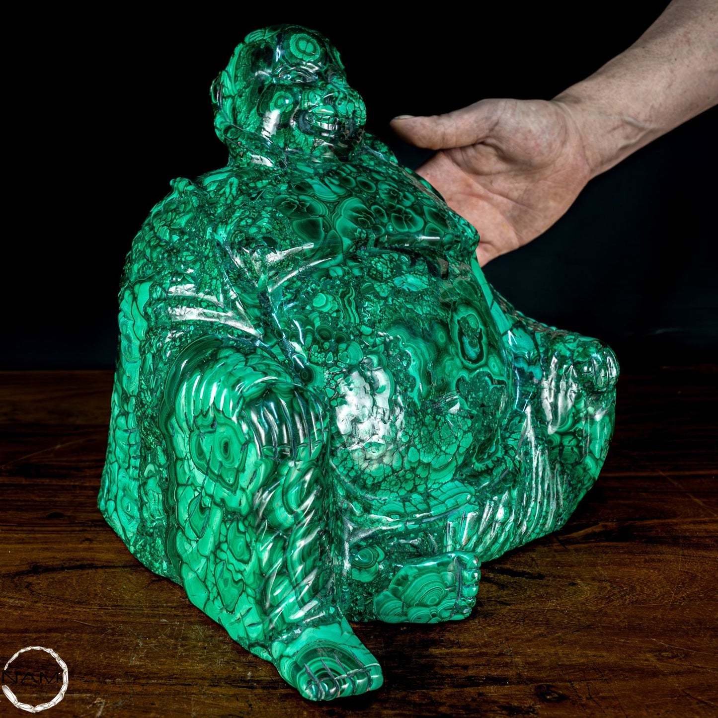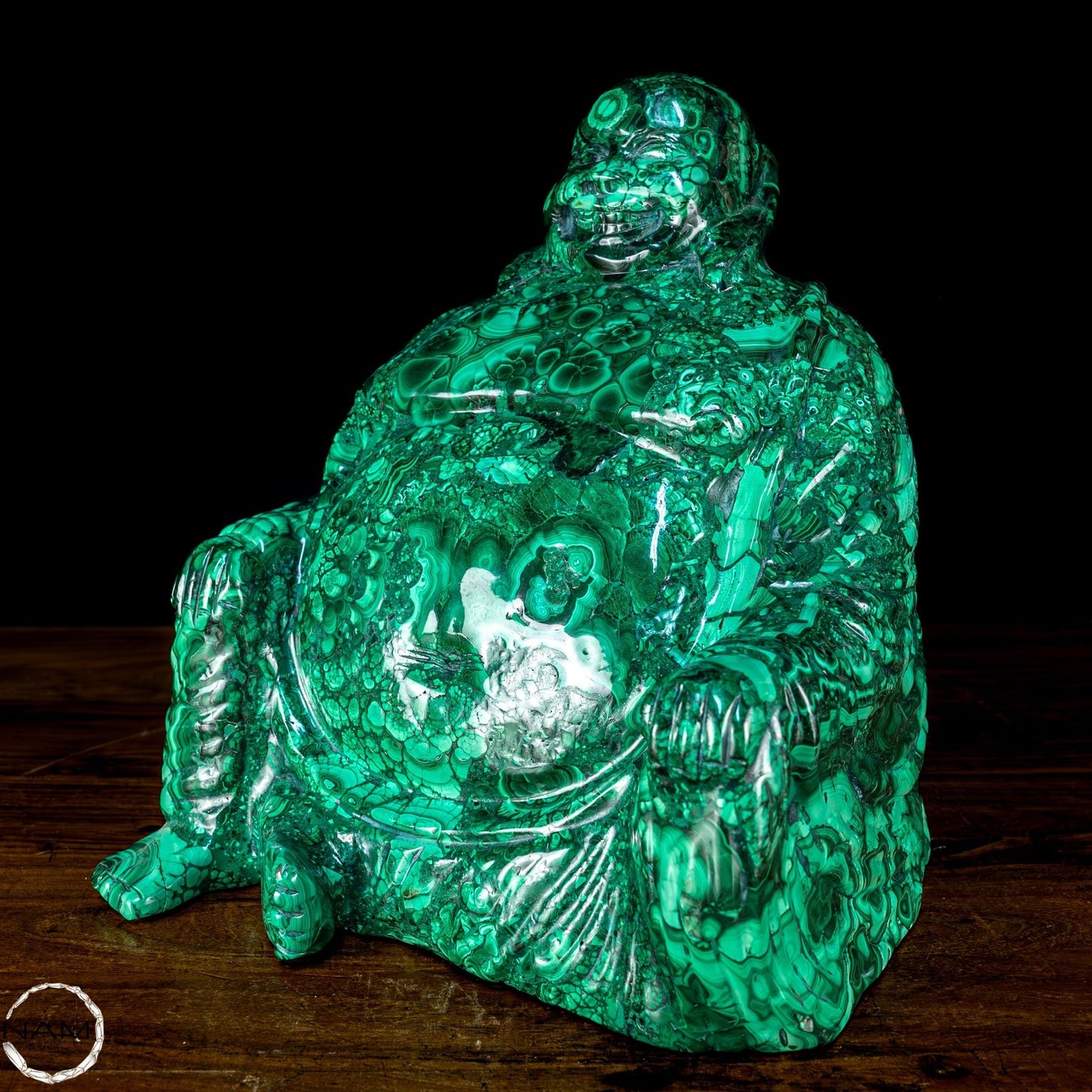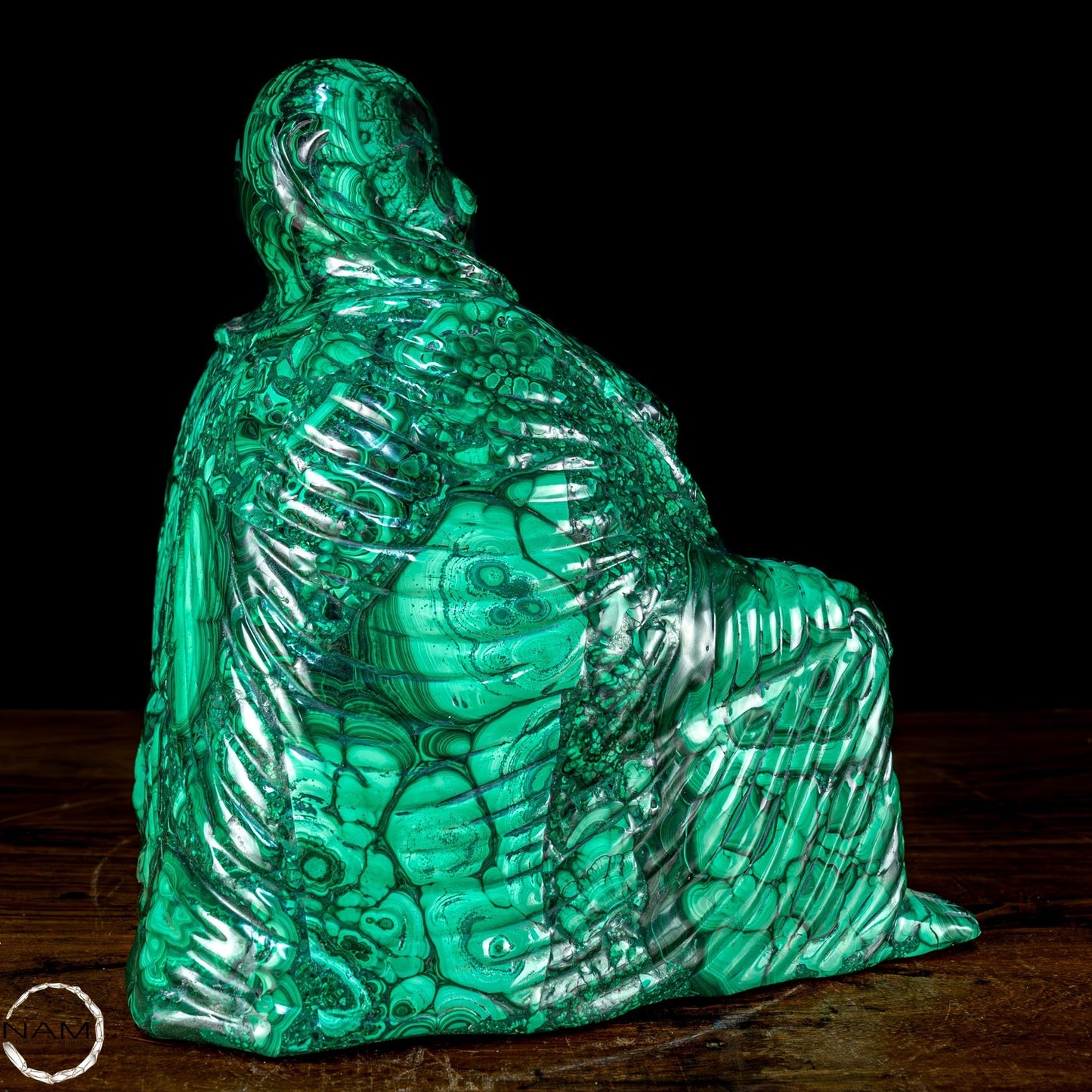 Mit Geschick und Fachwissen handgefertigt, ist es aufgrund seiner Schönheit und Eleganz die perfekte Wahl, um jede Umgebung mit Stil und Raffinesse einzurichten. Malachit, ursprünglich aus dem Kongo, ist ein hochwertiges Material, das für seine Schönheit und dekorativen Eigenschaften bekannt ist, die der Statue einen außergewöhnlichen natürlichen Glanz und eine außergewöhnliche Farbtiefe verleihen. Die perfekte Figur und die Liebe zum Detail des Buddha vermitteln Frieden und Gelassenheit und machen ihn zu einer wunderbaren Ergänzung für jeden Raum, der Harmonie und Ausgeglichenheit fördert. Diese Statue ist ein wahrer Schatz für Liebhaber orientalischer Kunst und Kultur.