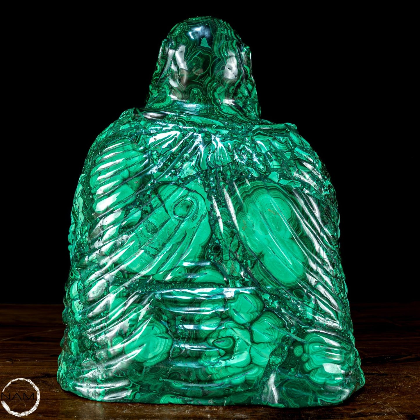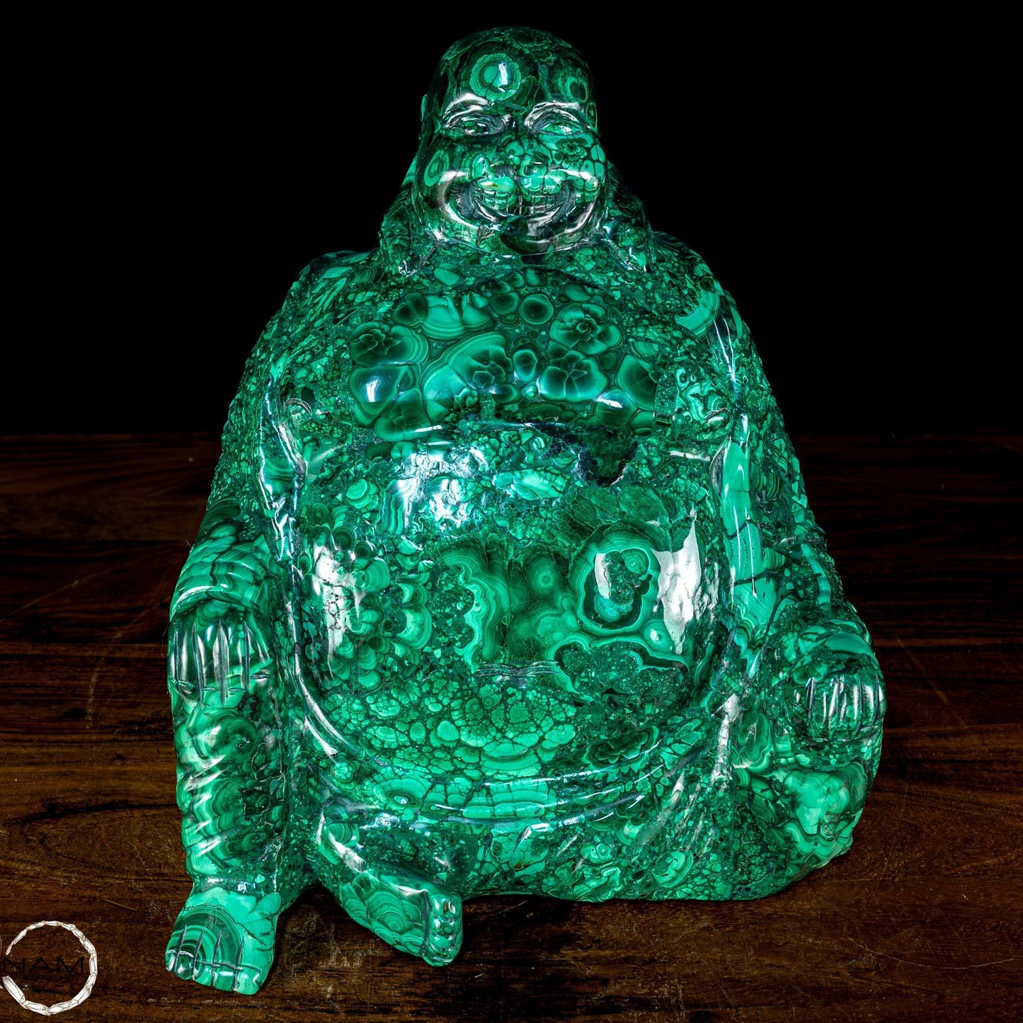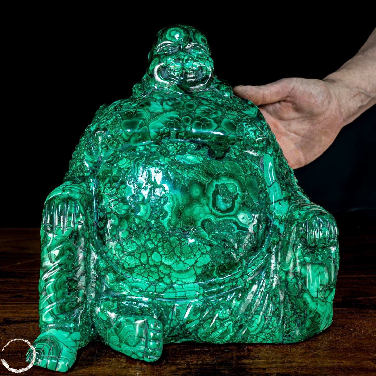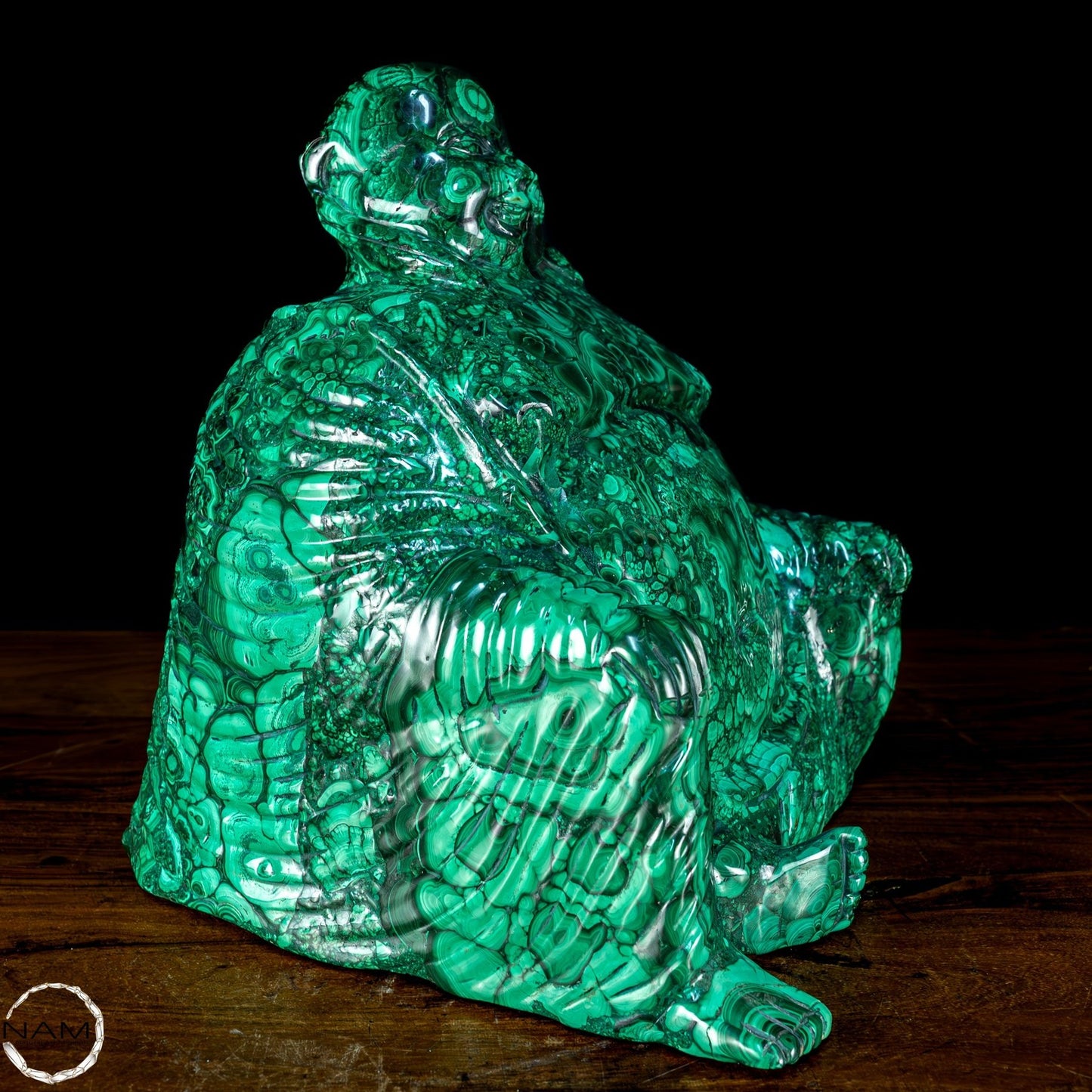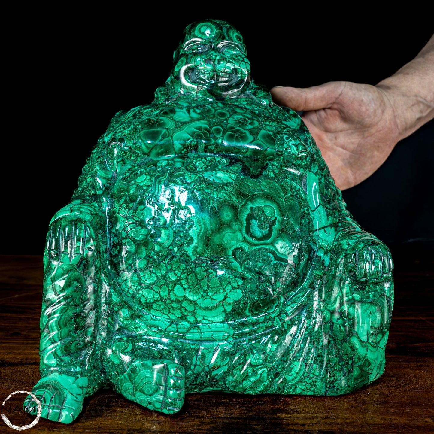 Mit Geschick und Fachwissen handgefertigt, ist es aufgrund seiner Schönheit und Eleganz die perfekte Wahl, um jede Umgebung mit Stil und Raffinesse einzurichten. Malachit, ursprünglich aus dem Kongo, ist ein hochwertiges Material, das für seine Schönheit und dekorativen Eigenschaften bekannt ist, die der Statue einen außergewöhnlichen natürlichen Glanz und eine außergewöhnliche Farbtiefe verleihen. Die perfekte Figur und die Liebe zum Detail des Buddha vermitteln Frieden und Gelassenheit und machen ihn zu einer wunderbaren Ergänzung für jeden Raum, der Harmonie und Ausgeglichenheit fördert. Diese Statue ist ein wahrer Schatz für Liebhaber orientalischer Kunst und Kultur.