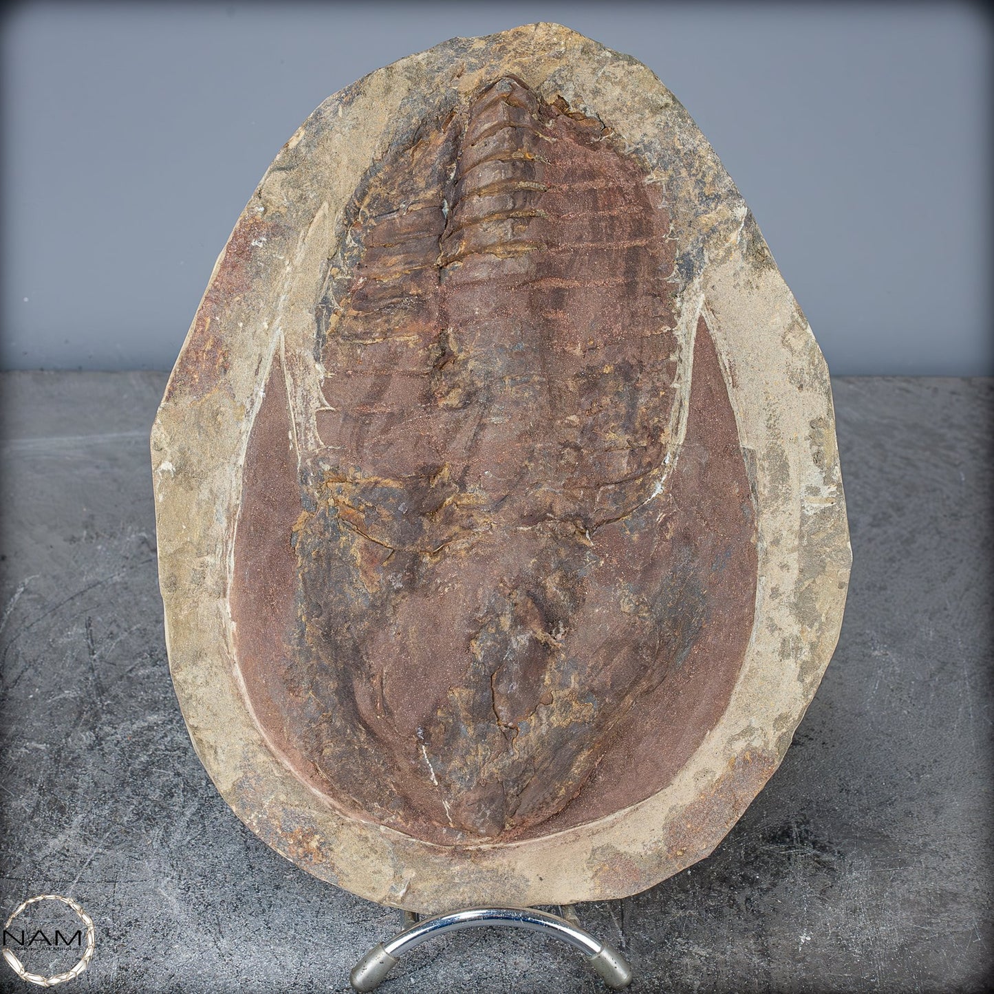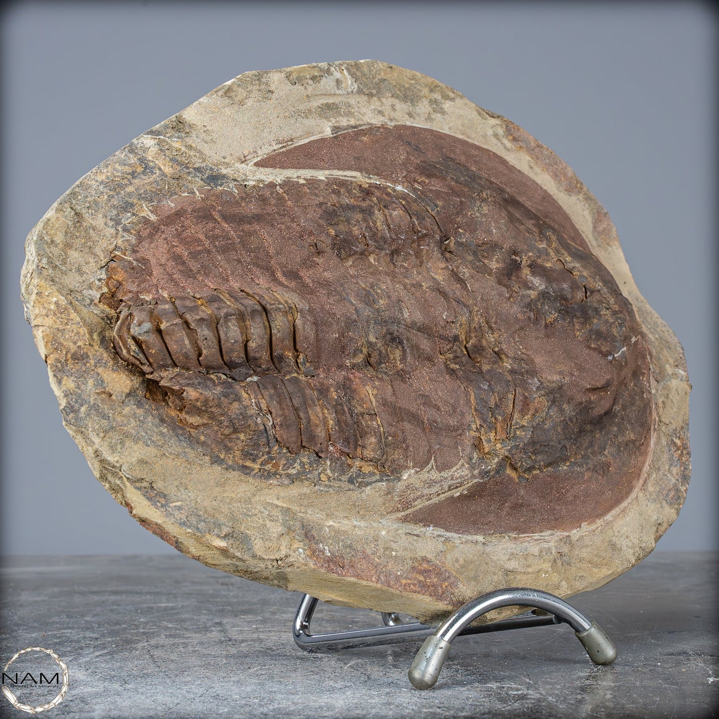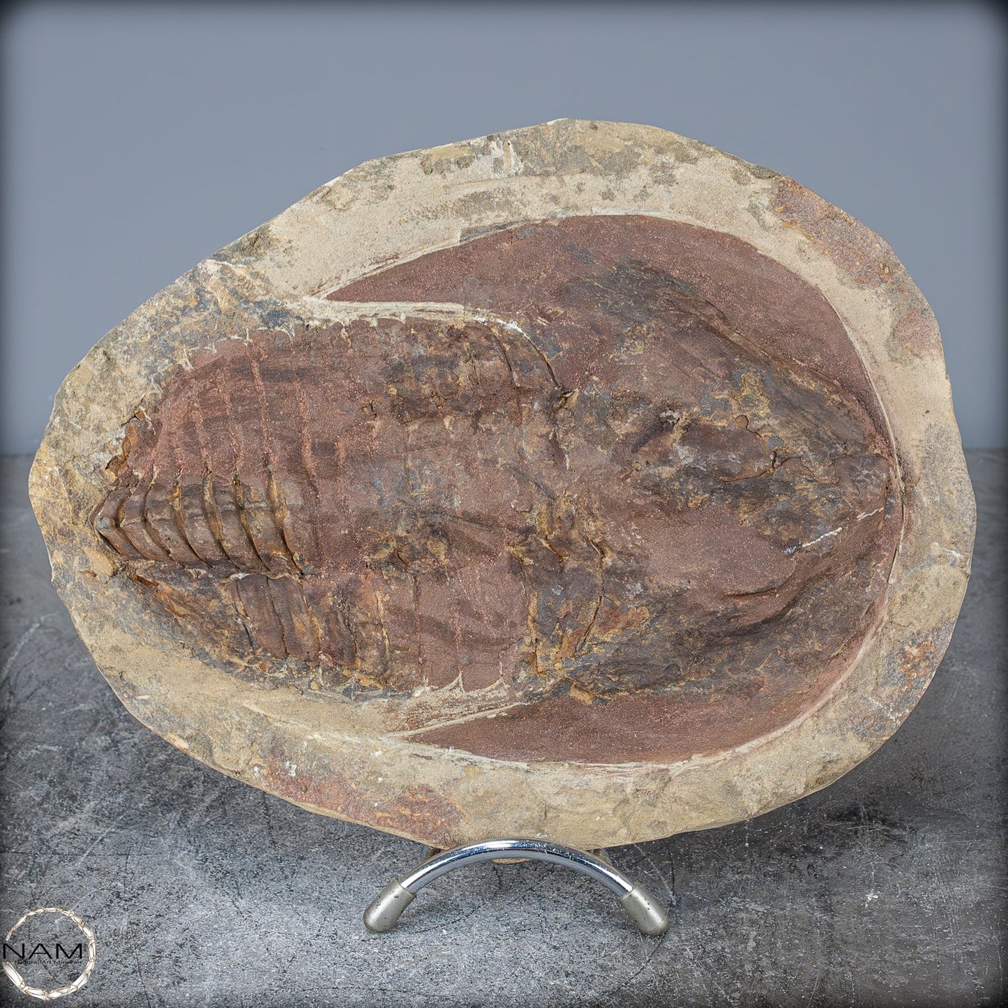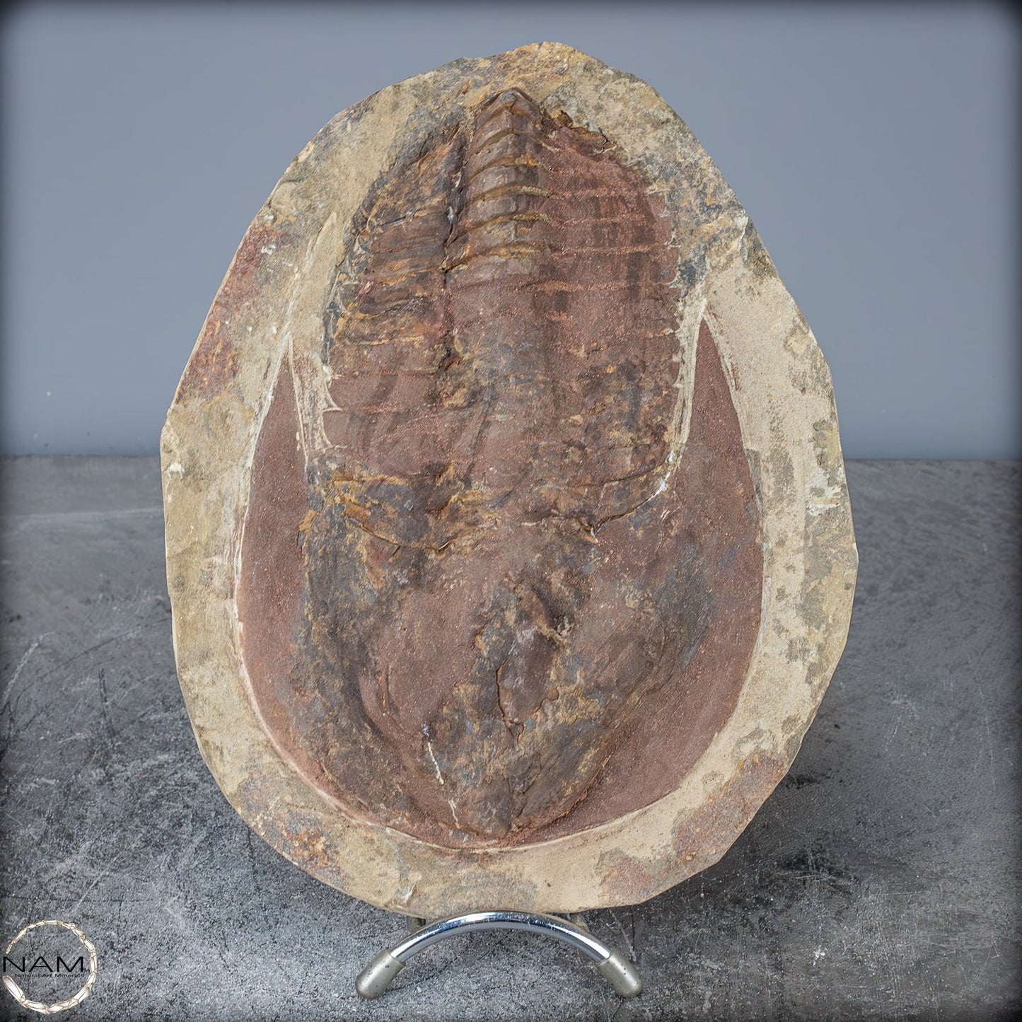 Dieses Fossil präsentiert einen beeindruckend großen Trilobiten aus Marokko, der aus der Devon-Zeit stammt und vor etwa 400 Millionen Jahren lebte. Der Trilobit zeigt eine flache Erhaltung, die seine charakteristischen Segmente und die natürliche Struktur dieses urzeitlichen Meerestieres detailreich wiedergibt. Die rotbraune Färbung der Versteinerung, kombiniert mit den gut sichtbaren Rändern und Konturen, hebt die Form und die einstige Struktur des Exoskeletts hervor.