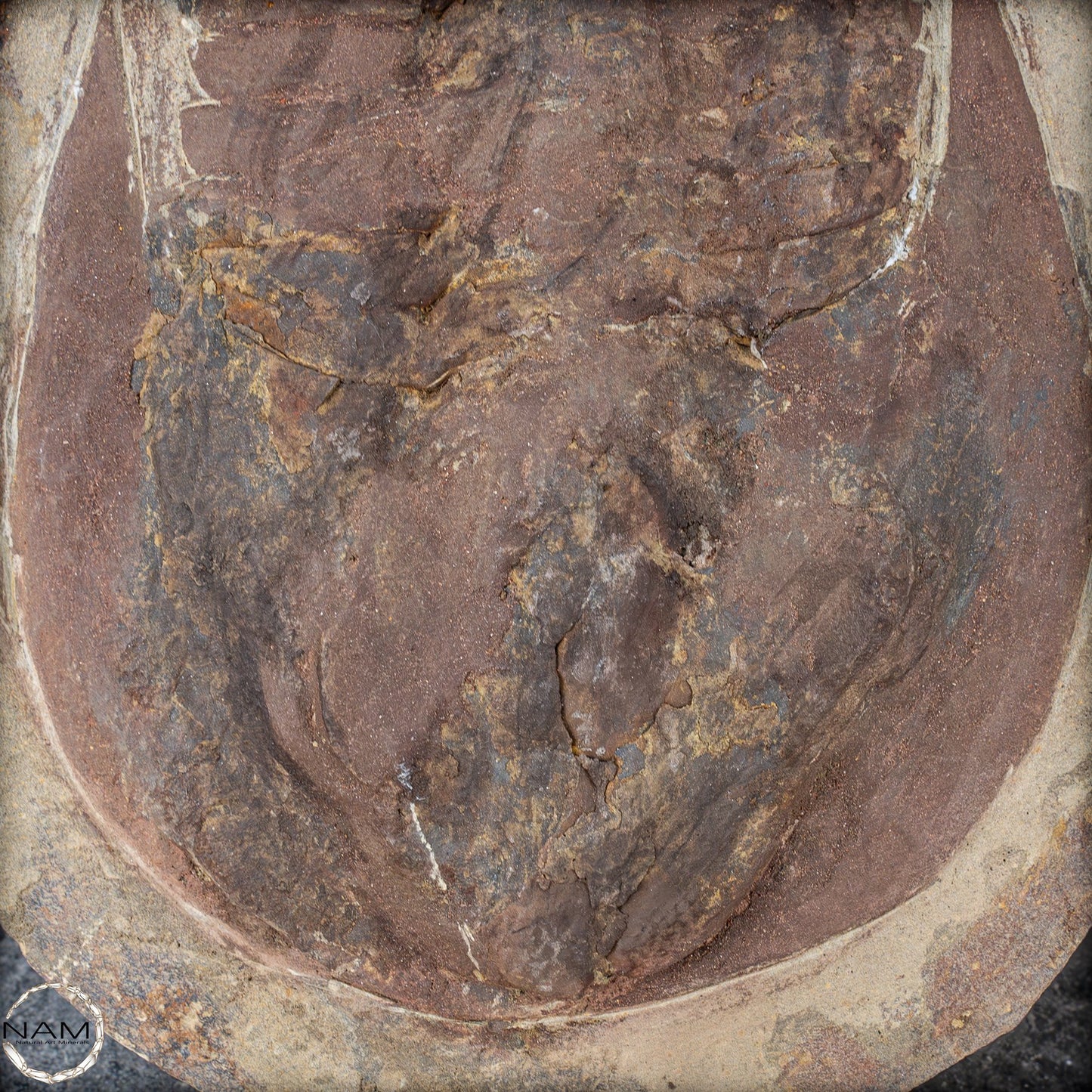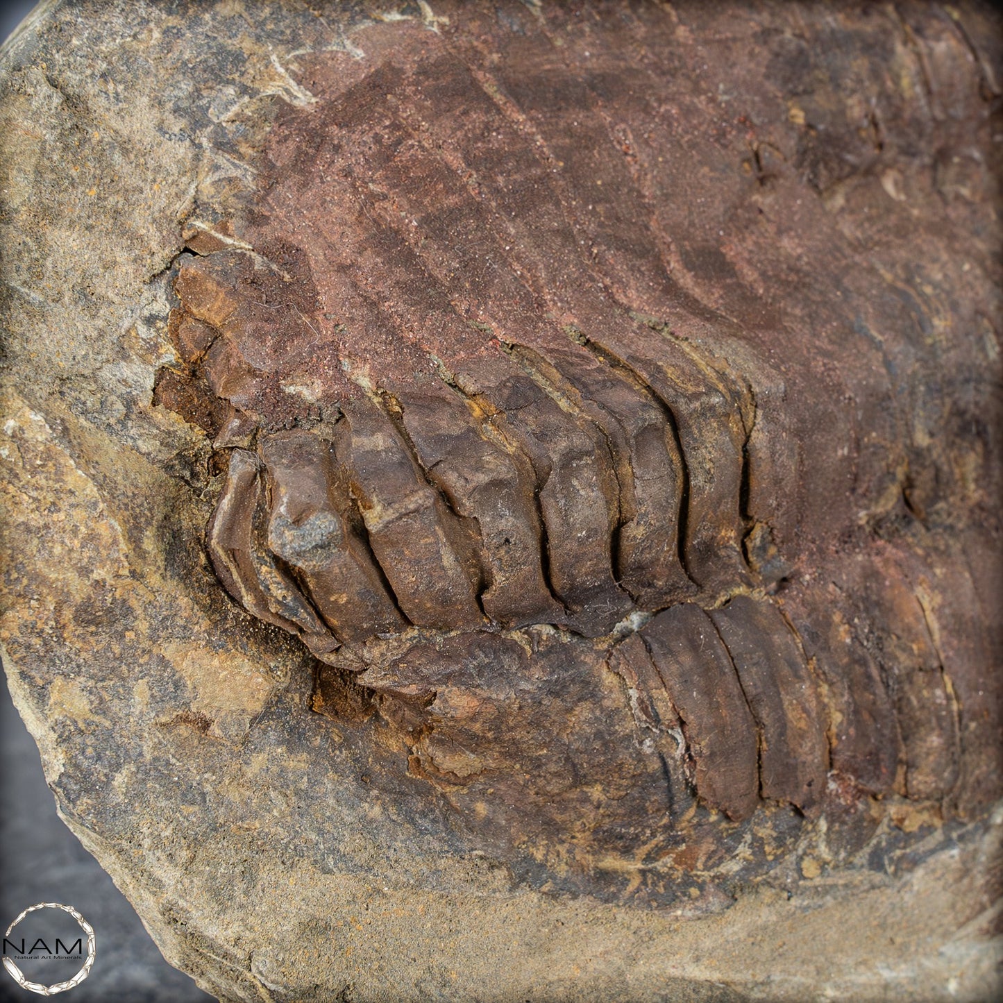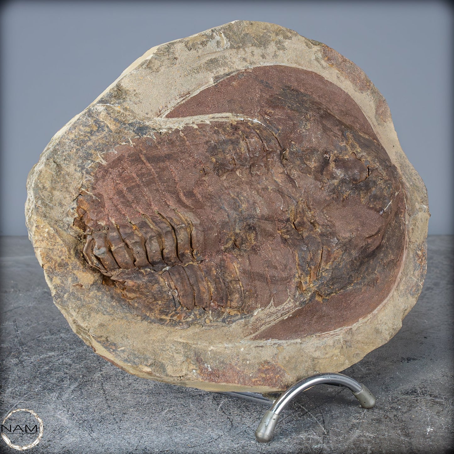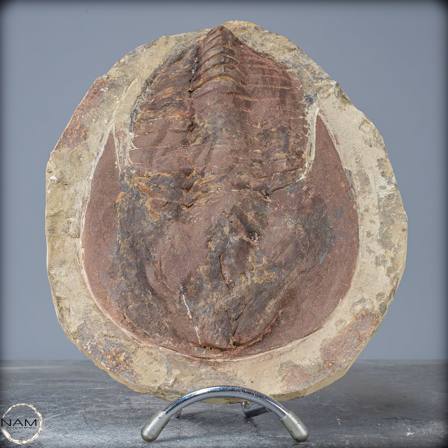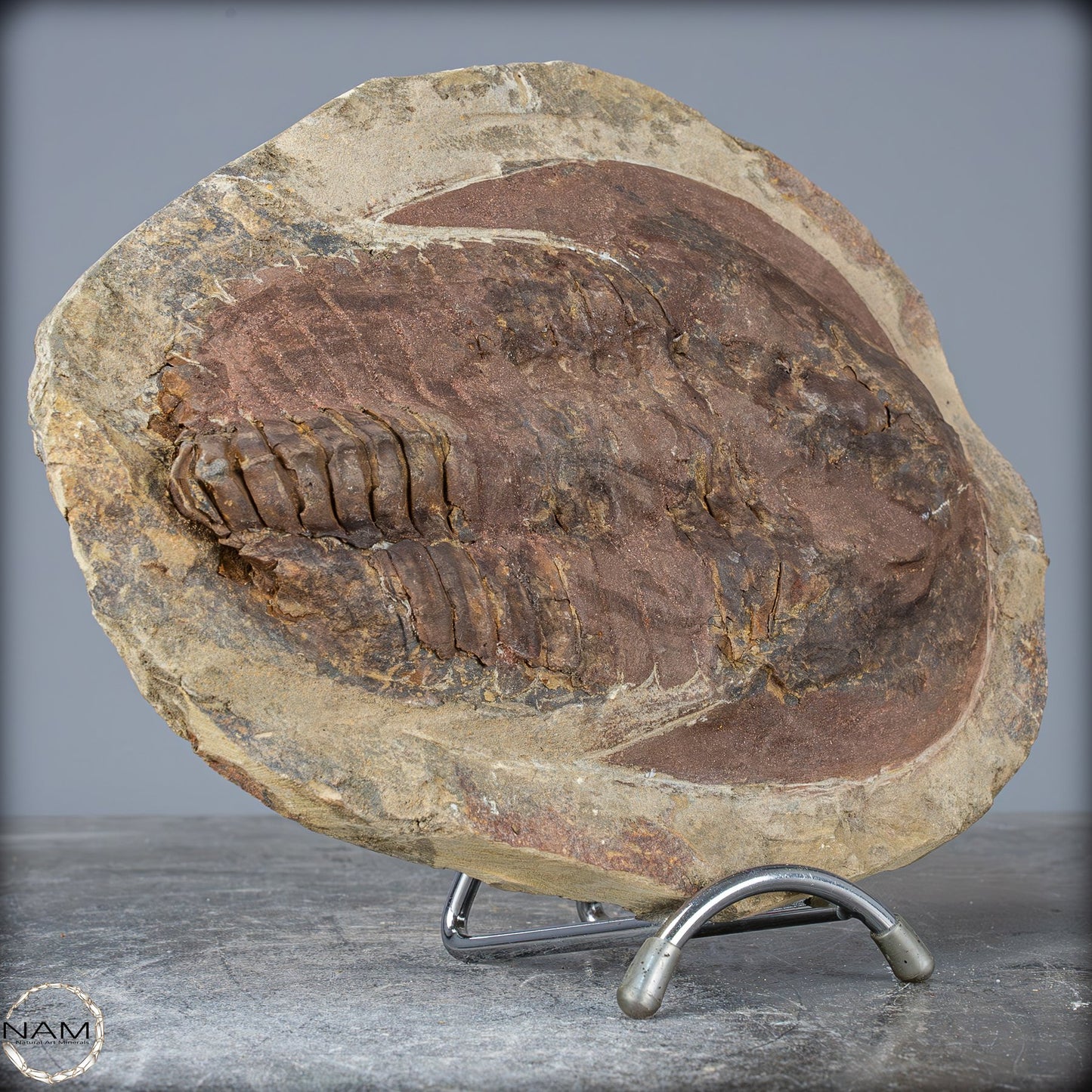 Dieses Fossil präsentiert einen beeindruckend großen Trilobiten aus Marokko, der aus der Devon-Zeit stammt und vor etwa 400 Millionen Jahren lebte. Der Trilobit zeigt eine flache Erhaltung, die seine charakteristischen Segmente und die natürliche Struktur dieses urzeitlichen Meerestieres detailreich wiedergibt. Die rotbraune Färbung der Versteinerung, kombiniert mit den gut sichtbaren Rändern und Konturen, hebt die Form und die einstige Struktur des Exoskeletts hervor.