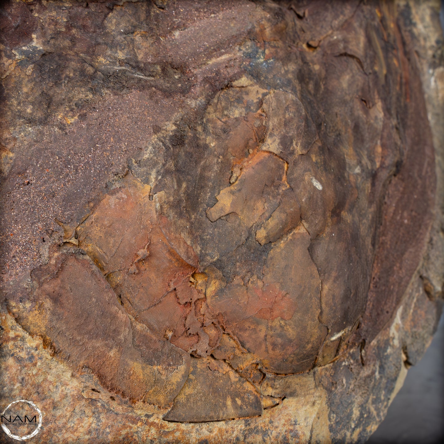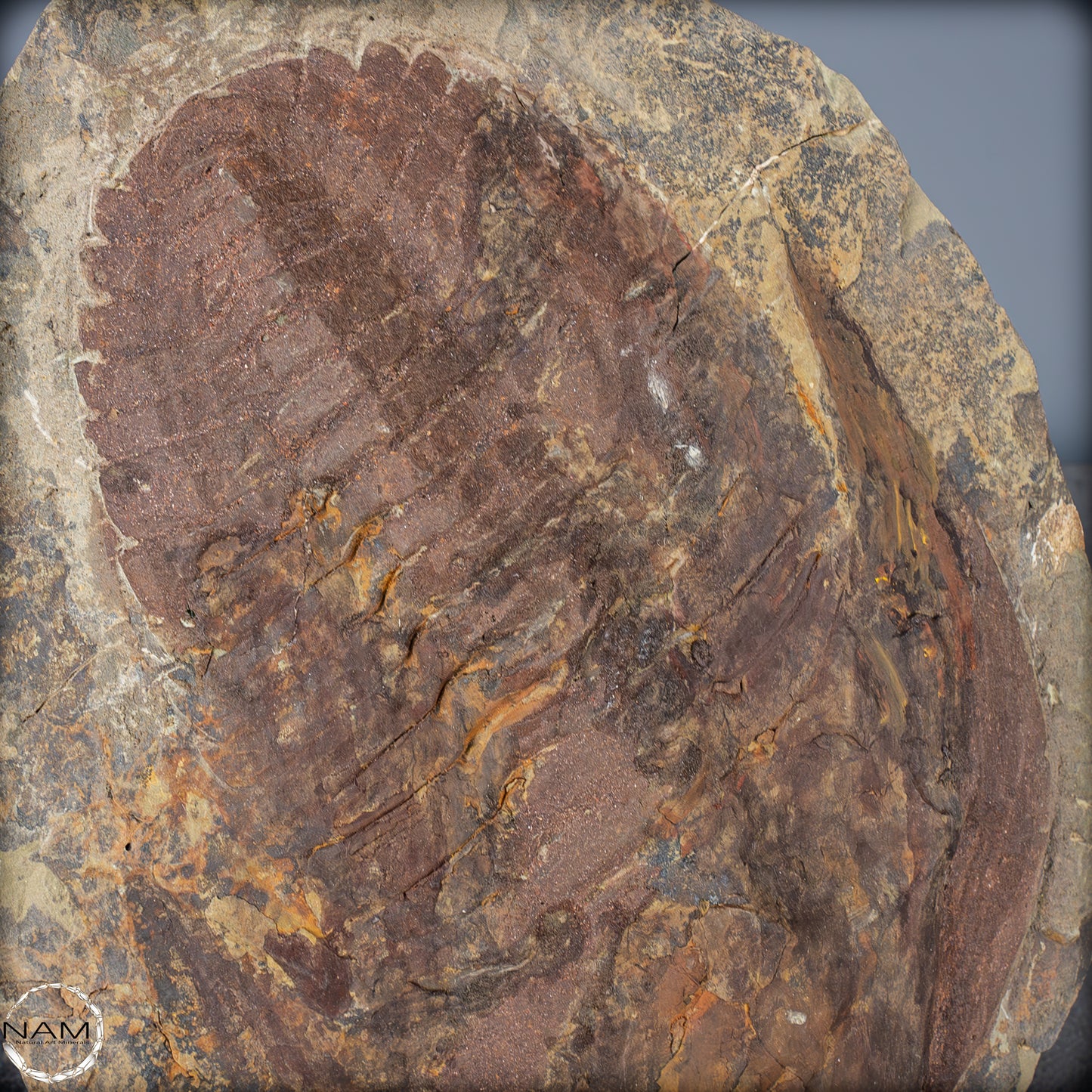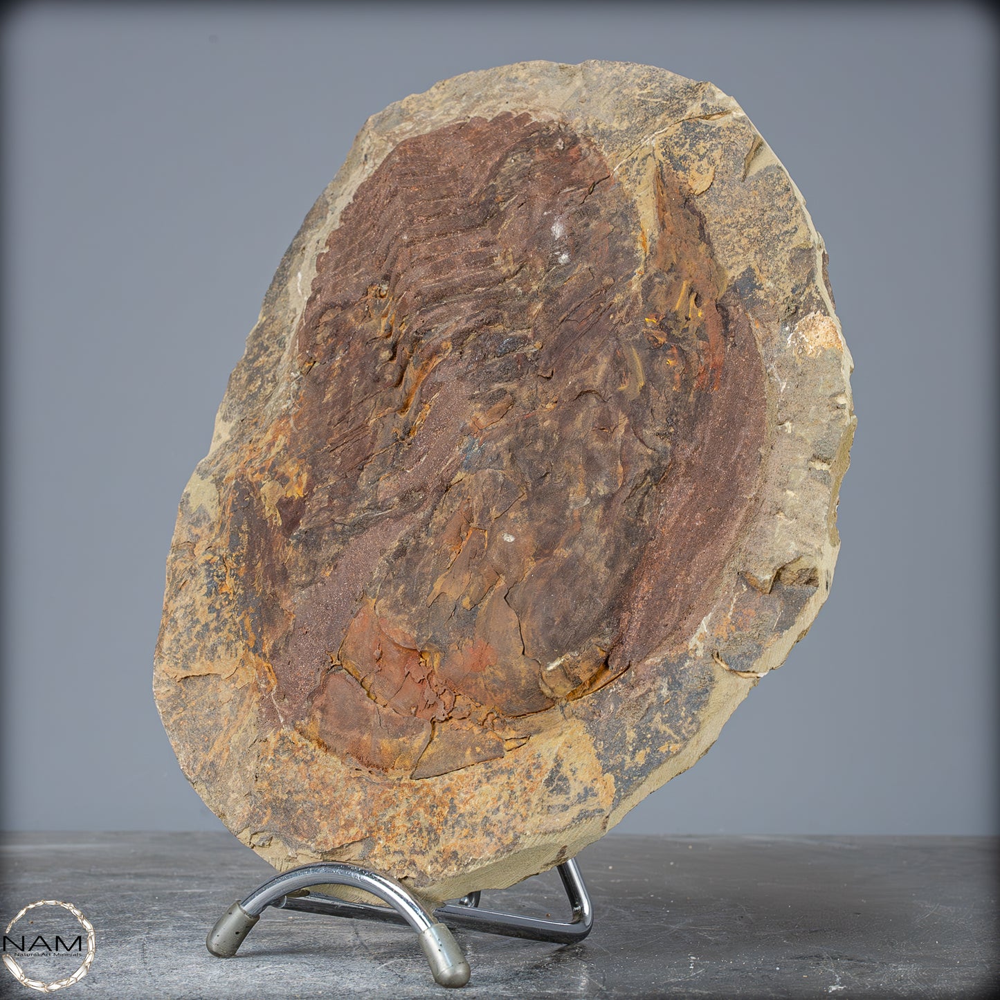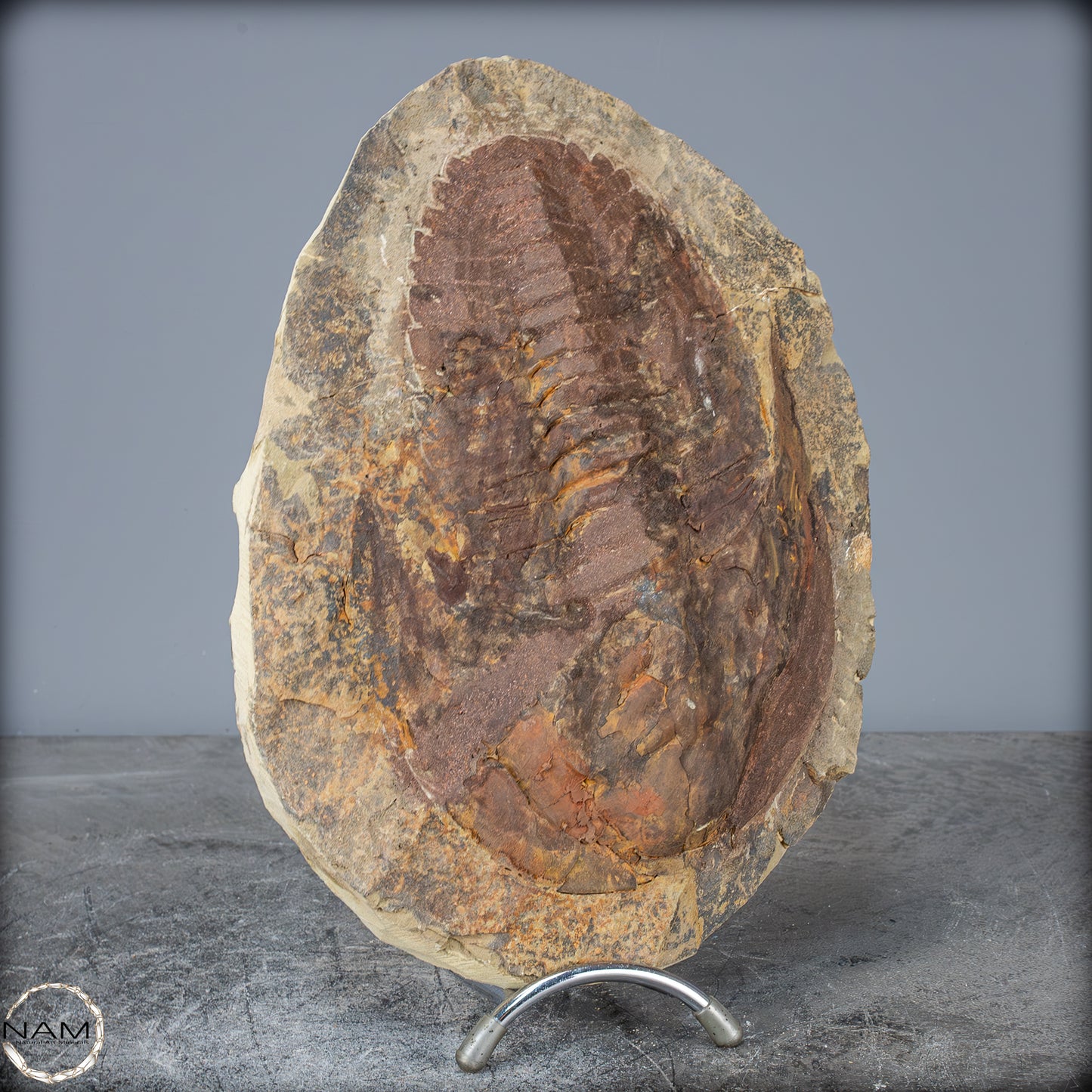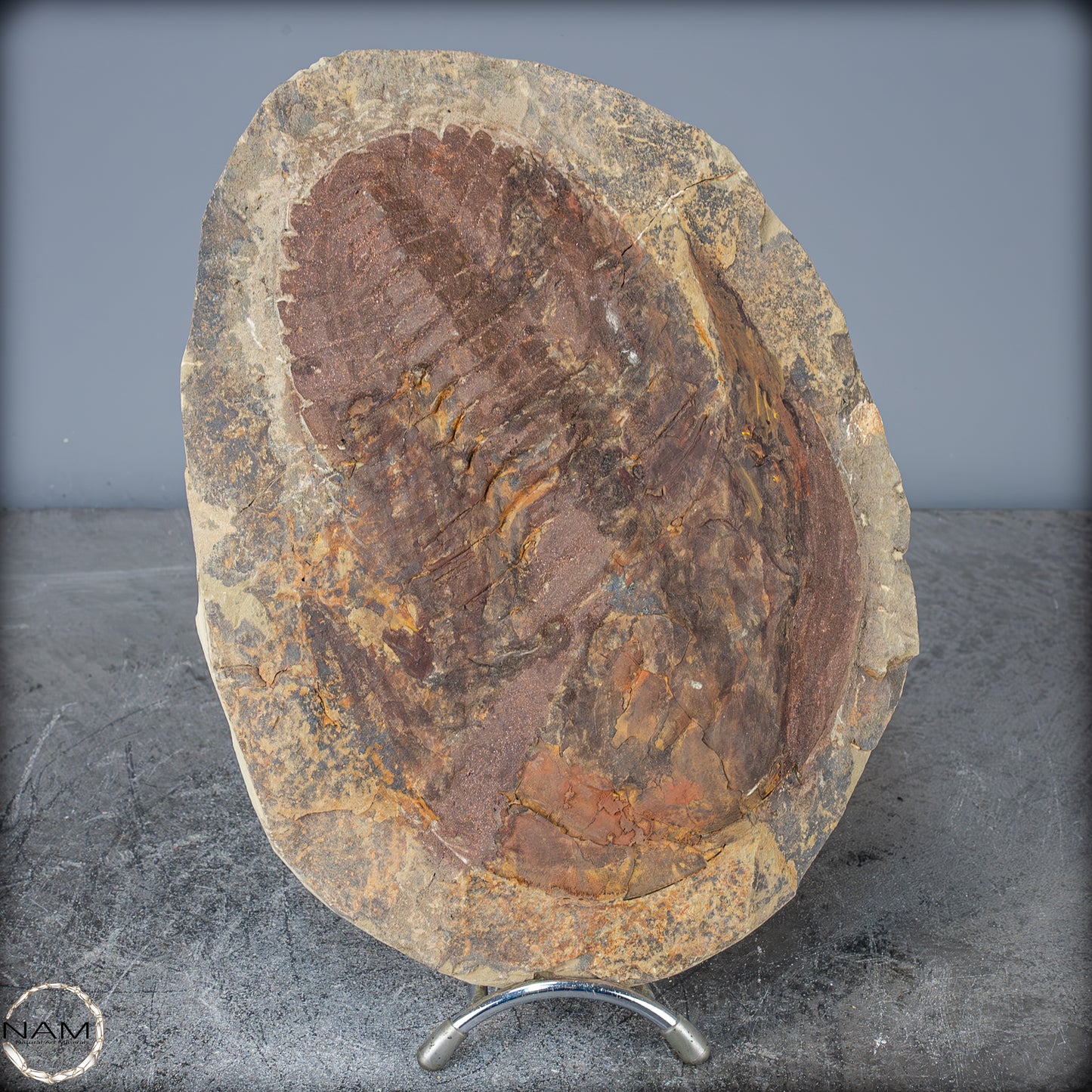 Dieses Fossil präsentiert einen beeindruckend großen Trilobiten aus Marokko, der aus der Devon-Zeit stammt und vor etwa 400 Millionen Jahren lebte. Der Trilobit zeigt eine flache Erhaltung, die seine charakteristischen Segmente und die natürliche Struktur dieses urzeitlichen Meerestieres detailreich wiedergibt. Die rotbraune Färbung der Versteinerung, kombiniert mit den gut sichtbaren Rändern und Konturen, hebt die Form und die einstige Struktur des Exoskeletts hervor.