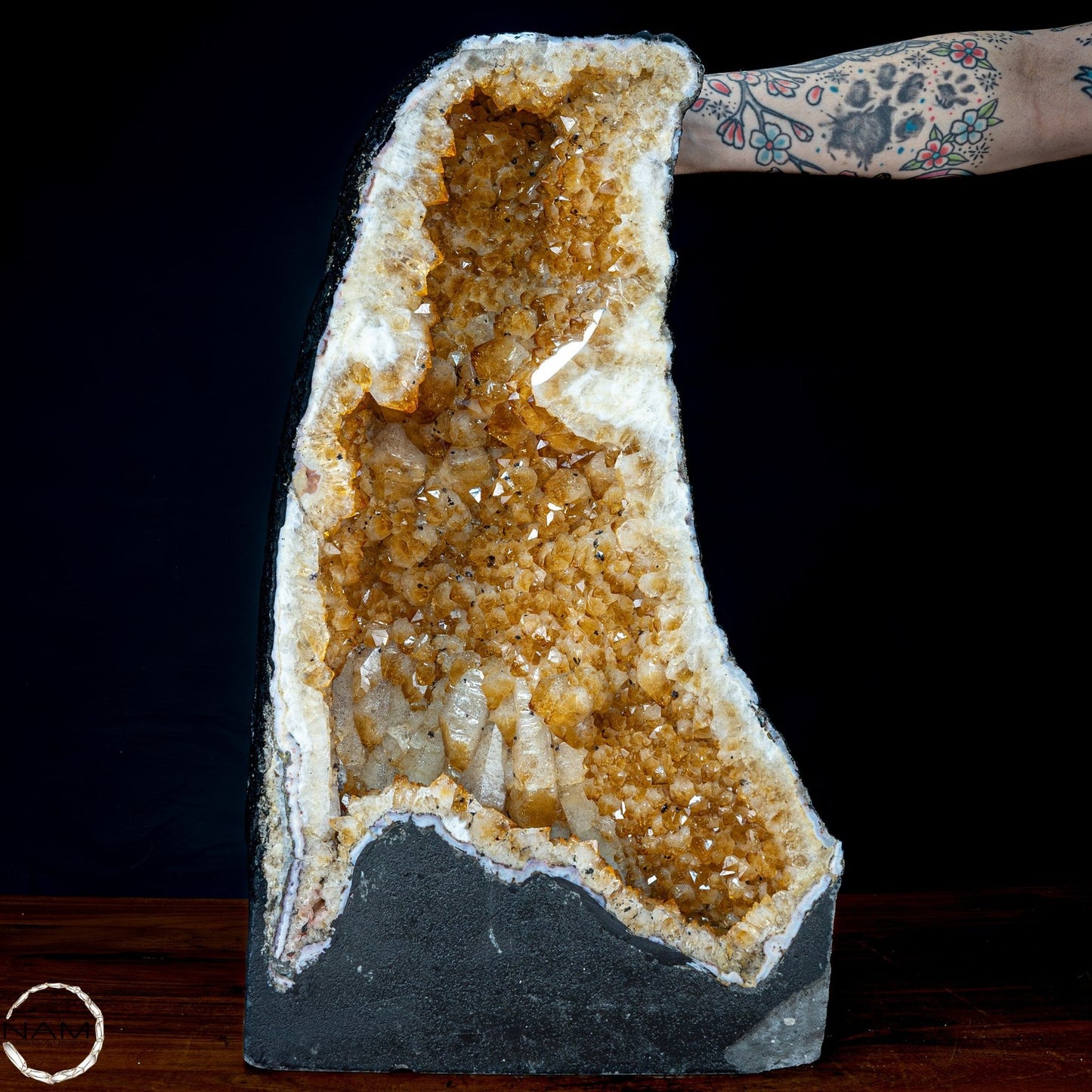Diese außergewöhnliche Citrin-Druse aus Brasilien wiegt beeindruckende 28 kg und ist ein wahres Meisterwerk der Natur. Der Citrin, eine goldene Variante des Quarzes, glänzt durch seine warmen, gelben bis goldenen Töne, die durch das Licht atemberaubend reflektieren. Die Druse ist von Natur aus hohl und wird von einer Vielzahl kleiner, funkelnder Citrinkristalle bevölkert, die auf den Wänden der Höhle emporwachsen.