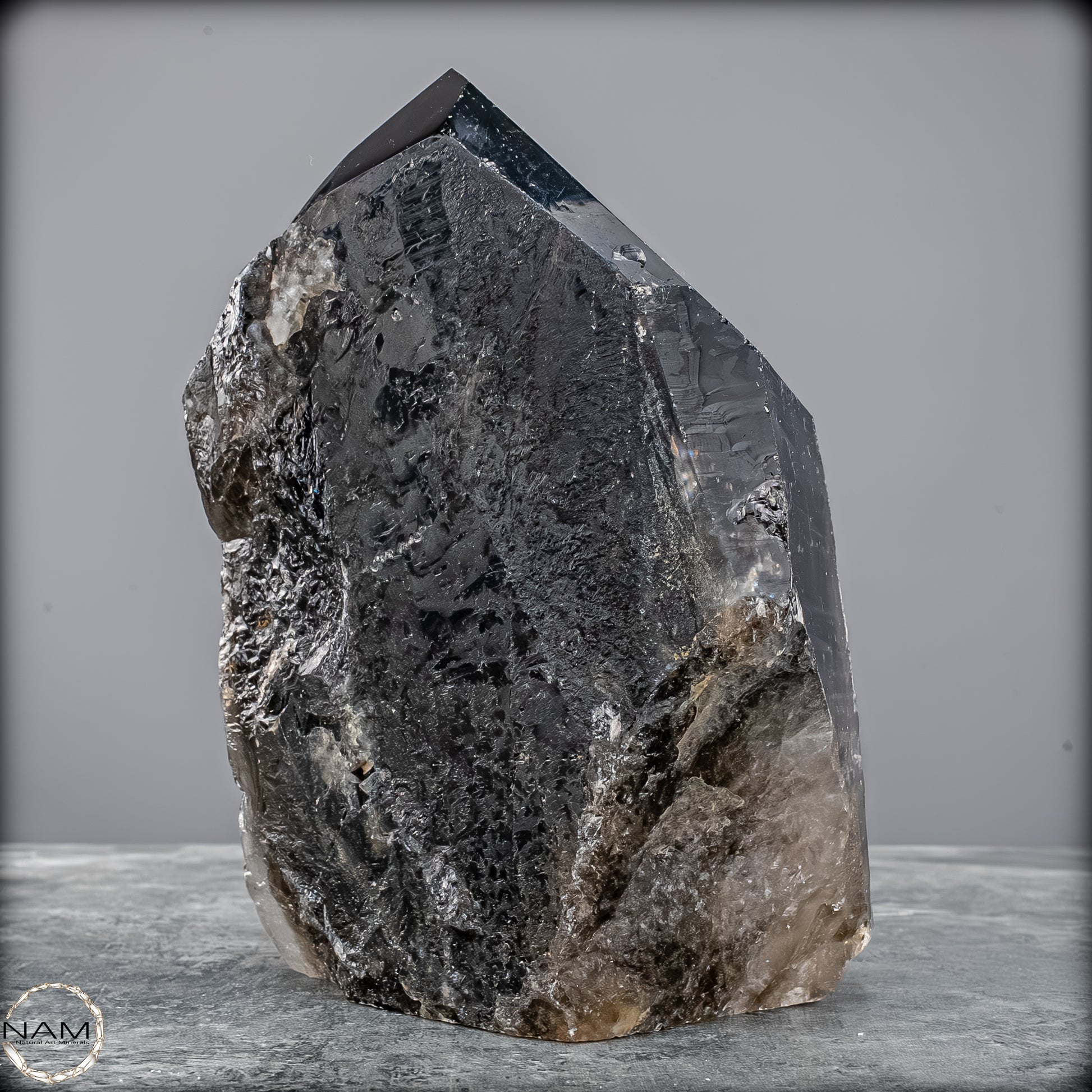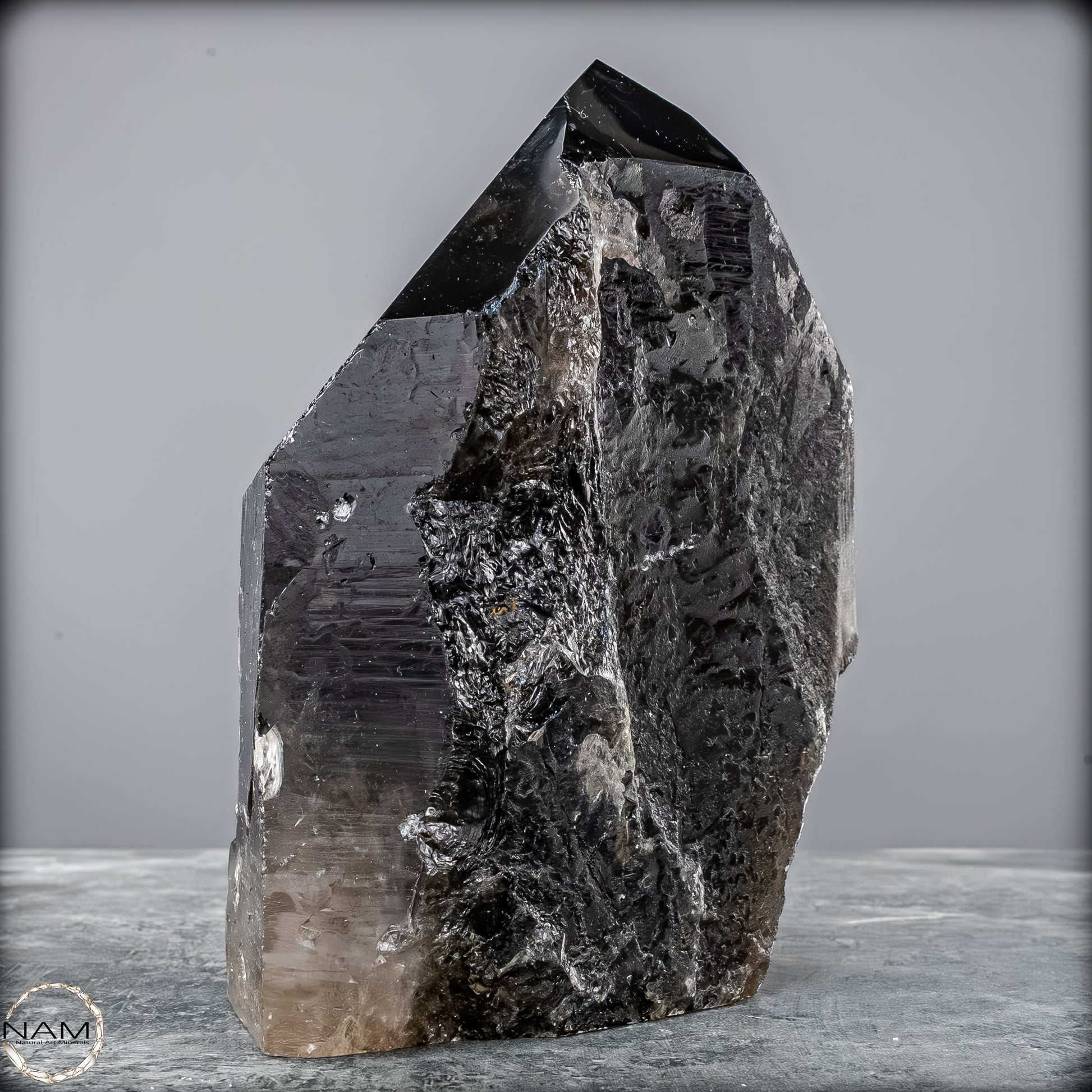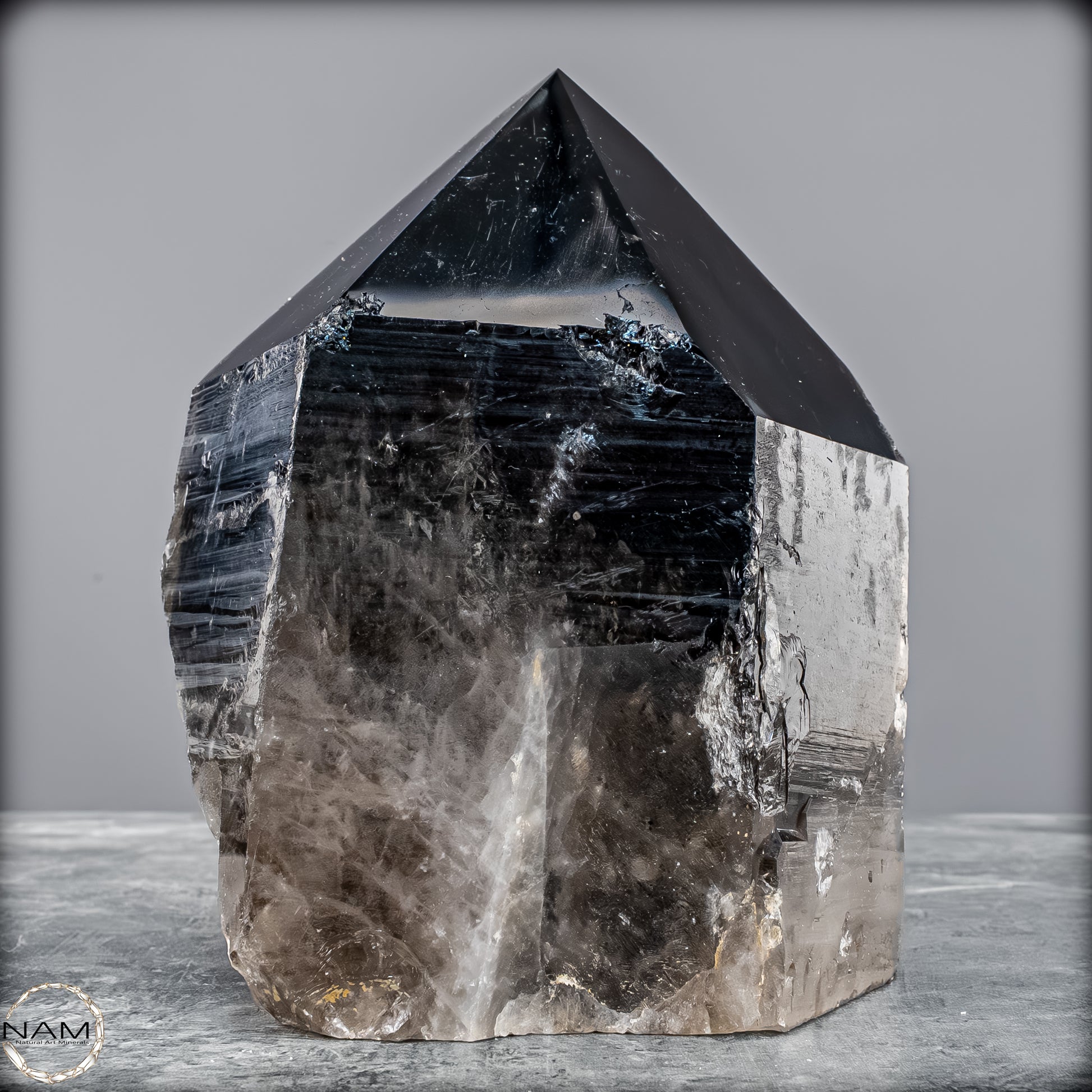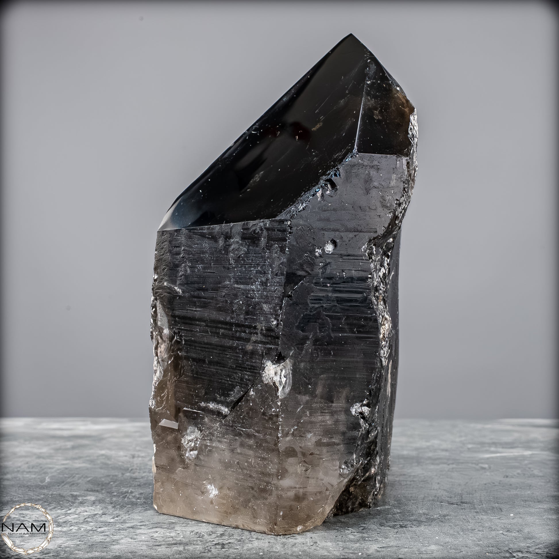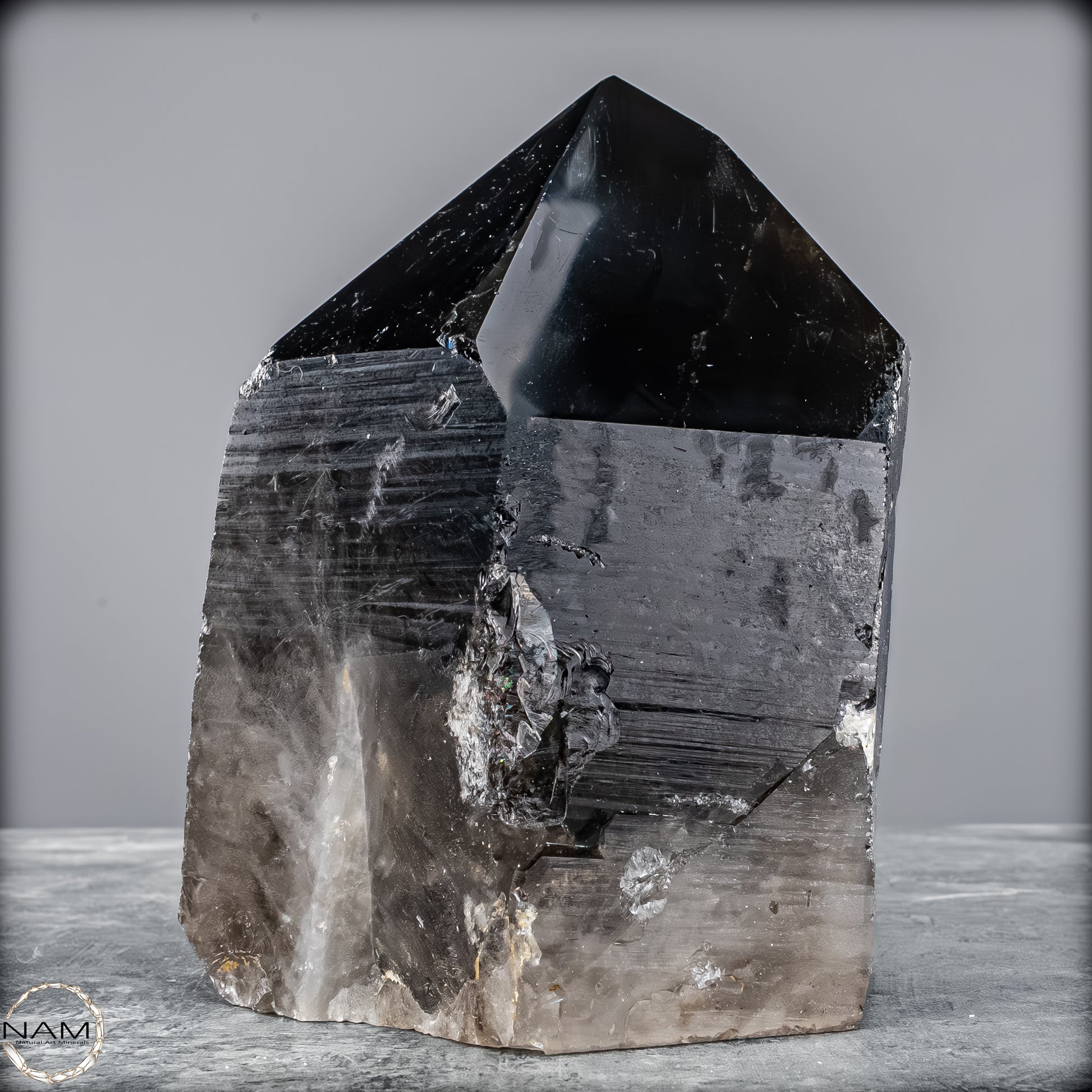 Die naturbelassene Struktur kombiniert mit der präzise geschliffenen Spitze verleiht diesem Stück eine mächtige Präsenz. Jedes Detail, jede Schicht des Kristalls erzählt von seiner langen Entstehung in der Erde – unter Druck, Hitze und Zeit geformt zu einem wahren Meisterwerk der Natur.