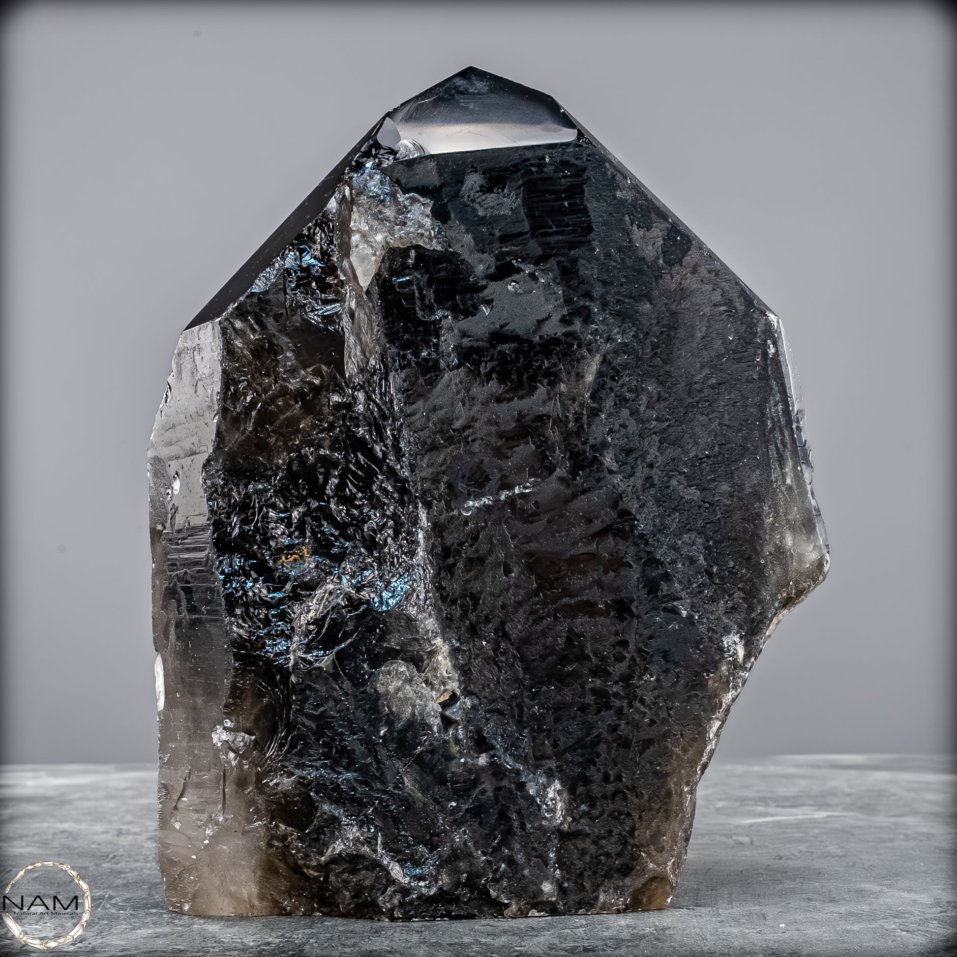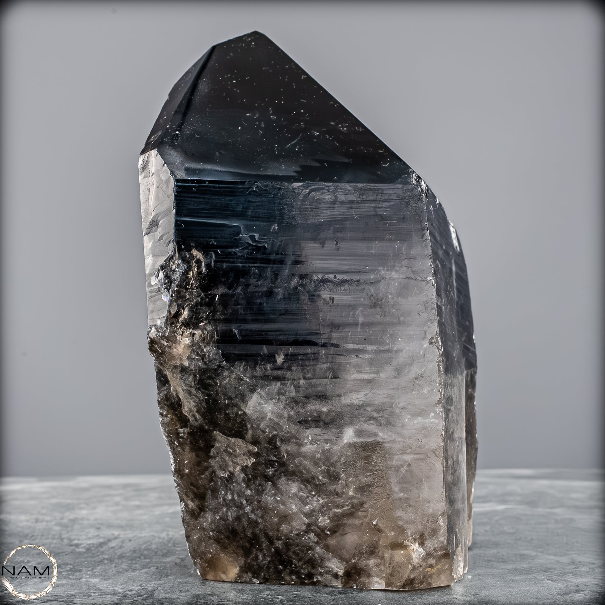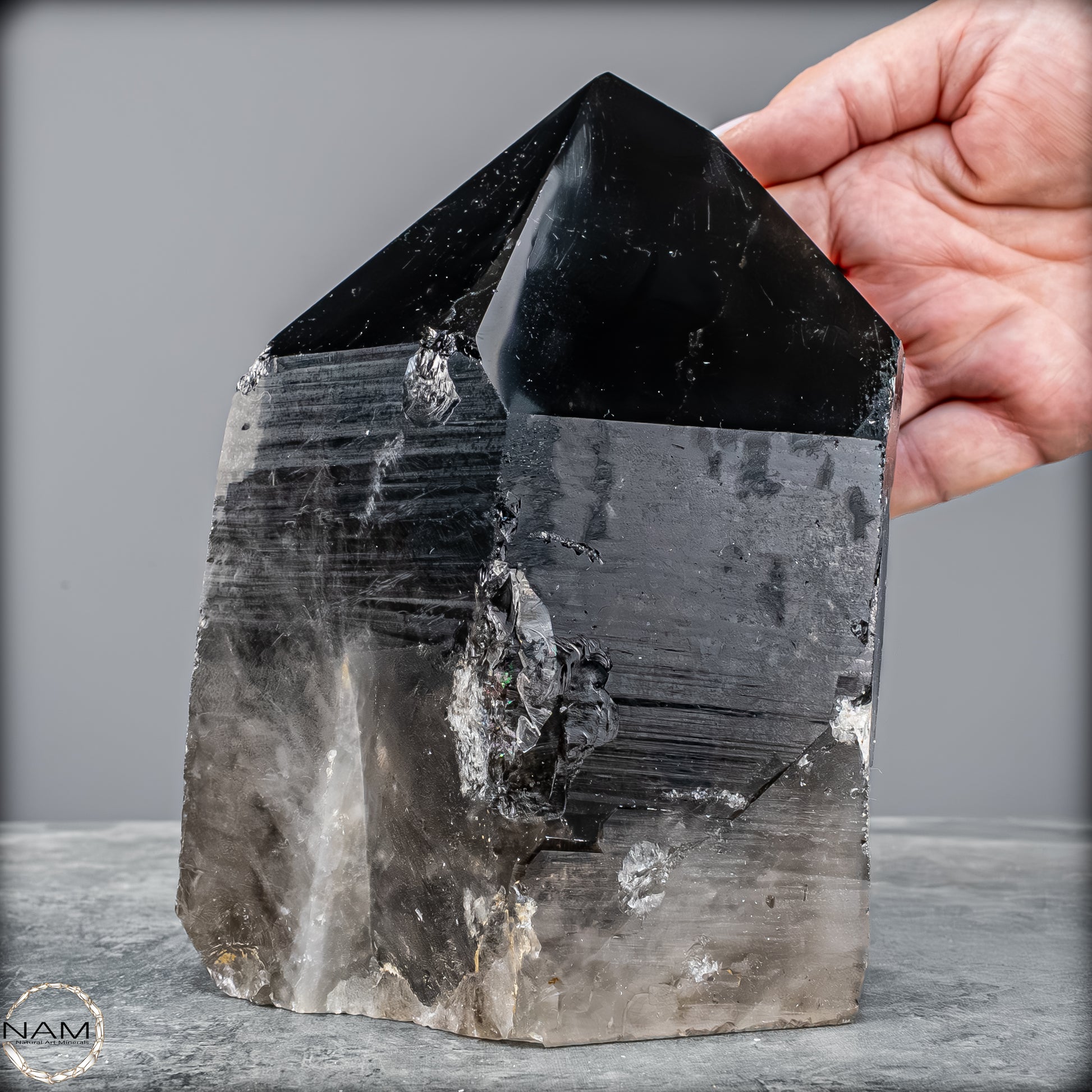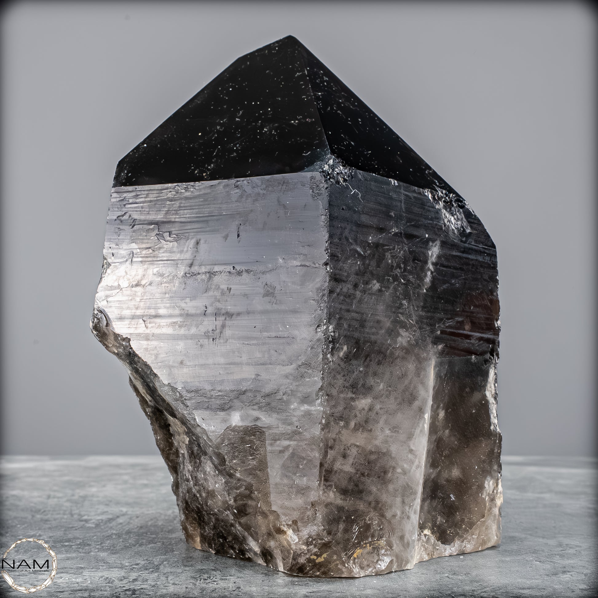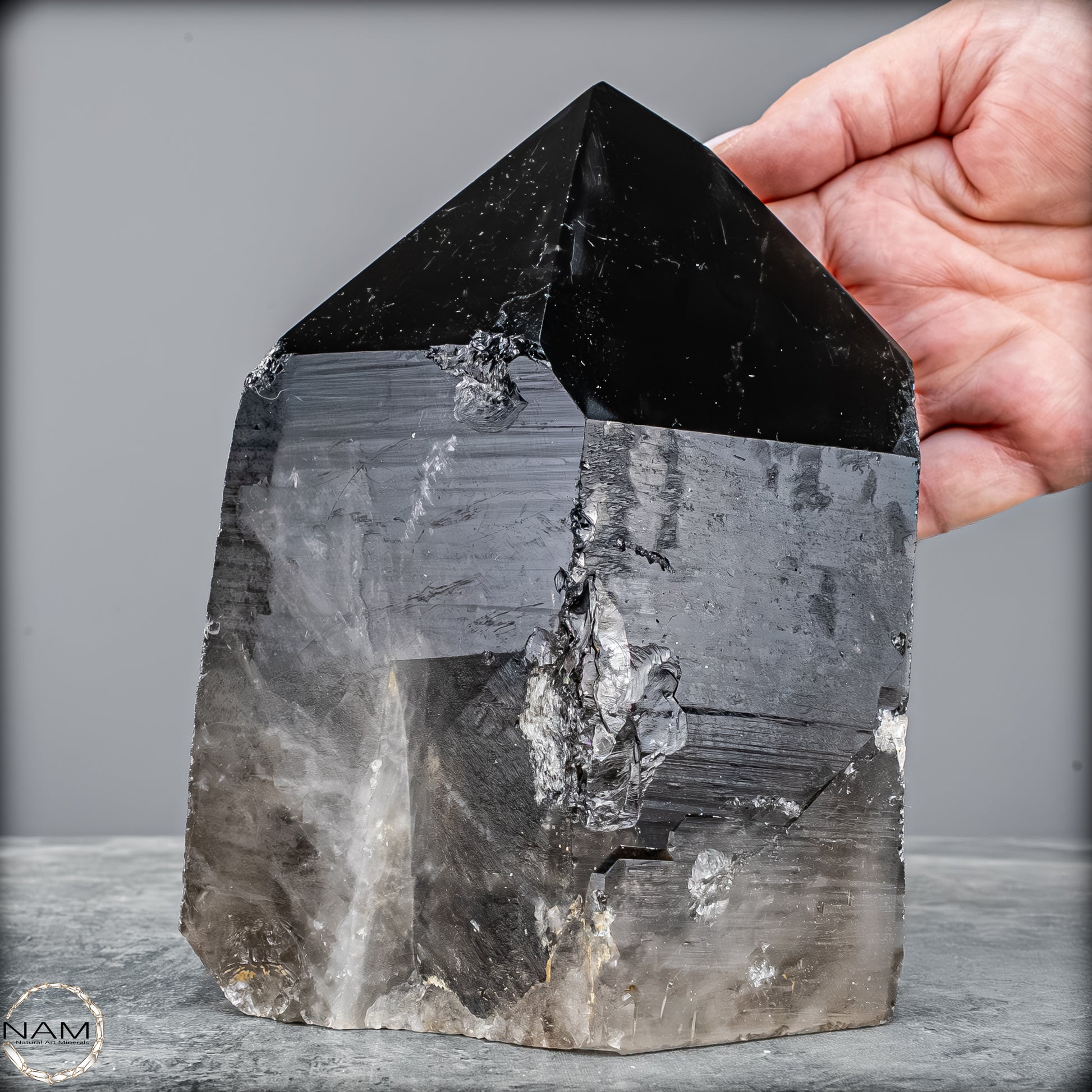 Diese eindrucksvolle Rauchquarz-Spitze mit einem Gewicht von 2,4 Kilogramm ist ein Symbol für Stärke, Schutz und Erdverbundenheit. Der tiefbraune bis fast schwarze Verlauf im oberen Bereich geht sanft in einen klaren, rauchigen Kristallkörper über – ein faszinierendes Spiel aus Licht, Transparenz und Tiefe.