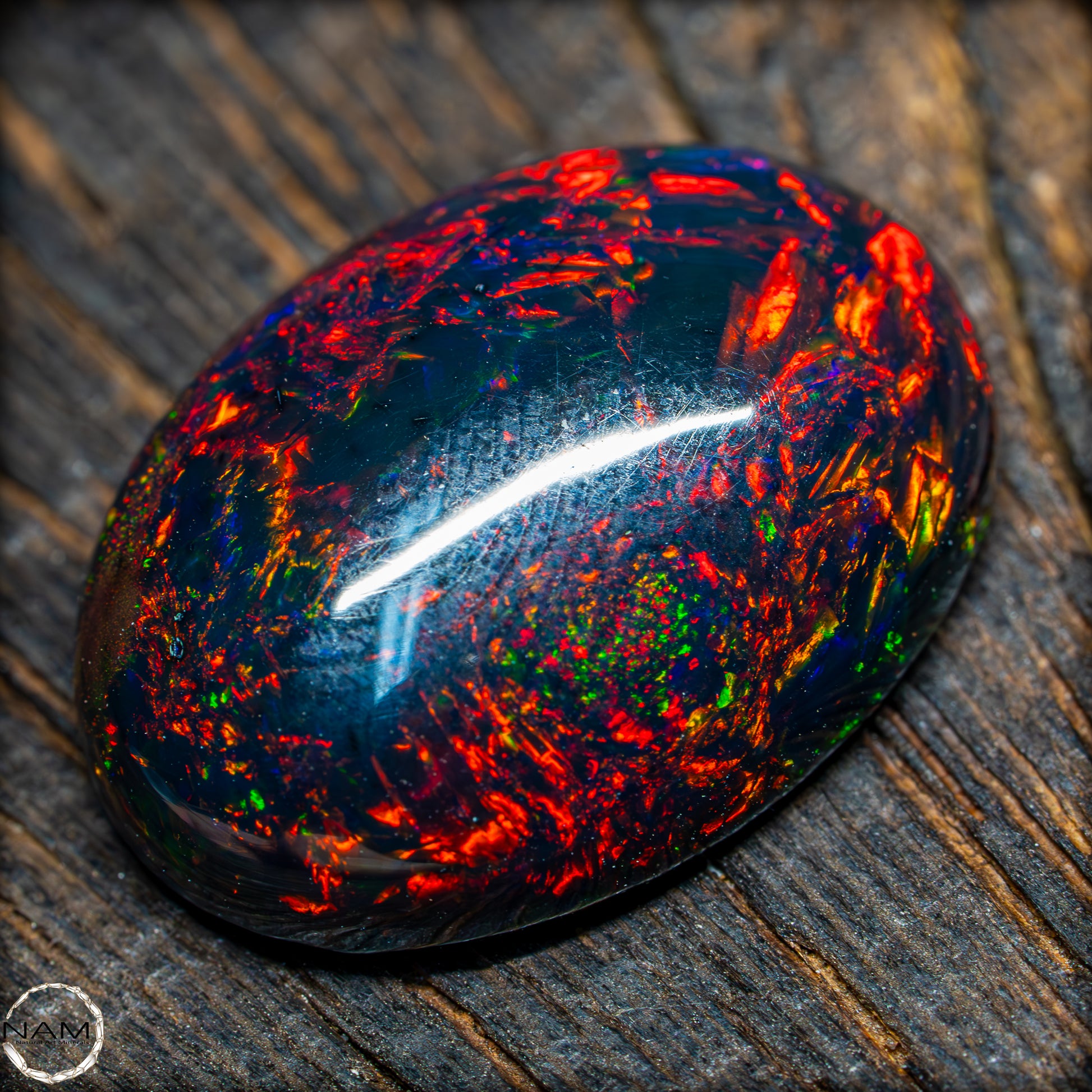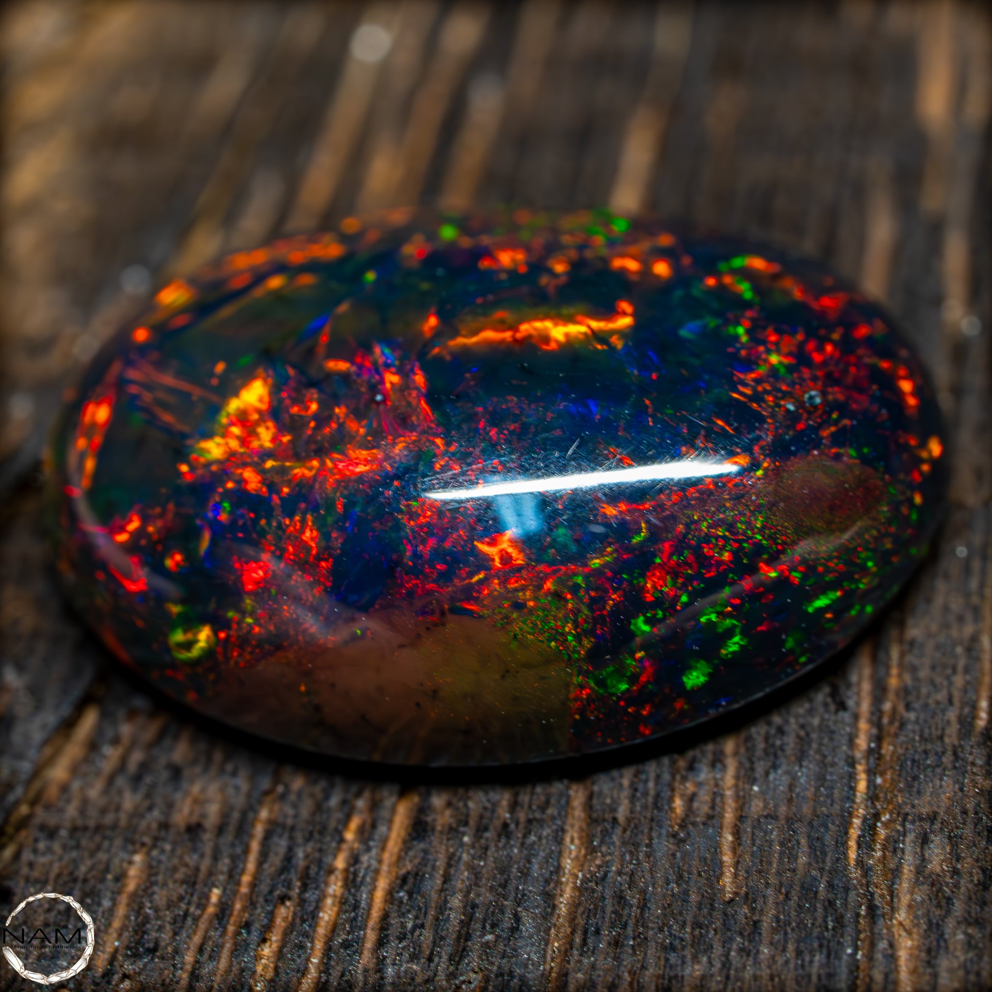 Dieser außergewöhnliche Black Opal Cabochon besticht durch seine intensive Farbbrillanz, die in einem faszinierenden Spiel aus tiefen Blau-, Grün-, Rot- und Orangetönen erstrahlt. Der Cabochon hat eine glatte, hochglanzpolierte Oberfläche, die das lebendige Farbenspiel in allen Nuancen zur Geltung bringt. Diese seltene Schönheit eignet sich perfekt als Highlight für ein individuelles Schmuckstück oder als wertvolles Sammlerobjekt. Seine große Größe und die außergewöhnliche Qualität des Opals machen ihn zu einem beeindruckenden Edelstein, der in jeder Sammlung herausragt.