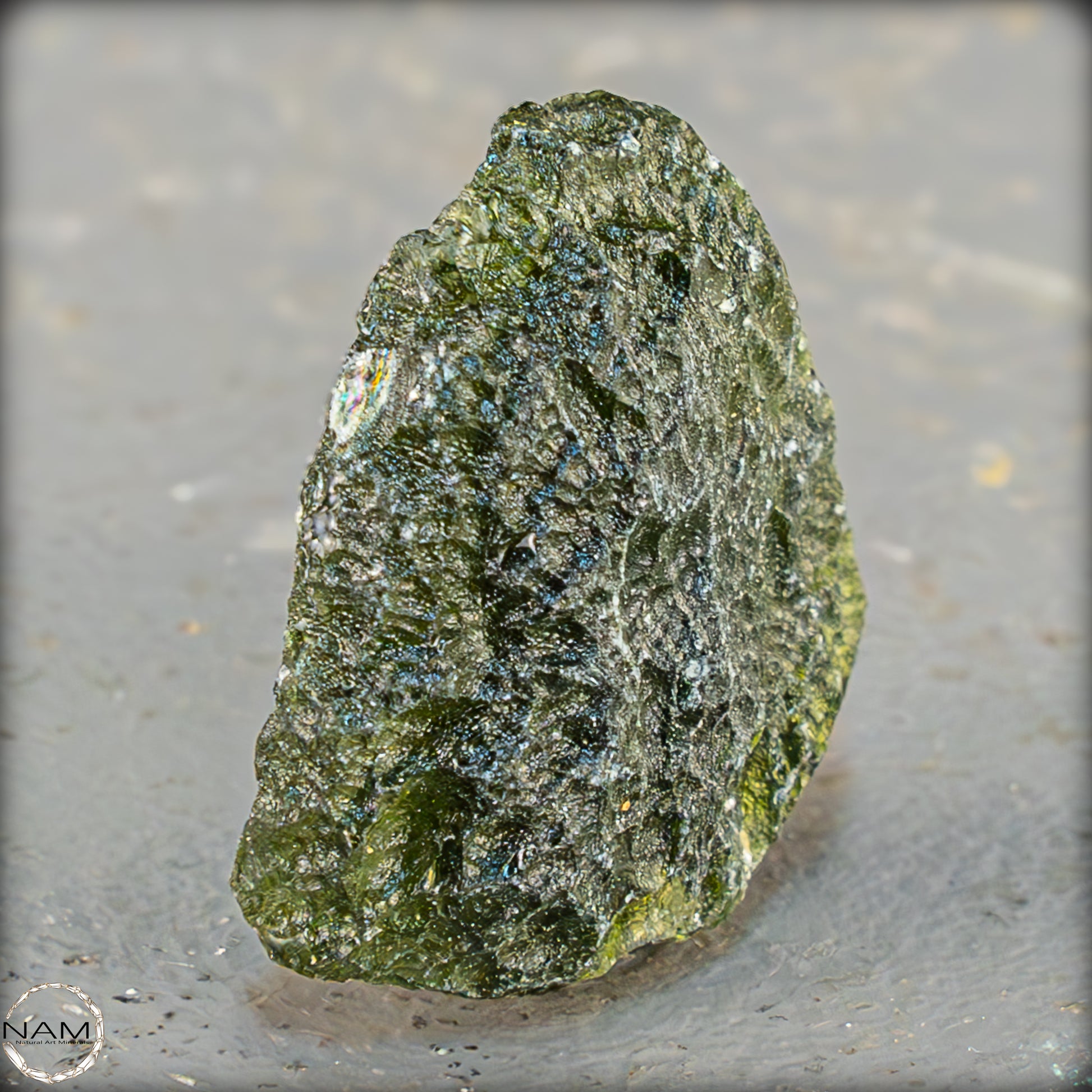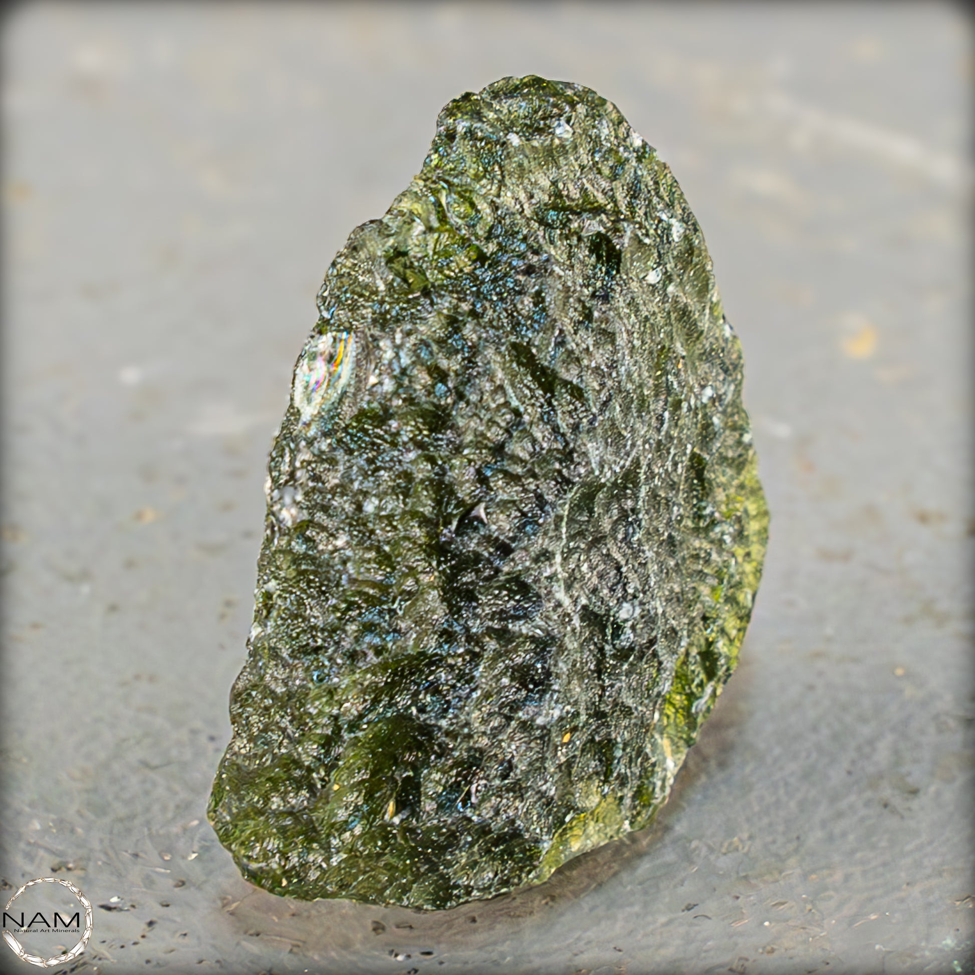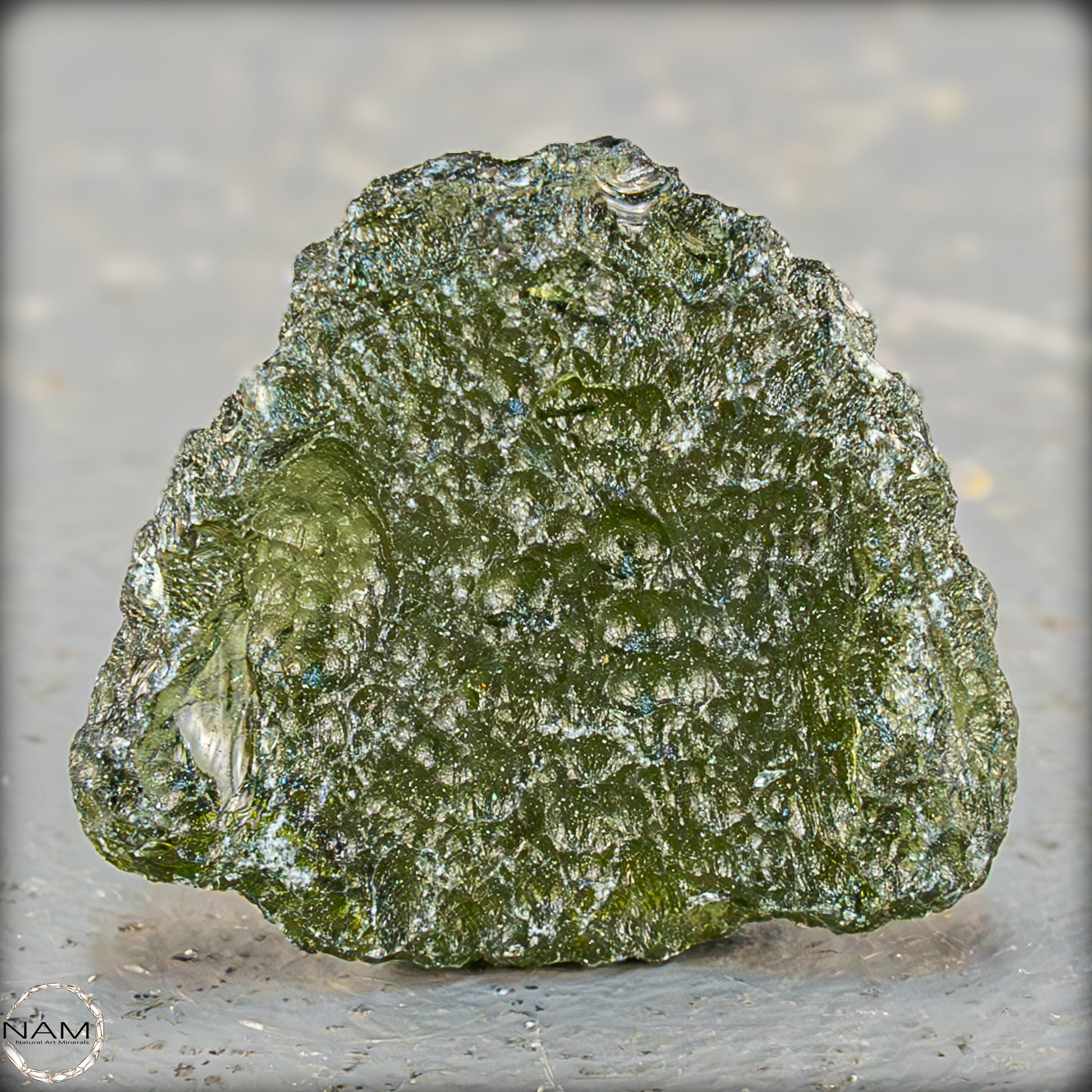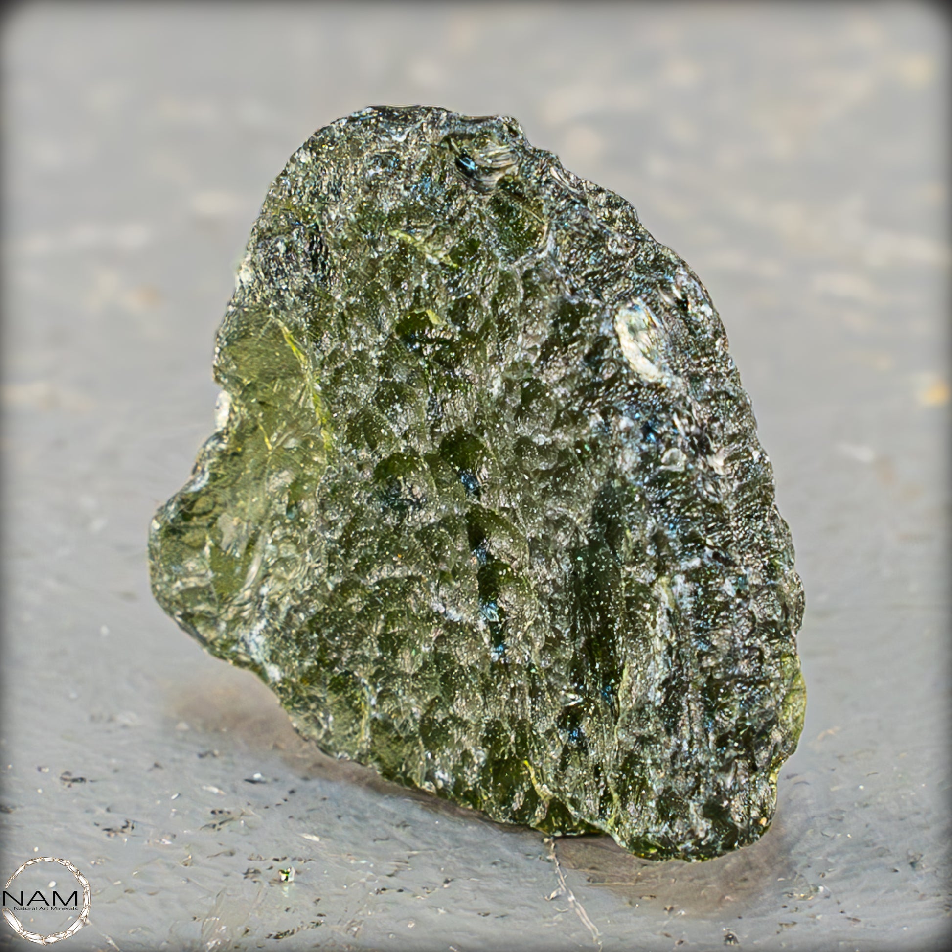 Dieses außergewöhnliche Moldavit-Exemplar aus der Tschechischen Republik besticht durch seine intensive oliv- bis moosgrüne Färbung und die charakteristische, stark geätzte Oberfläche. Die natürliche Tropfenstruktur mit ihrer skulpturalen Textur lässt das Licht in feinen Wellen und Einschmelzungen tanzen und unterstreicht den glasartigen Ursprung dieses Tektits. Besonders eindrucksvoll zeigt sich das Stück im Gegenlicht, wo seine Transparenz in leuchtendem Grün durchscheint und seine außerirdische Herkunft visuell greifbar wird.