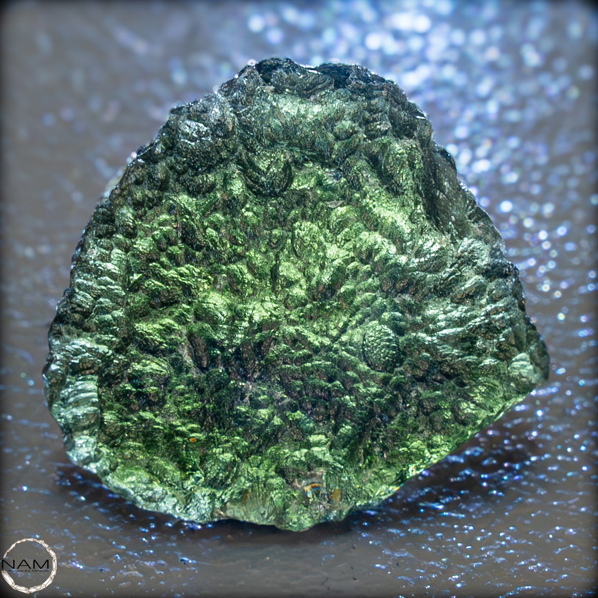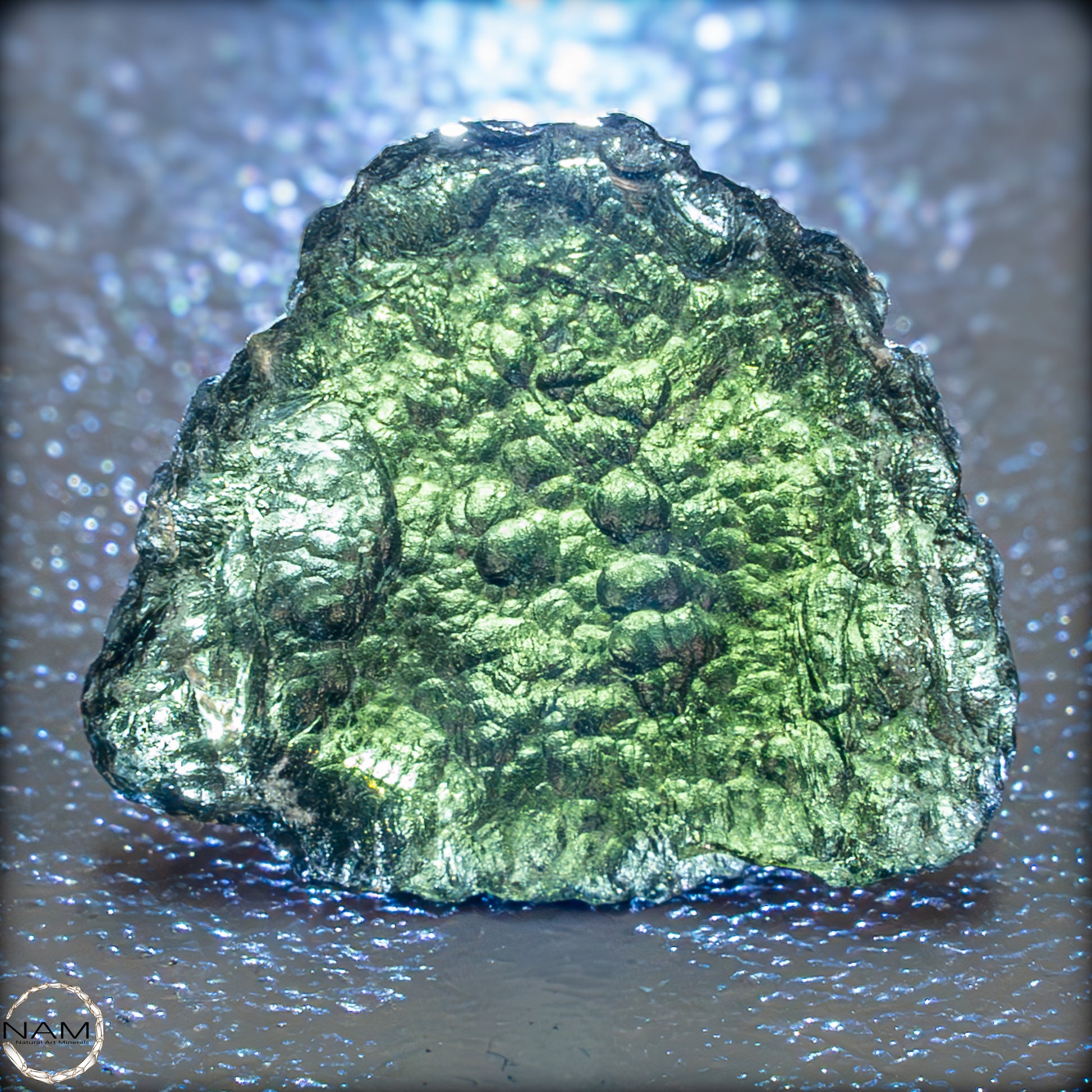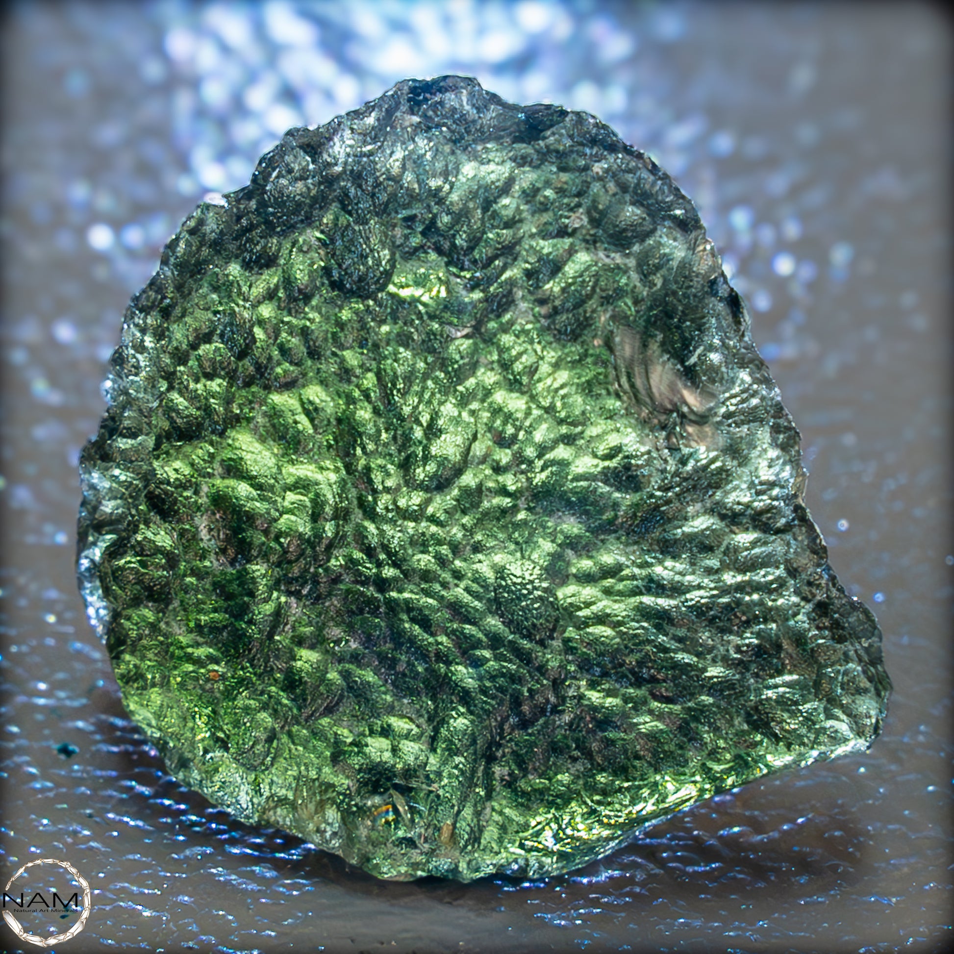 Moldavit, entstanden beim Einschlag eines Meteoriten vor etwa 15 Millionen Jahren, gilt als Träger transformierender Energie. Ihm wird nachgesagt, tiefgreifende Veränderungsprozesse zu unterstützen und den Zugang zu höherem Bewusstsein zu fördern. Dieses Exemplar verbindet auf eindrucksvolle Weise kosmische Geschichte mit ästhetischer Klarheit – ein faszinierendes Stück Natur und Energie.