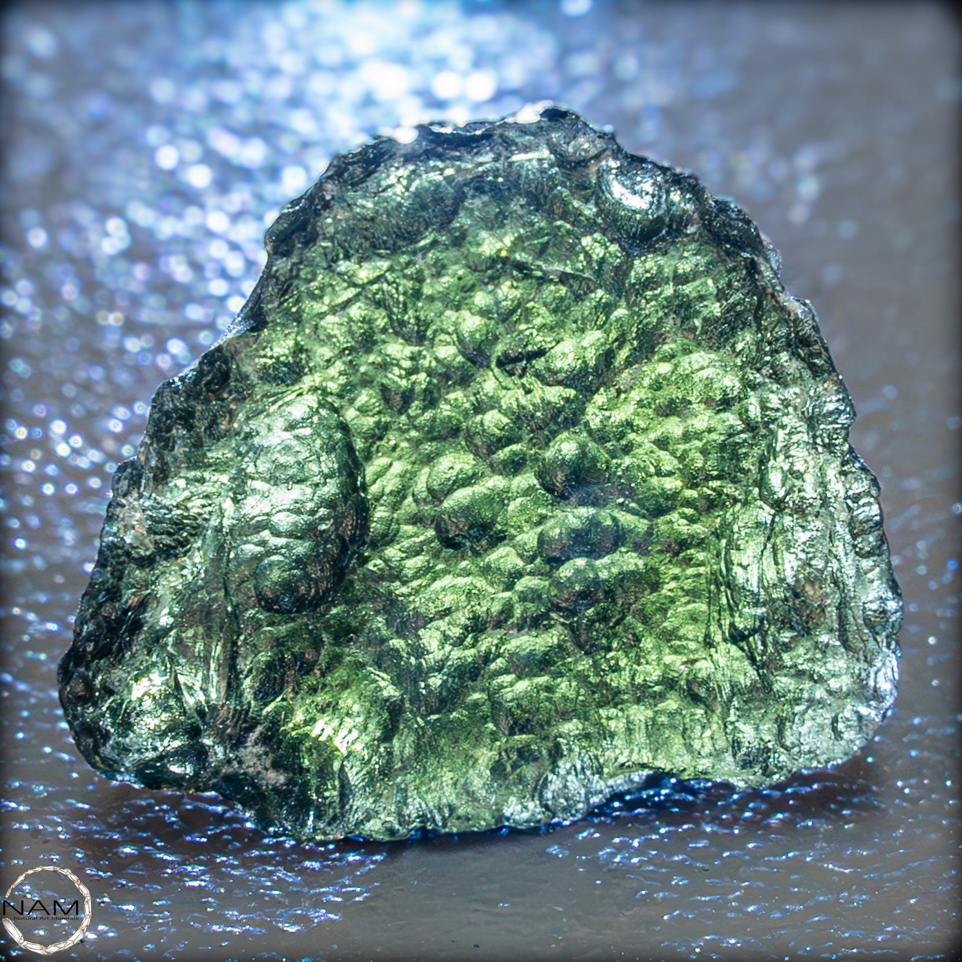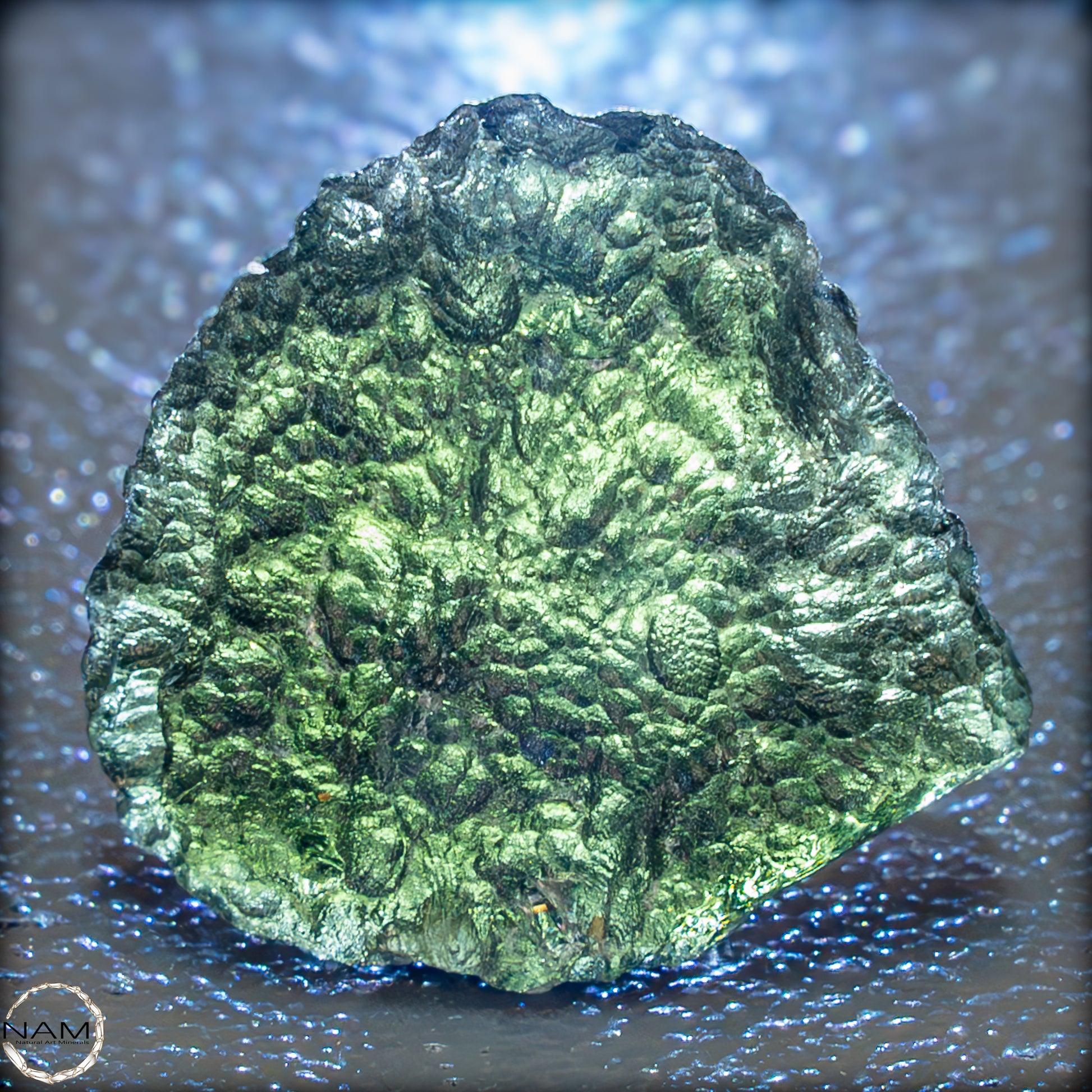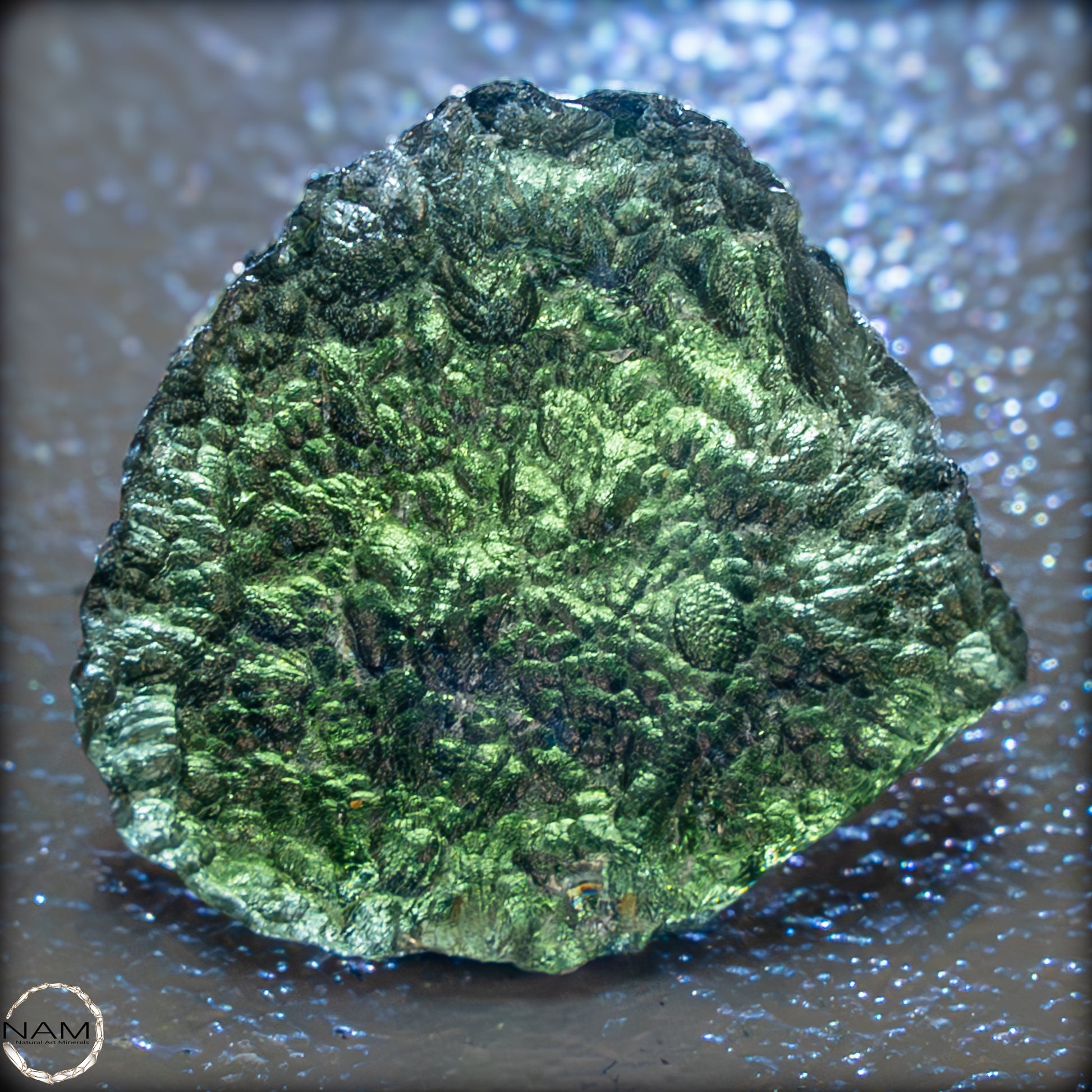 Moldavit, entstanden beim Einschlag eines Meteoriten vor etwa 15 Millionen Jahren, gilt als Träger transformierender Energie. Ihm wird nachgesagt, tiefgreifende Veränderungsprozesse zu unterstützen und den Zugang zu höherem Bewusstsein zu fördern. Dieses Exemplar verbindet auf eindrucksvolle Weise kosmische Geschichte mit ästhetischer Klarheit – ein faszinierendes Stück Natur und Energie.