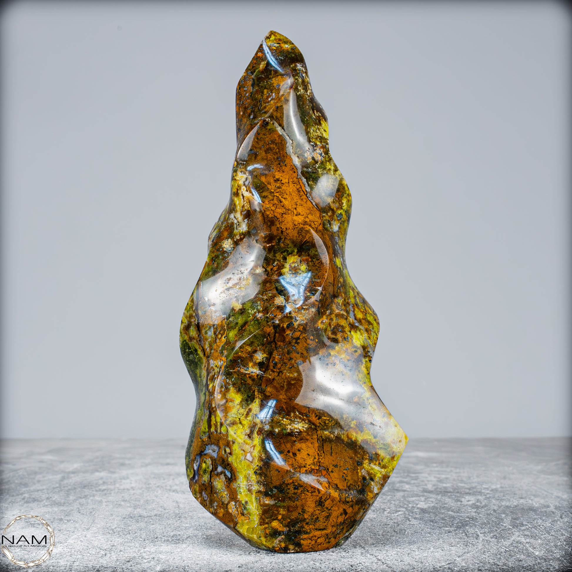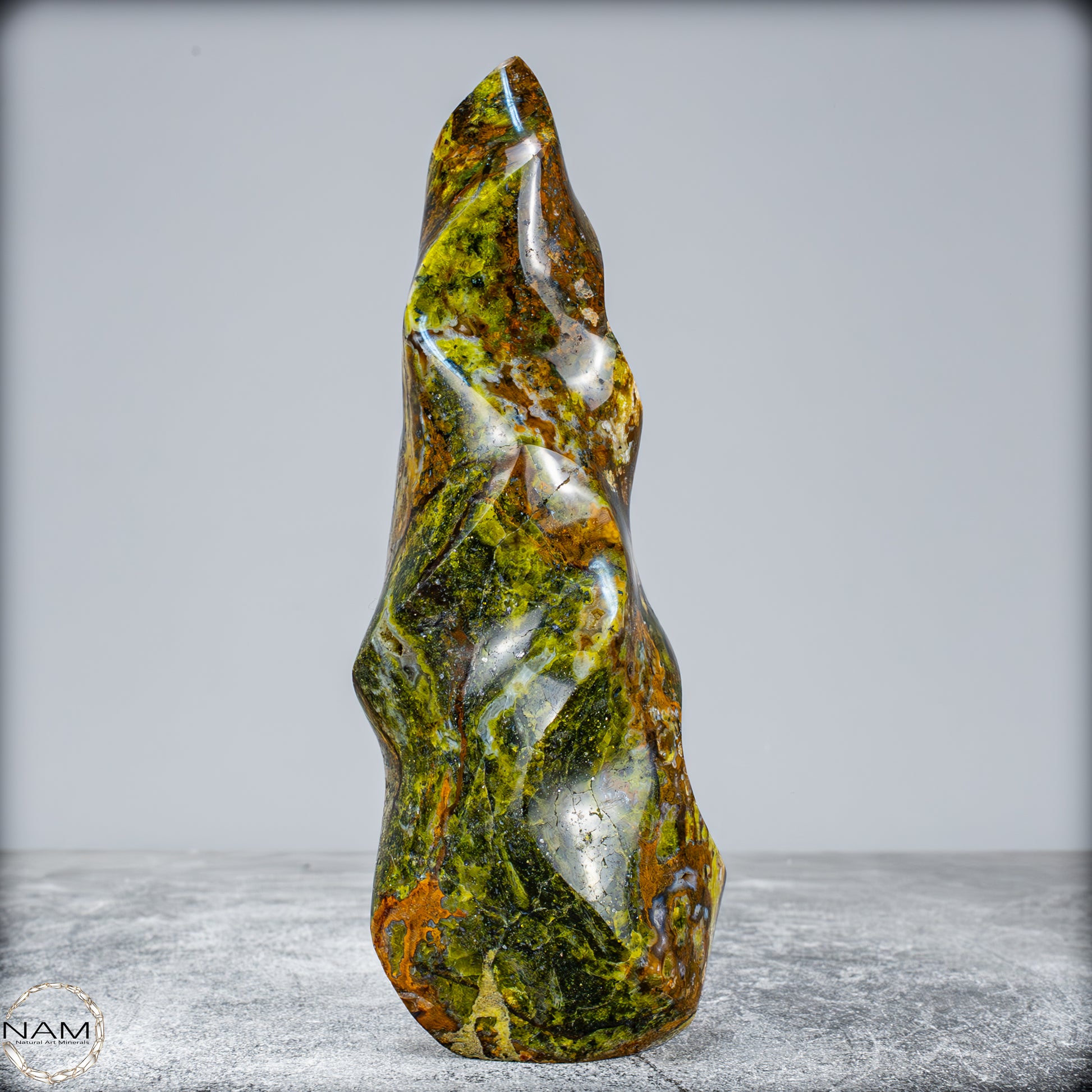 Das ist ein wunderschön polierter grüner Opal in Flammenform. Grüner Opal ist ein seltener Edelstein, der für seine beruhigenden Grüntöne bekannt ist – oft durchsetzt mit braunen oder gelblichen Einschlüssen, wie hier sichtbar. Er steht symbolisch für Erneuerung, emotionale Heilung und Herzöffnung und wird oft mit dem Herzchakra in Verbindung gebracht.