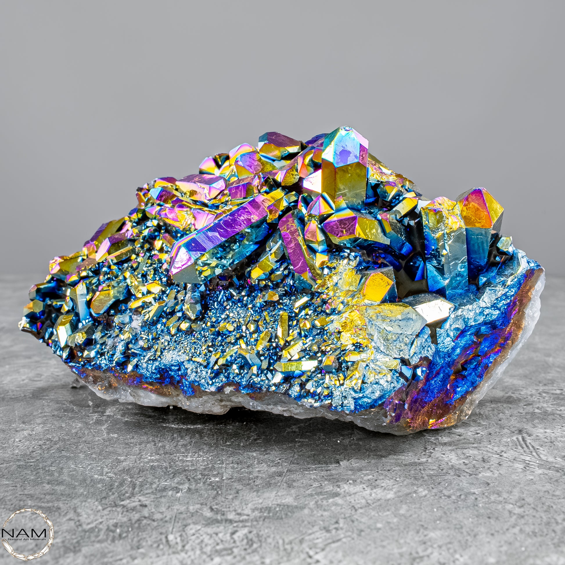Dieser spektakuläre Aura Cluster ist ein wahrer Blickfang – ein Kunstwerk aus Licht, Farbe und Energie. Die intensiv schimmernden Kristalle in leuchtenden Tönen von Blau, Gold, Violett und Pink entstehen durch die Verbindung von natürlichem Quarz mit Edelmetallen wie Titan oder Gold. Durch diese Veredelung entsteht die charakteristische, irisierende Oberfläche, die an das Schillern einer Regenblase erinnert.