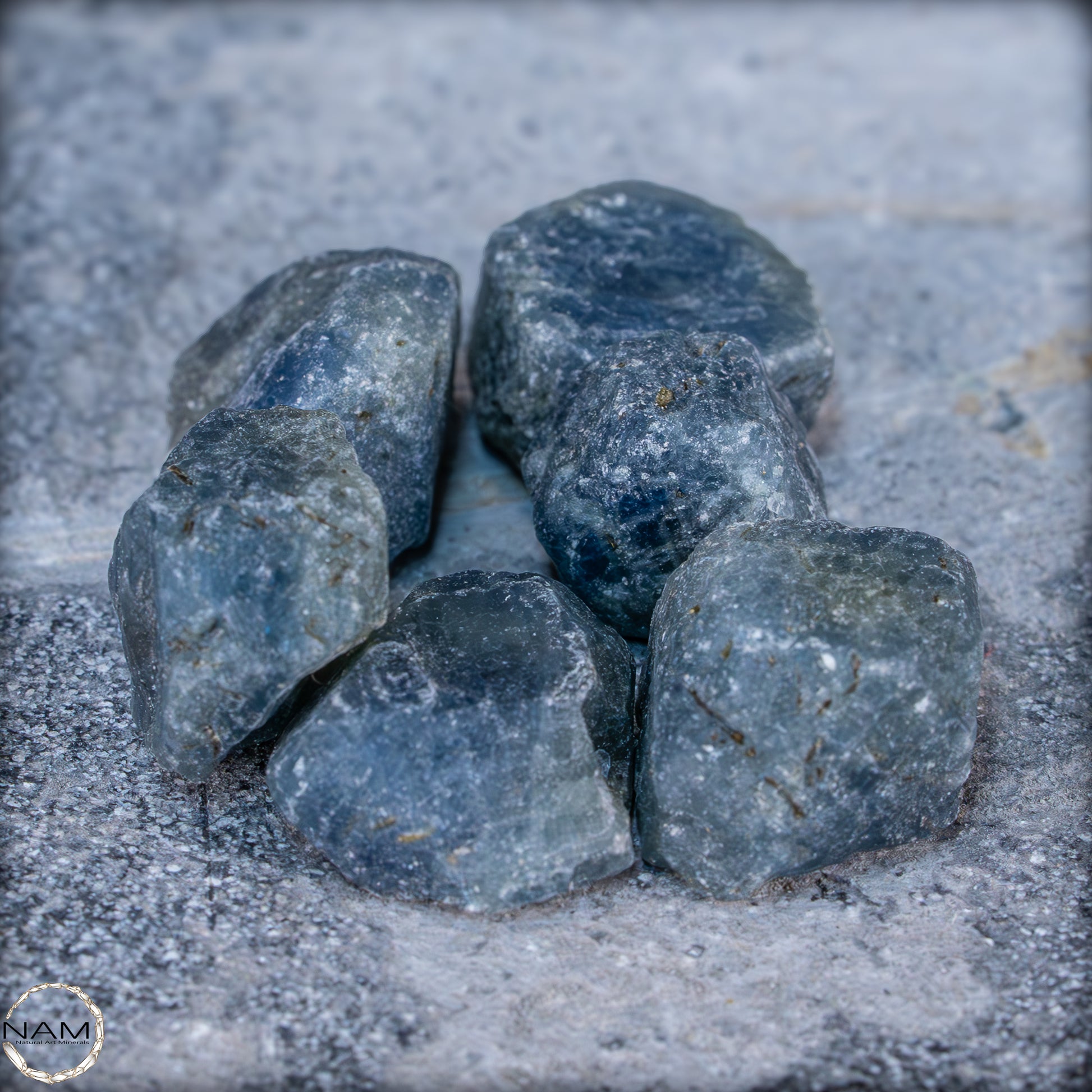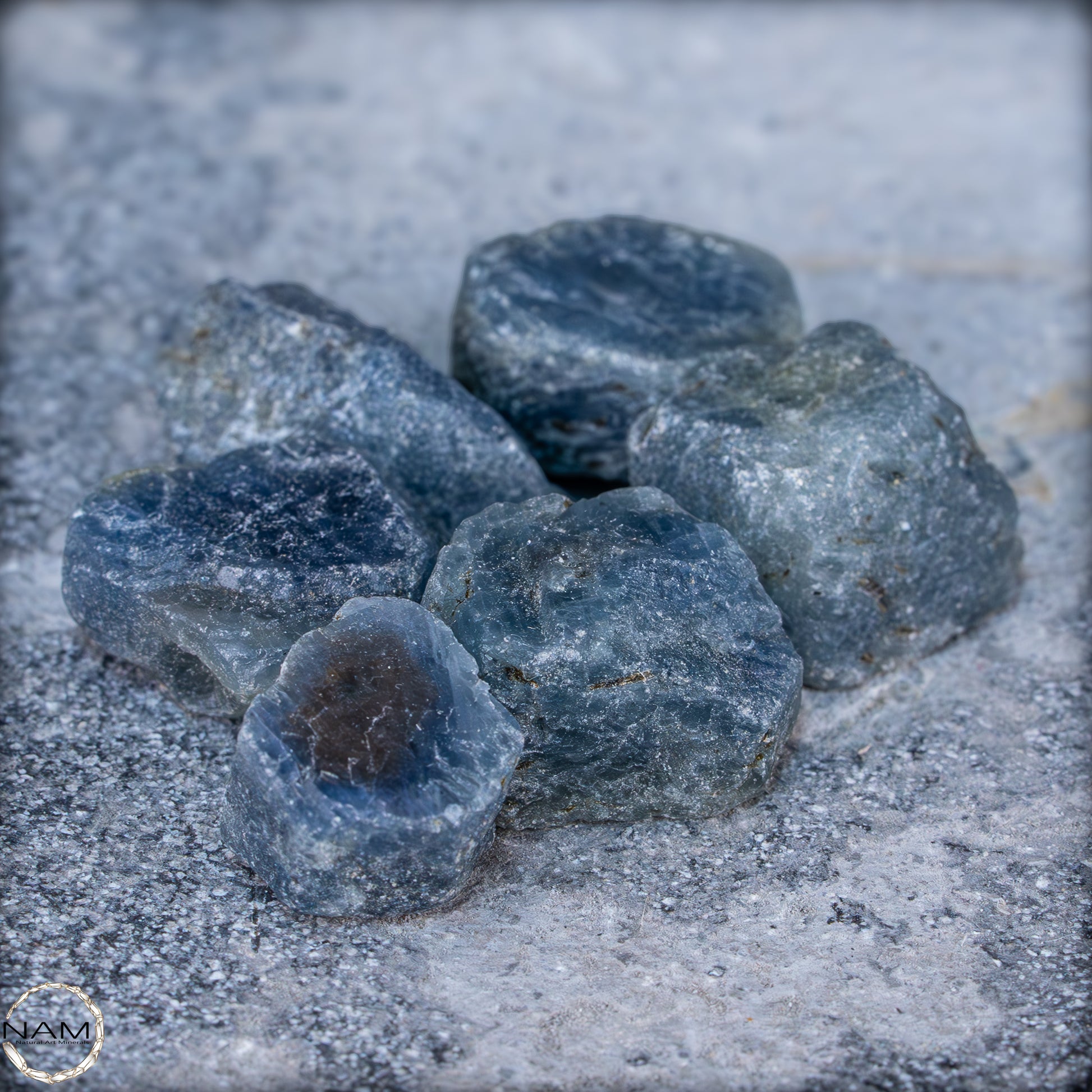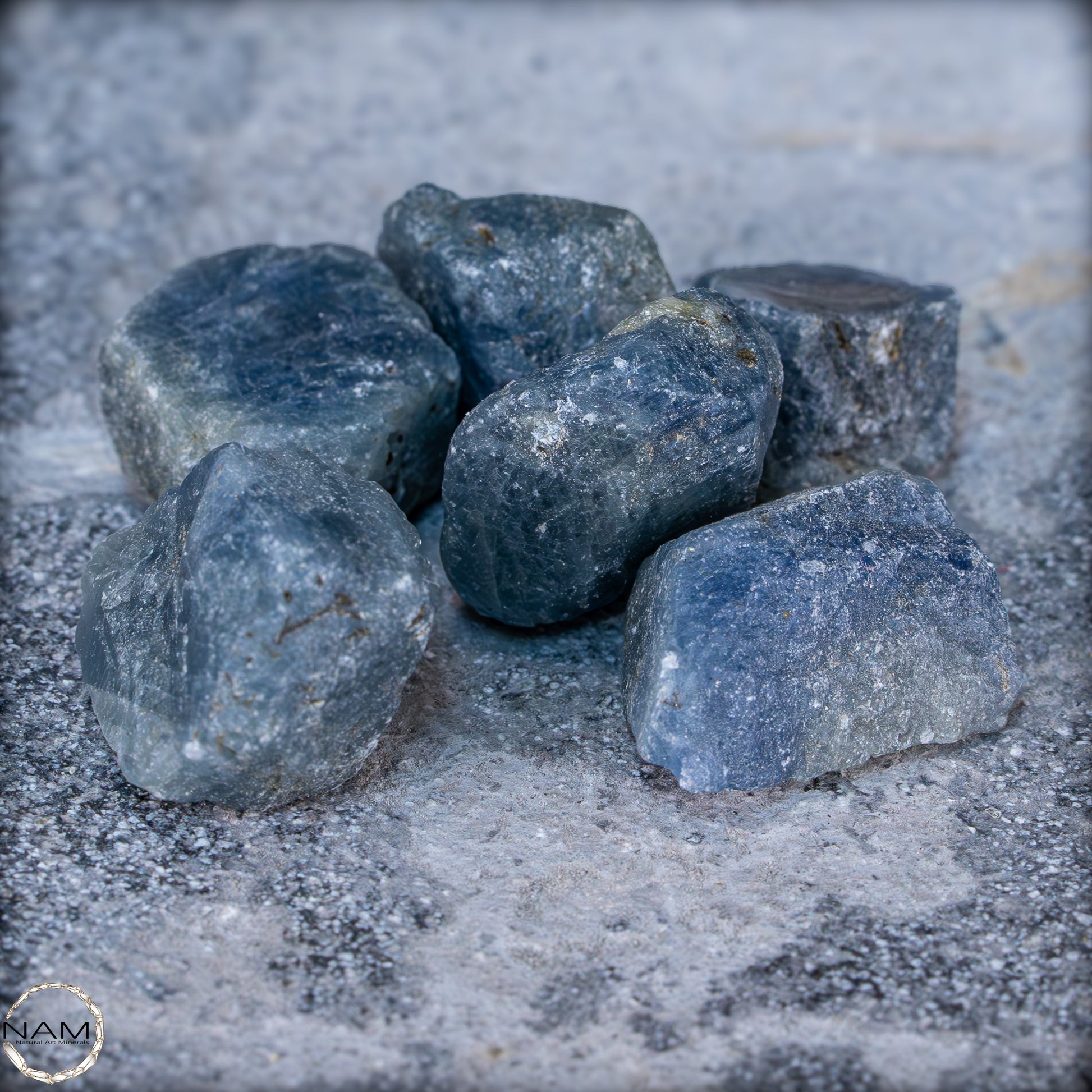 Dieses Saphir-Los zeigt eine faszinierende Auswahl an Rohkristallen in unterschiedlichen Größen und Formen. Die Stücke präsentieren sich in einem tiefen, leicht graublauen bis intensiv kornblumenblauen Farbspektrum. Besonders im durchscheinenden Licht offenbaren einzelne Steine ihre innere Leuchtkraft mit strahlend blauen Glanzpunkten, die den edlen Charakter des Minerals hervorheben.