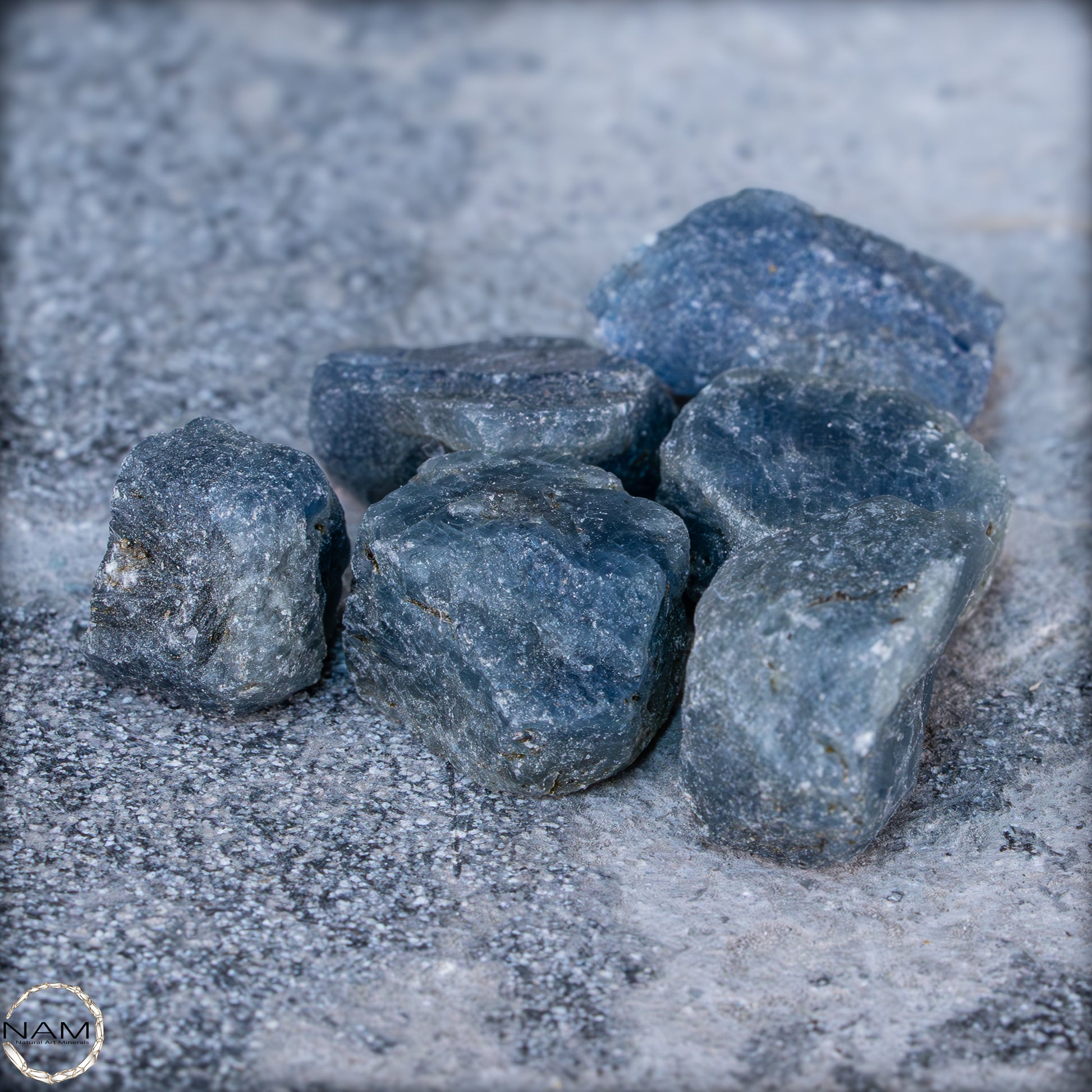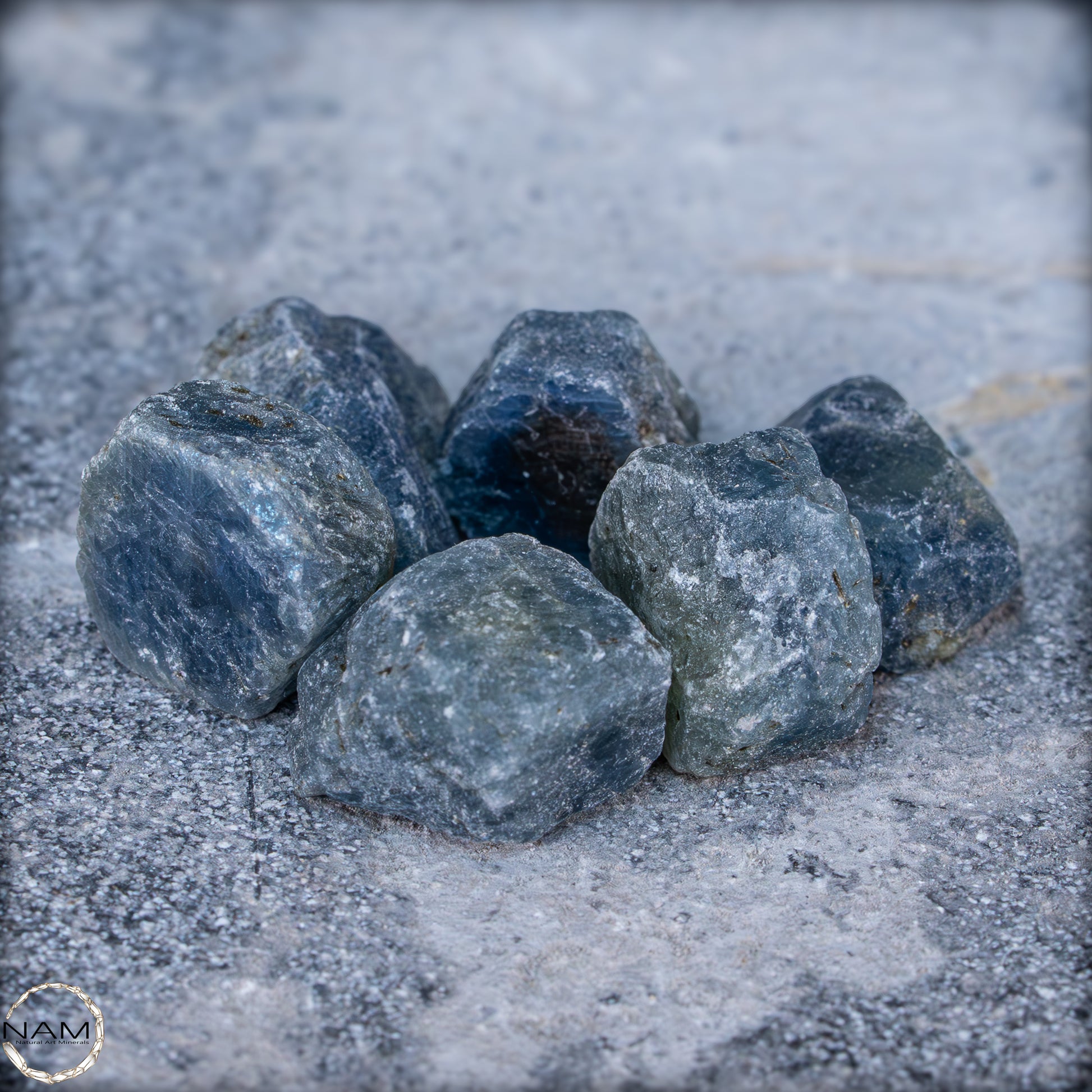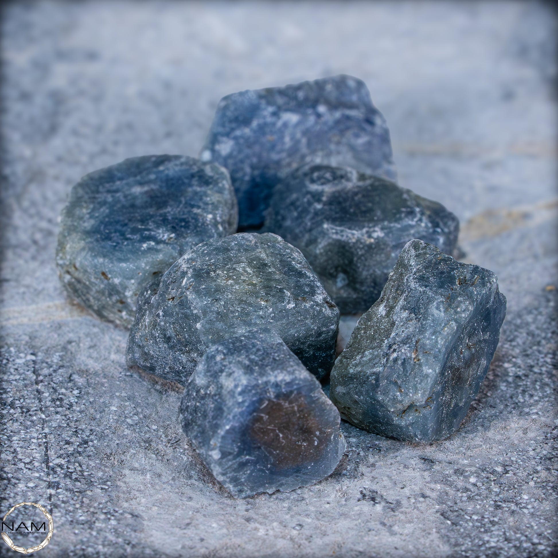 Dieses Saphir-Los zeigt eine faszinierende Auswahl an Rohkristallen in unterschiedlichen Größen und Formen. Die Stücke präsentieren sich in einem tiefen, leicht graublauen bis intensiv kornblumenblauen Farbspektrum. Besonders im durchscheinenden Licht offenbaren einzelne Steine ihre innere Leuchtkraft mit strahlend blauen Glanzpunkten, die den edlen Charakter des Minerals hervorheben.