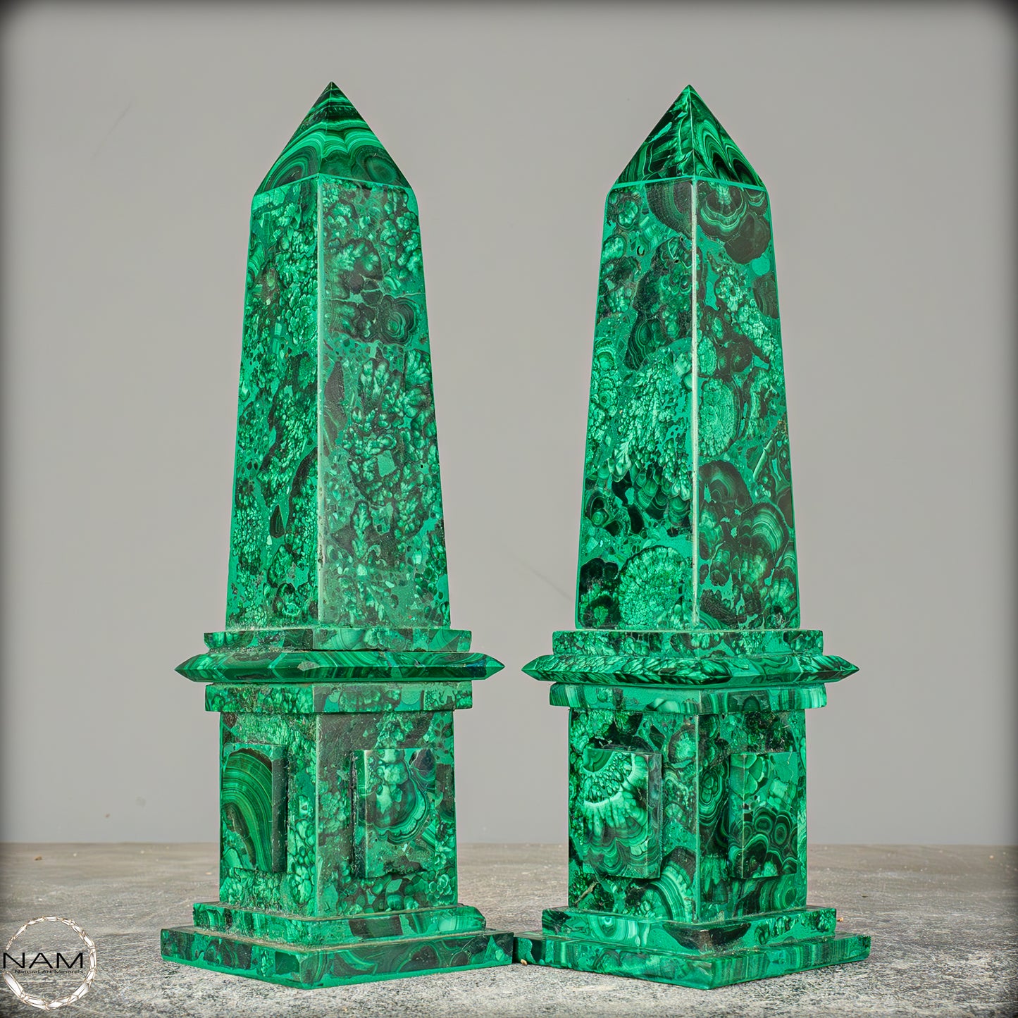 Dieses prachtvolle Obeliskenpaar aus Malachit beeindruckt durch seine kunstvolle Verarbeitung und die charakteristische, intensiv grüne Bänderung des Minerals. Die hochglanzpolierte Oberfläche offenbart ein faszinierendes Zusammenspiel konzentrischer Augenmuster, wellenförmiger Strukturen und verschiedenster Grüntöne – von sattem Smaragdgrün bis zu fast leuchtendem Mint.