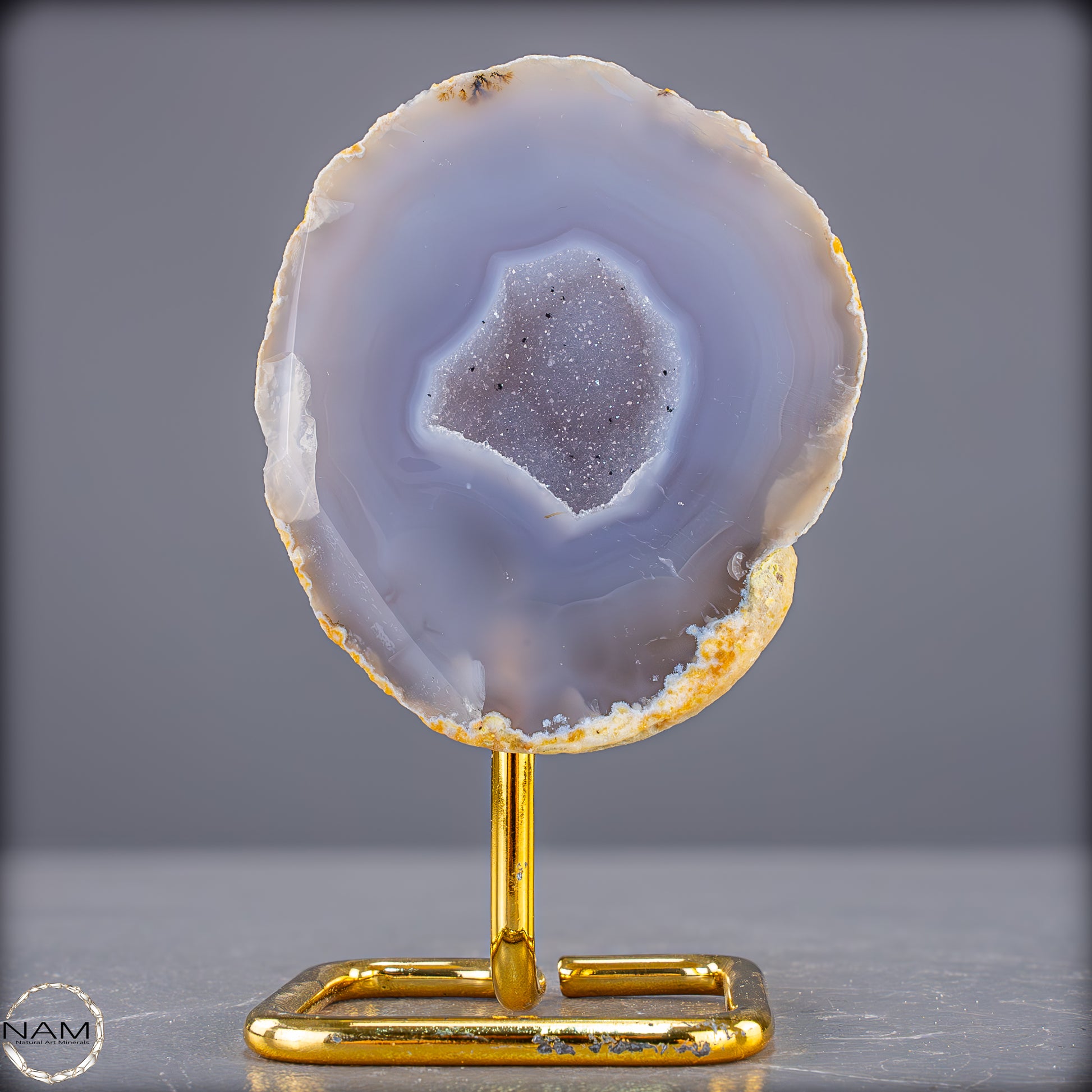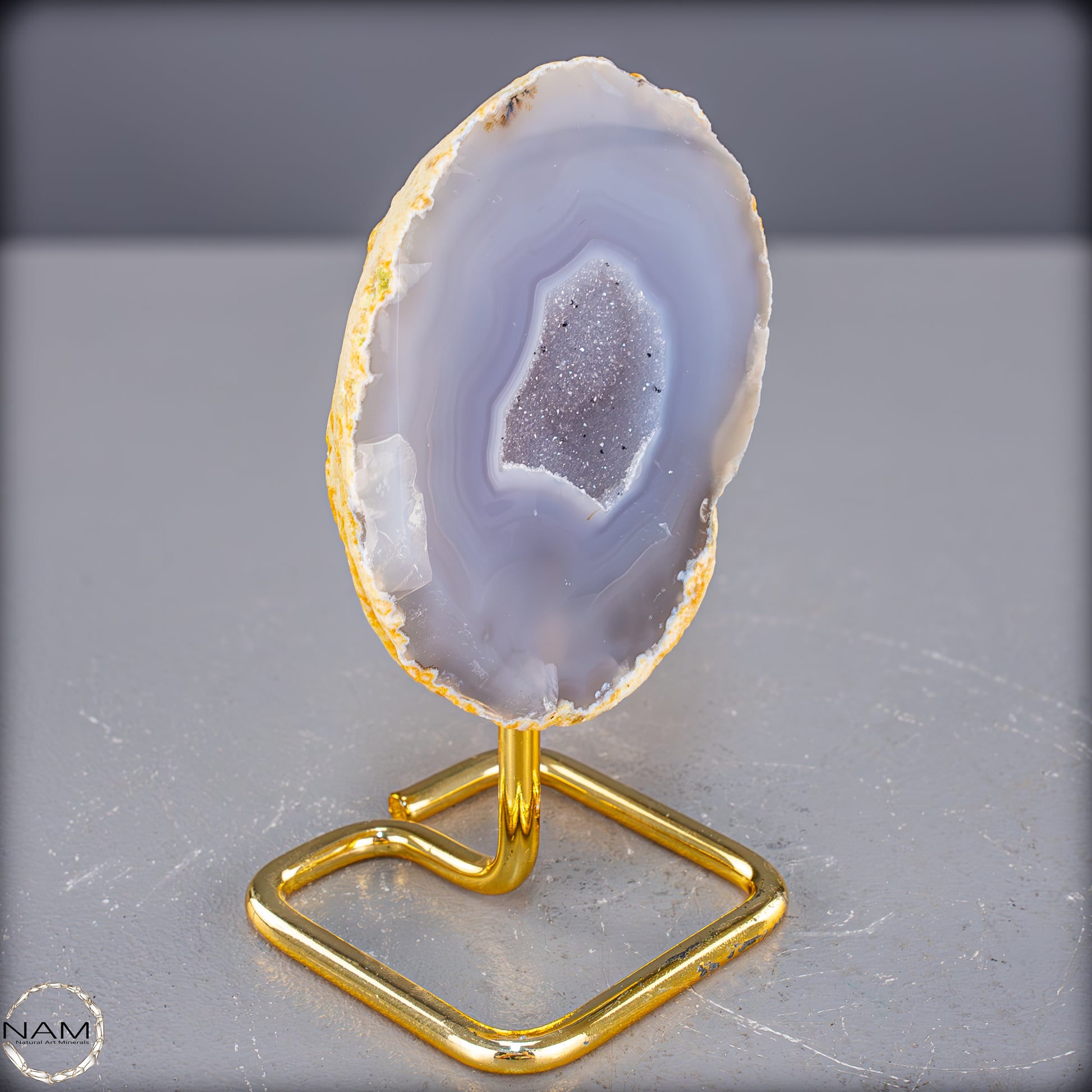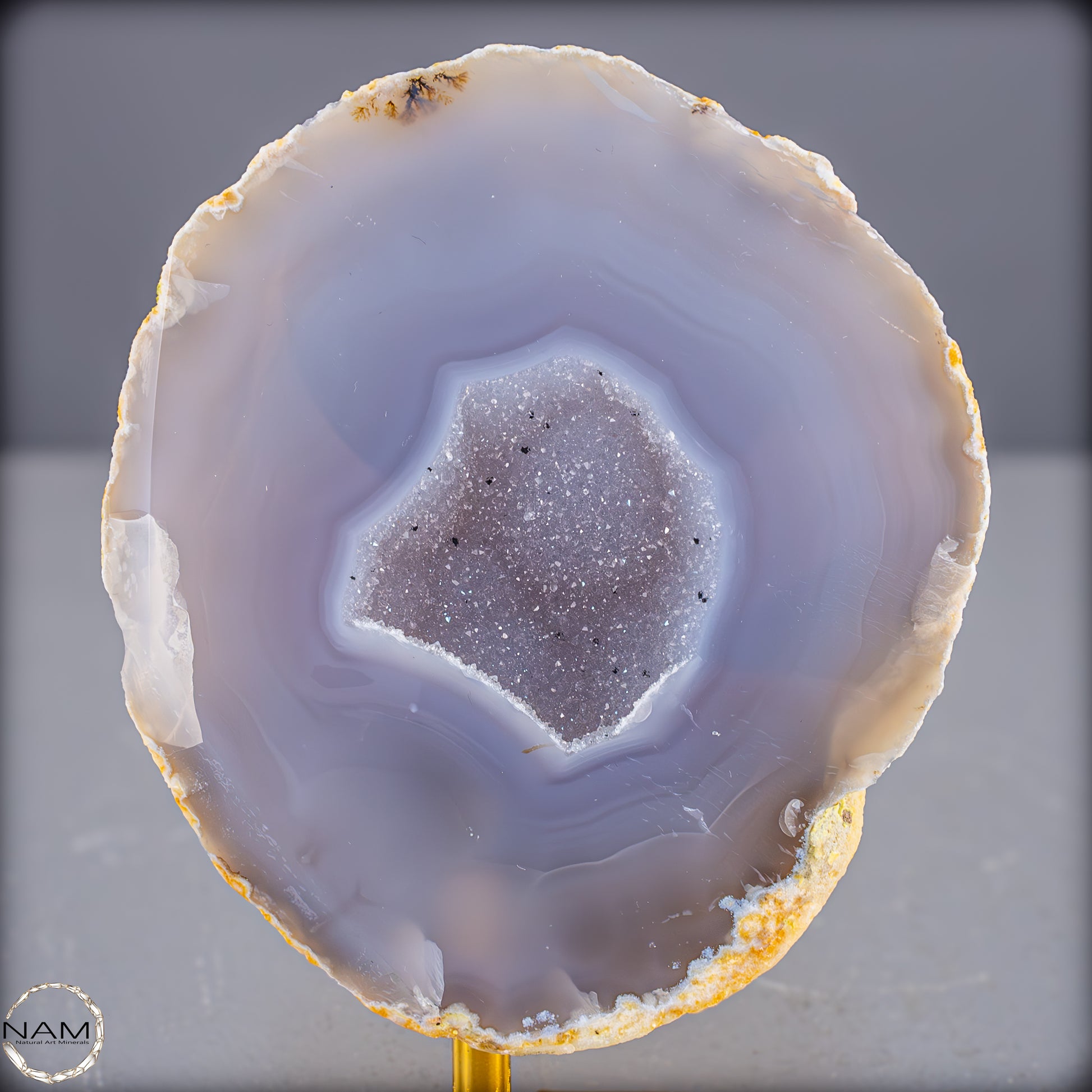 Diese edle Achat-Scheibe präsentiert ein harmonisches Zusammenspiel aus zarten Lavendel- und Grautönen, die sich in sanften Bändern um eine funkelnde Kristalldruse im Zentrum anordnen. Der Übergang von transluzentem Chalcedon zu kristallinem Quarz verleiht der Scheibe eine faszinierende Tiefe und Natürlichkeit.