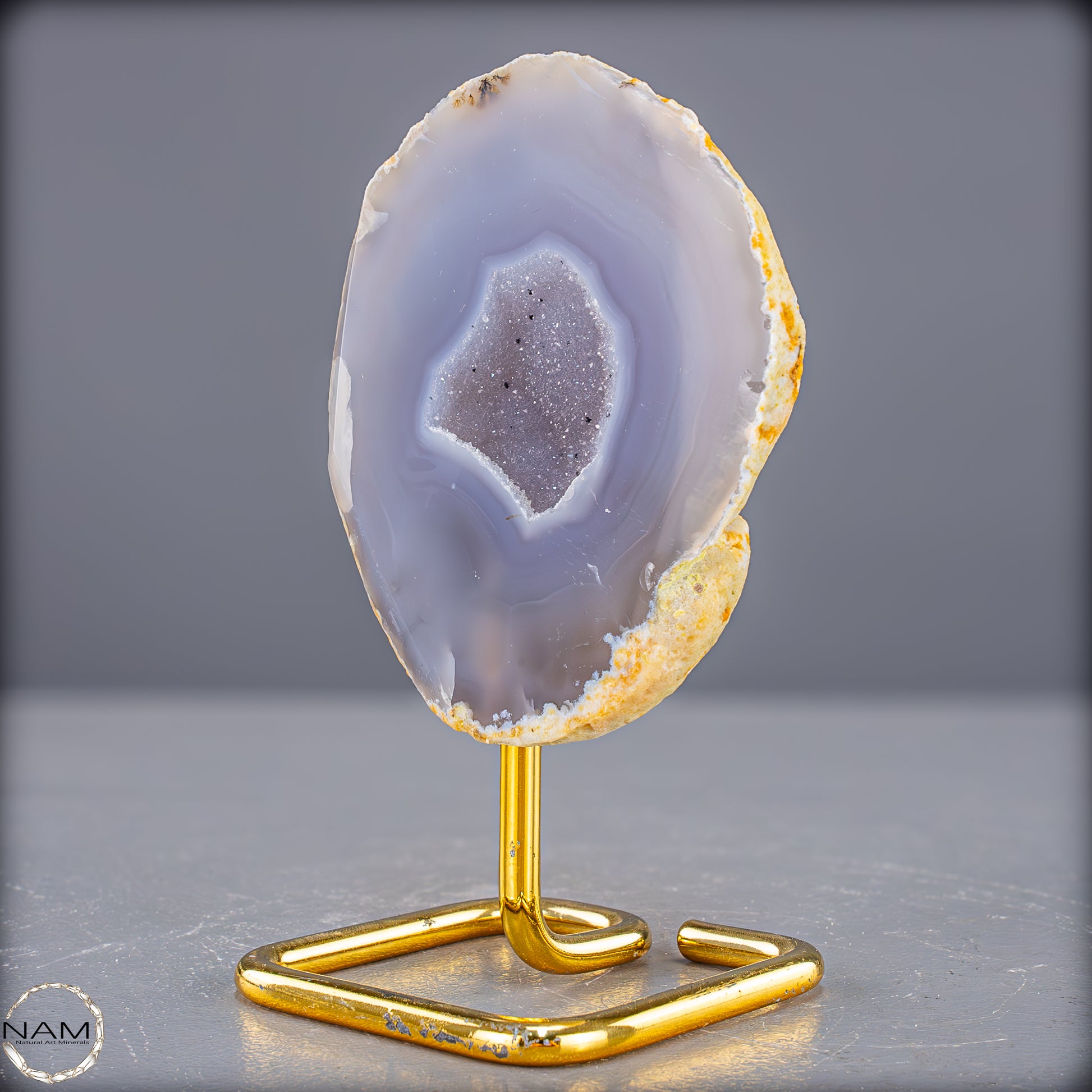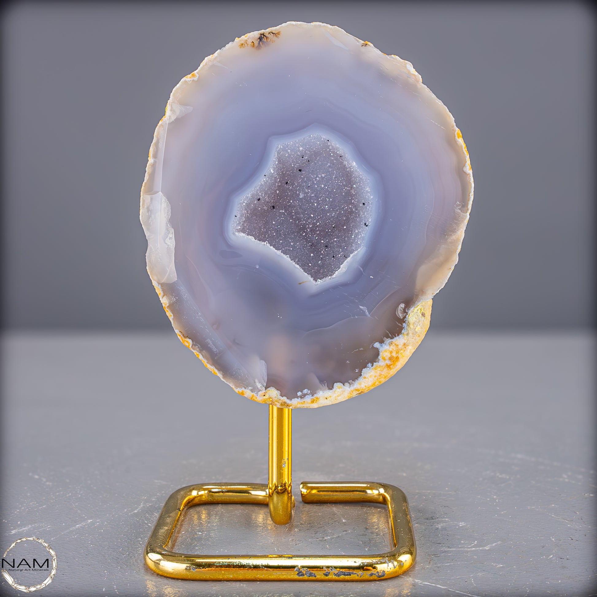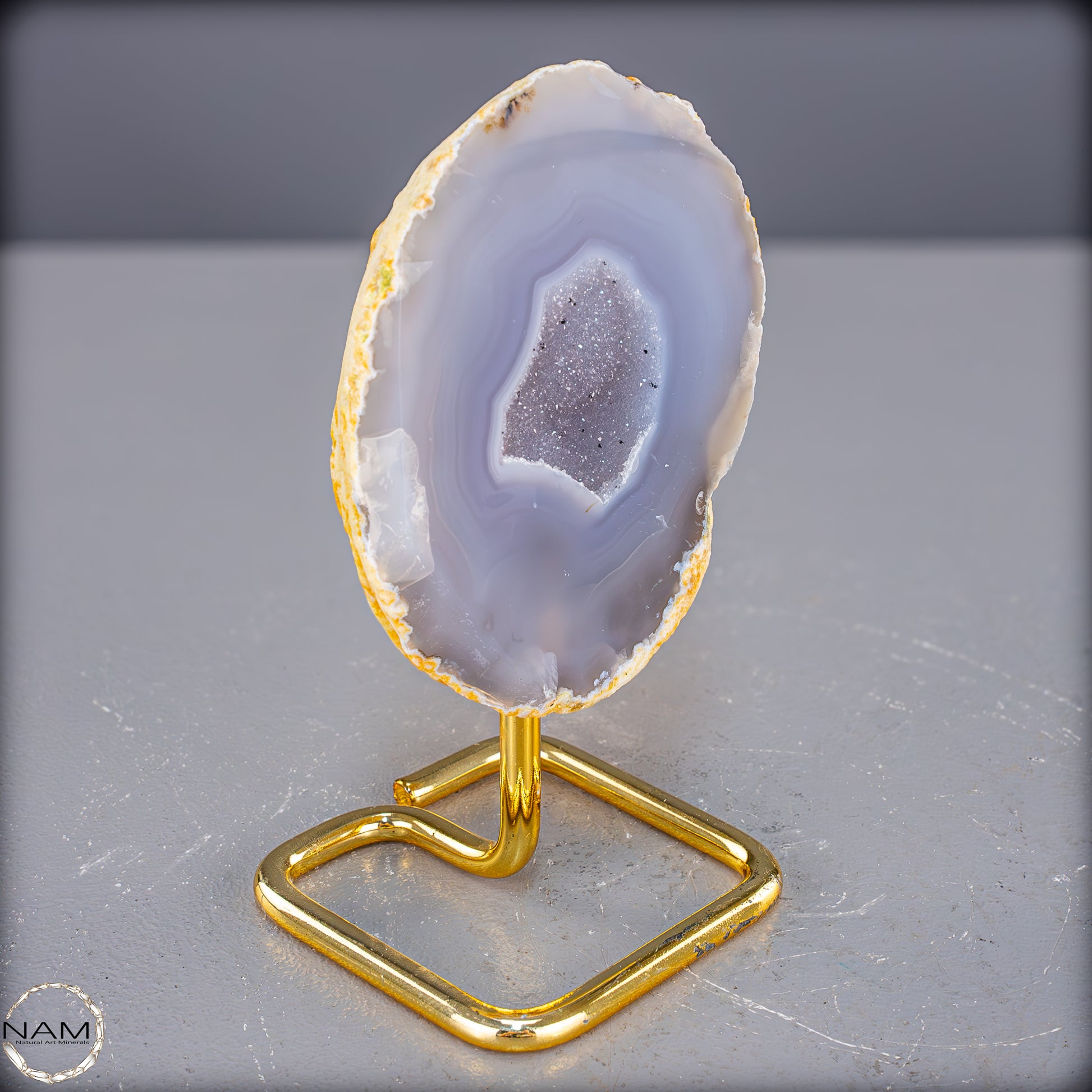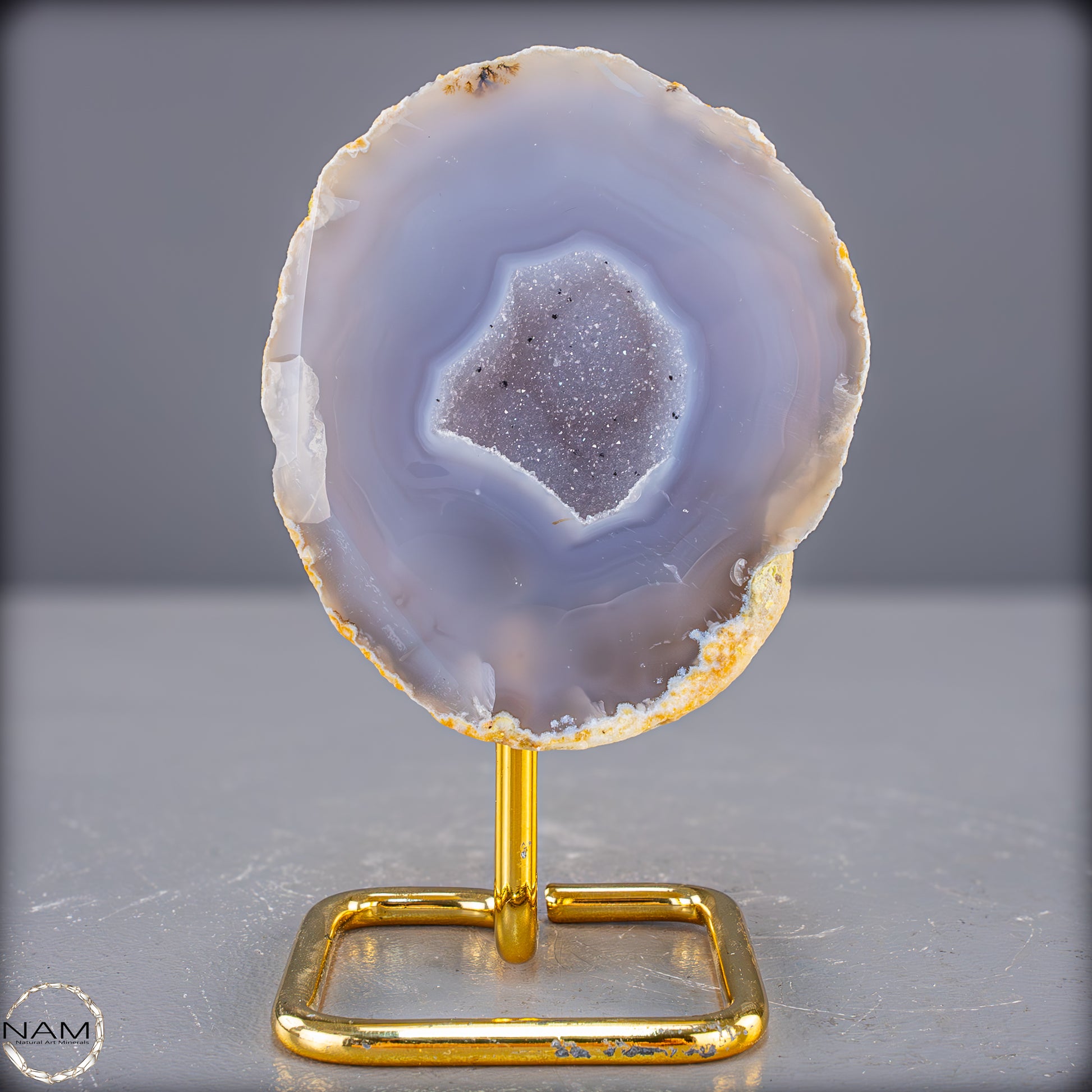 Diese edle Achat-Scheibe präsentiert ein harmonisches Zusammenspiel aus zarten Lavendel- und Grautönen, die sich in sanften Bändern um eine funkelnde Kristalldruse im Zentrum anordnen. Der Übergang von transluzentem Chalcedon zu kristallinem Quarz verleiht der Scheibe eine faszinierende Tiefe und Natürlichkeit.