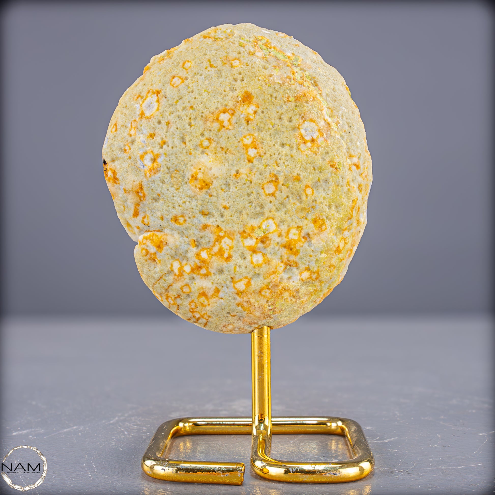 Feine Strukturen und helle Akzente an der Kante betonen die organische Herkunft des Steins, während der goldfarbene Metallständer das Stück elegant in Szene setzt.