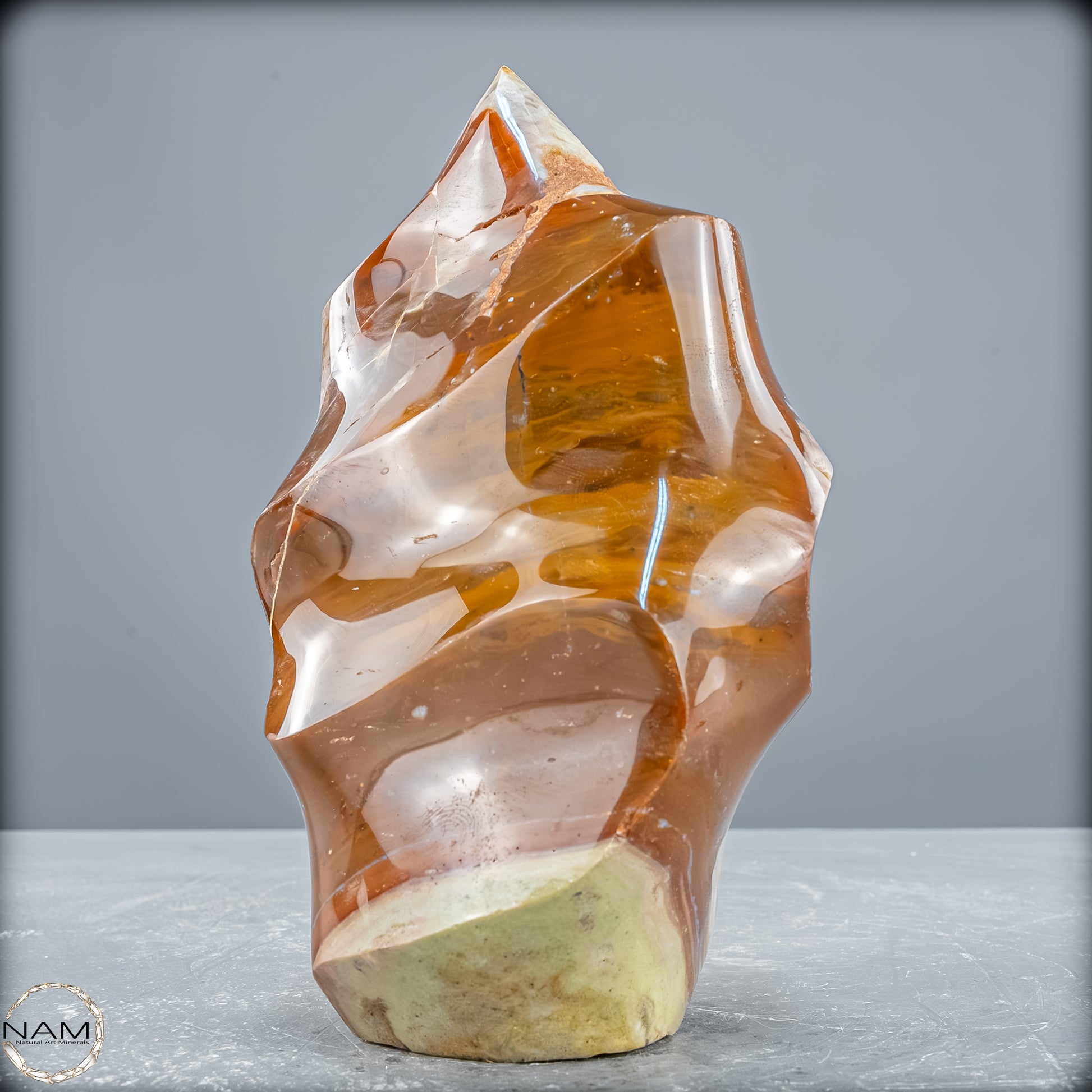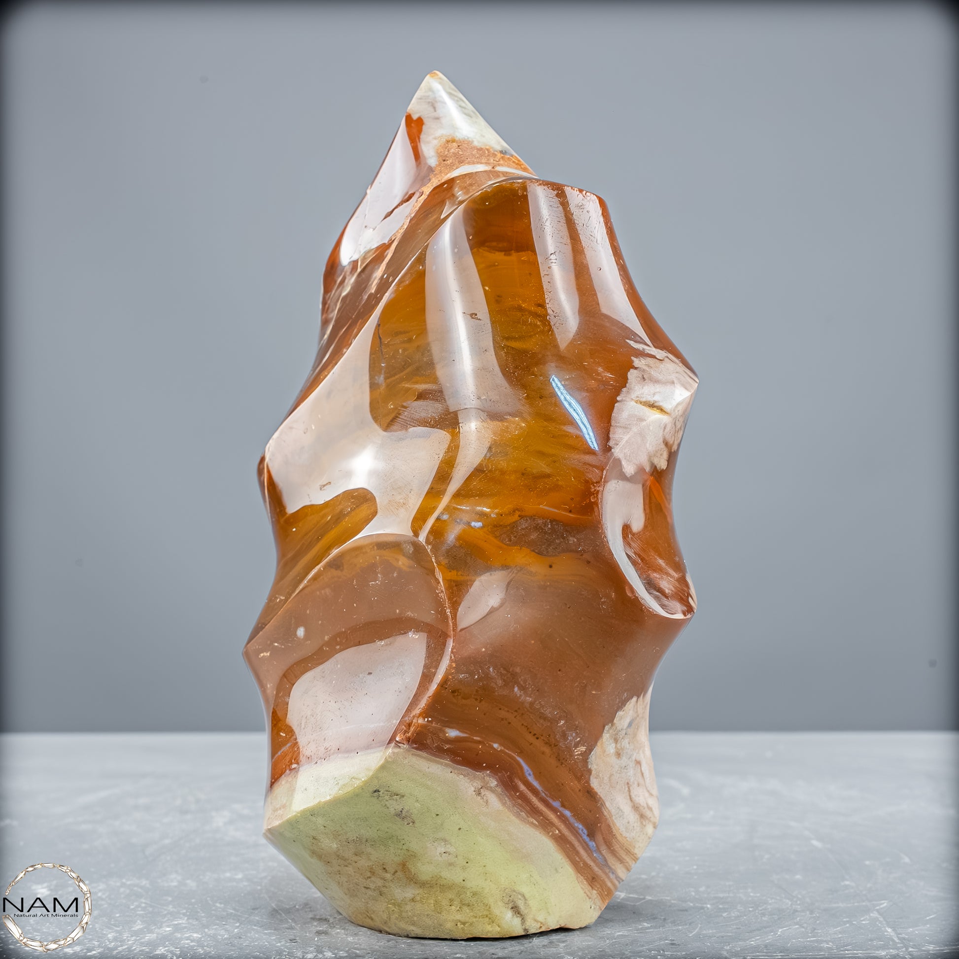 Diese außergewöhnliche Flammenform aus Jaspis-Achat besticht durch ihre zarte, fast wolkenartige Farbgebung in Weiß-, Grau-, Beige- und Goldtönen. Die harmonischen Bänderungen ziehen sich elegant um die Skulptur und lassen Assoziationen an Wind, Wellen oder Nebel aufkommen. Besonders faszinierend ist die kristalline Druse auf der Rückseite, die wie ein leuchtendes Fenster im Inneren des Steins wirkt und der gesamten Erscheinung Tiefe und Lebendigkeit verleiht.