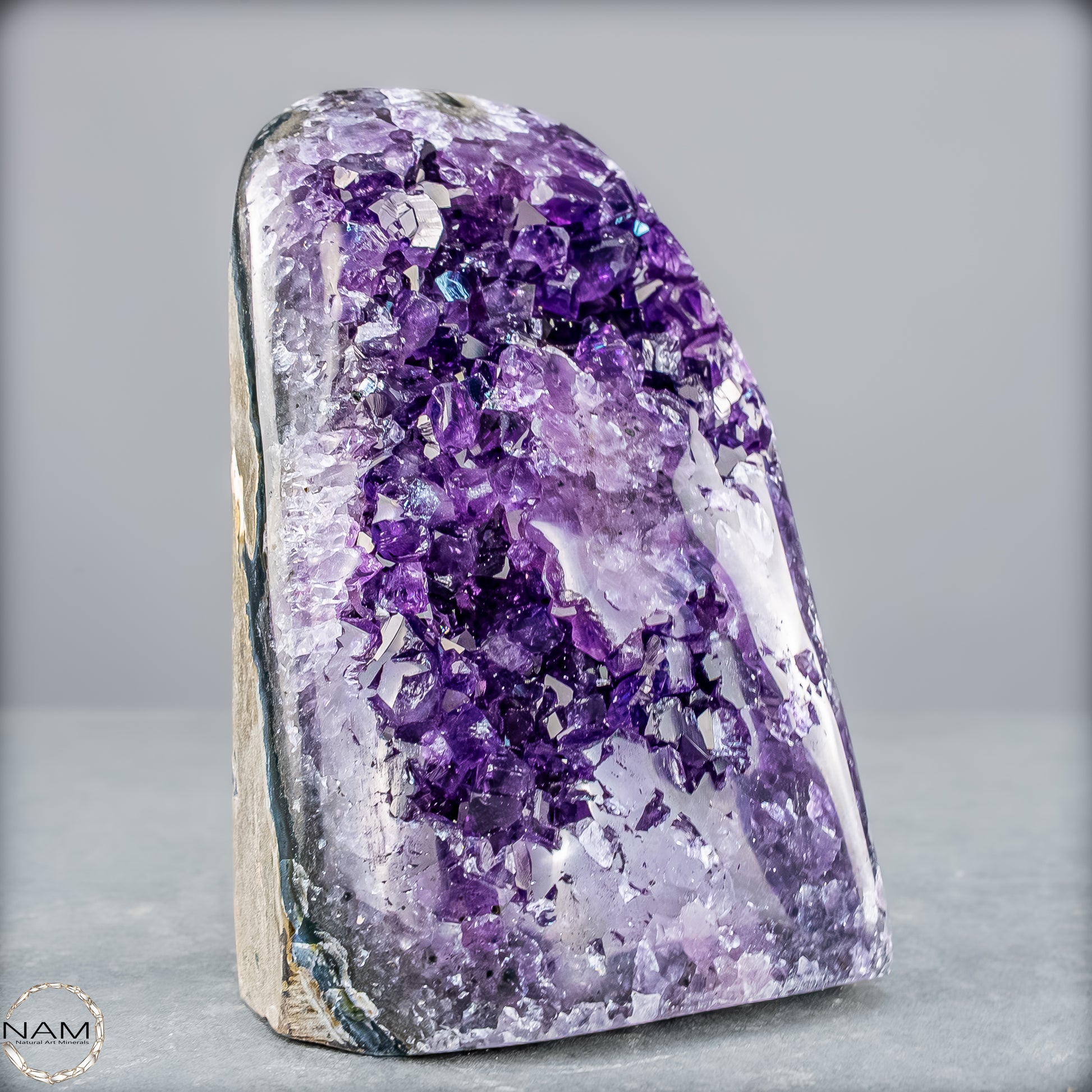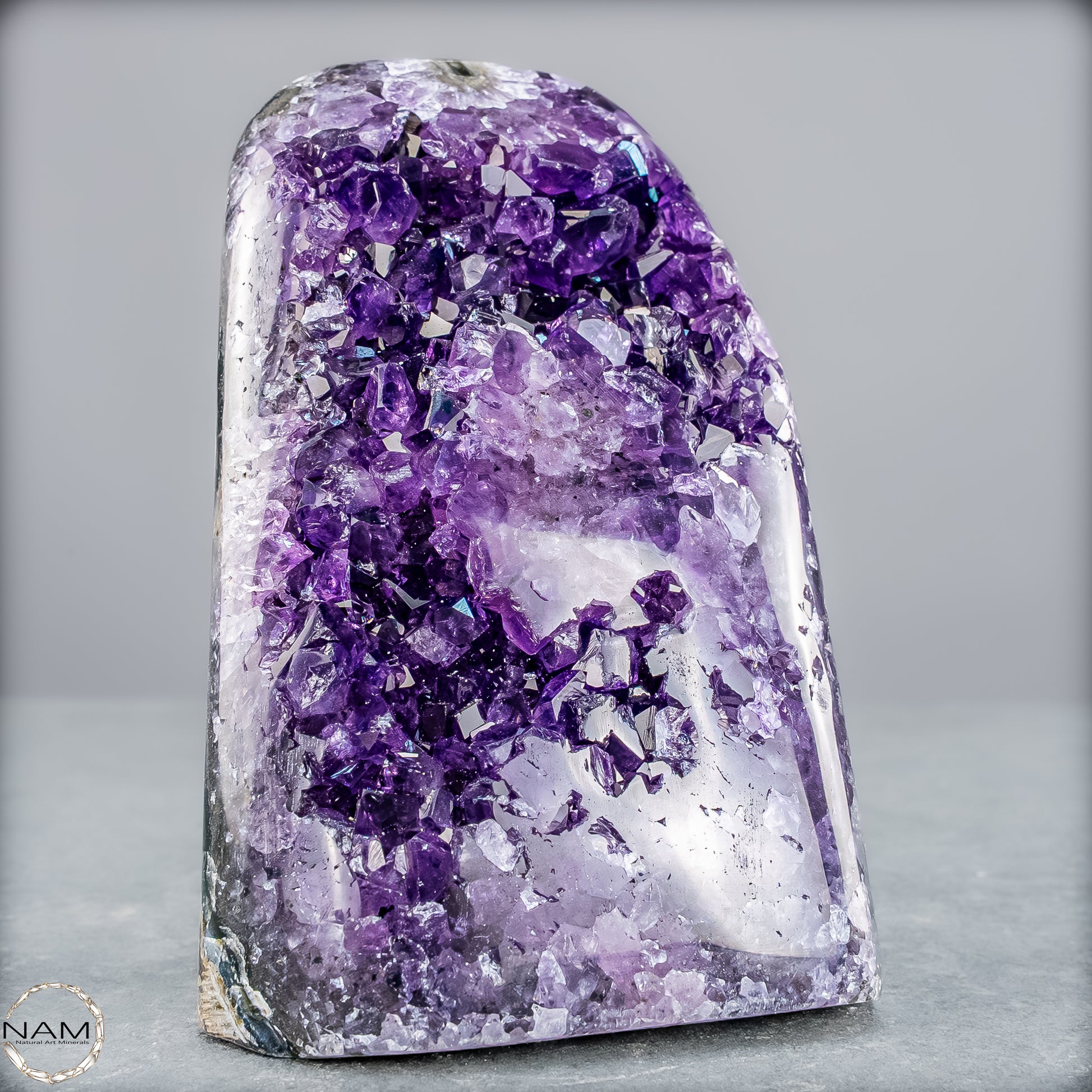 Als dekoratives Objekt ist diese Amethystdruse nicht nur ein visuelles Highlight, sondern bringt auch eine ruhige, zentrierende Präsenz in jeden Raum. Der Amethyst gilt traditionell als Stein der Klarheit und inneren Ruhe – Eigenschaften, die in dieser kraftvollen Druse sichtbar zum Ausdruck kommen.