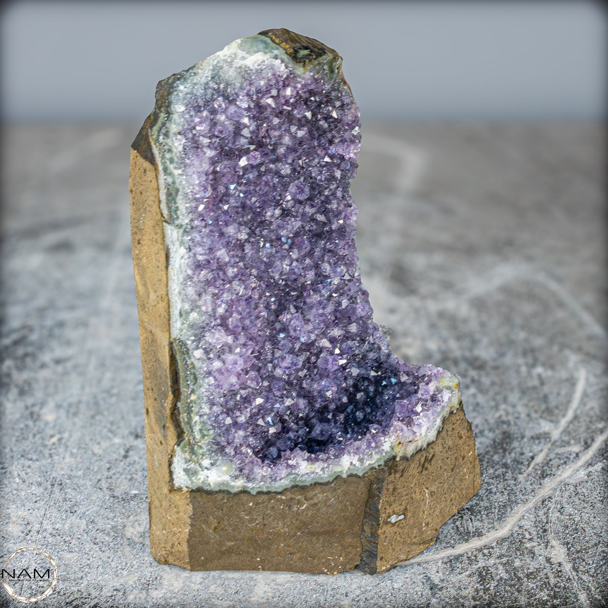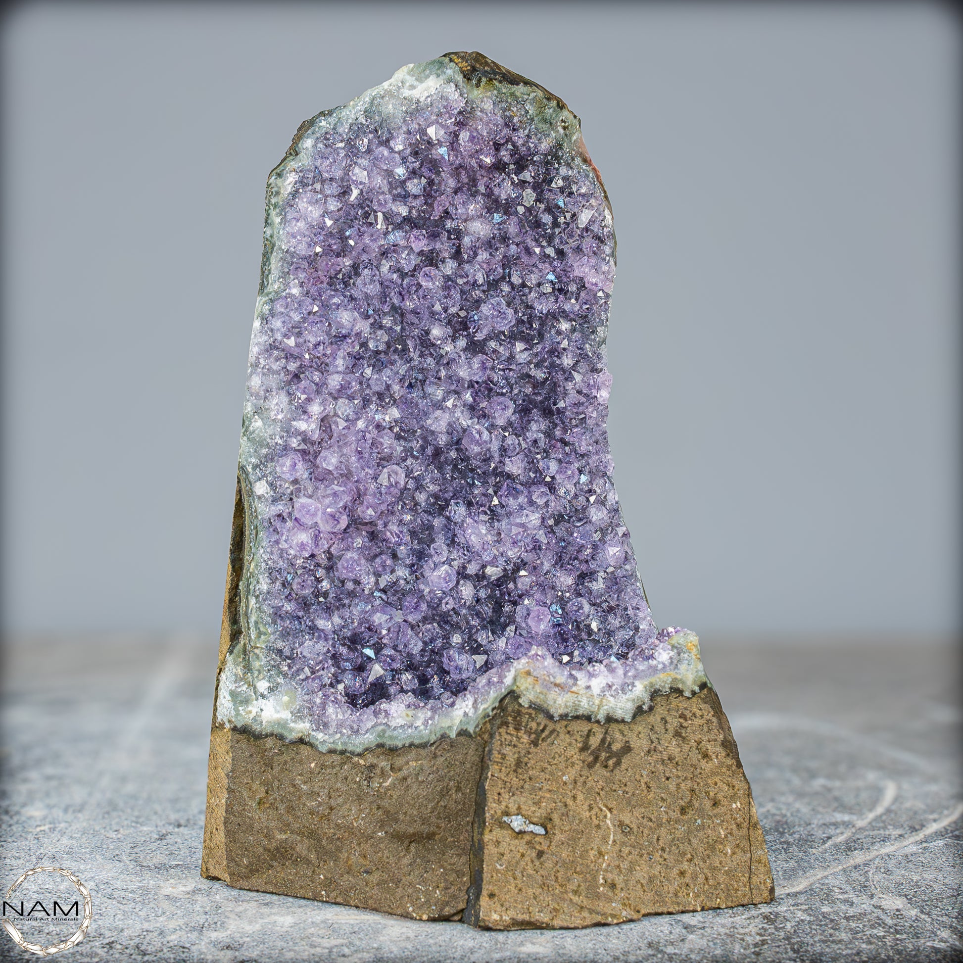 Als dekoratives Objekt ist diese Amethystdruse nicht nur ein visuelles Highlight, sondern bringt auch eine ruhige, zentrierende Präsenz in jeden Raum. Der Amethyst gilt traditionell als Stein der Klarheit und inneren Ruhe – Eigenschaften, die in dieser kraftvollen Druse sichtbar zum Ausdruck kommen.