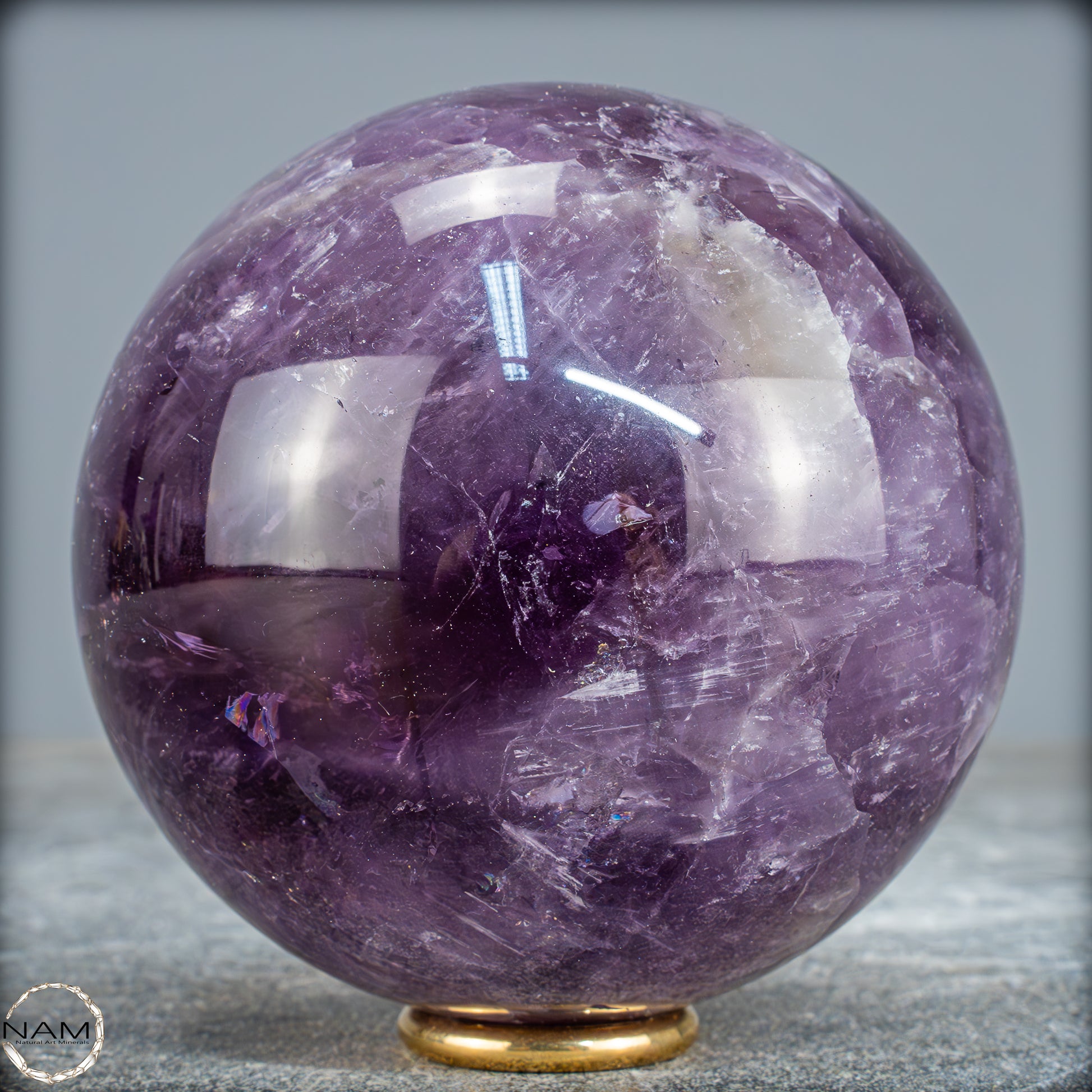 Eine beeindruckende Amethyst-Kugel, die mit ihren satten violetten Farbtönen und faszinierenden Einschlüsse die Schönheit und Vielseitigkeit dieses Minerals zeigt. Die glatte, polierte Oberfläche hebt die natürlichen Strukturen hervor, während der warme Glanz ein Gefühl von Tiefe und Eleganz verleiht.
