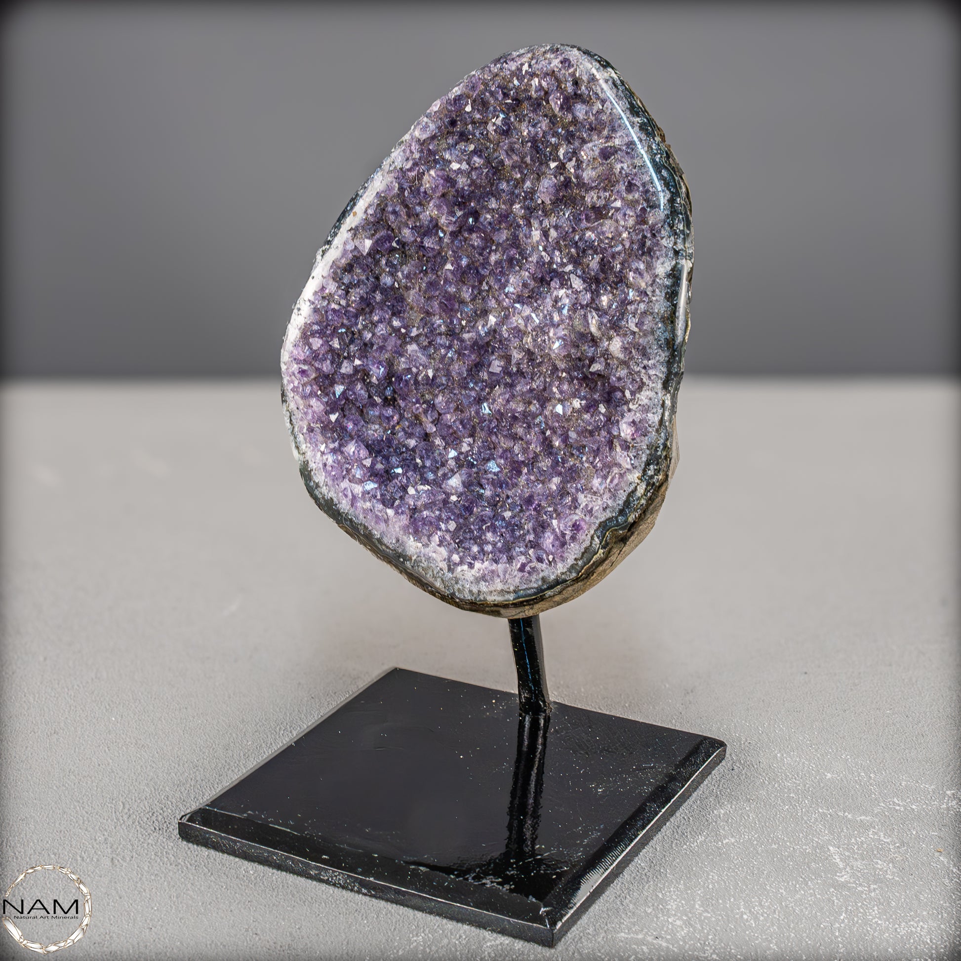 Diese Amethyst-Druse auf Ständer zeigt eine beeindruckende Fläche aus dichten, funkelnden Kristallen in kräftigem Violett. Die zahlreichen Spitzen reflektieren das Licht auf lebendige Weise und erzeugen ein faszinierendes Glitzern, das die Tiefe der Kristallstruktur besonders betont.