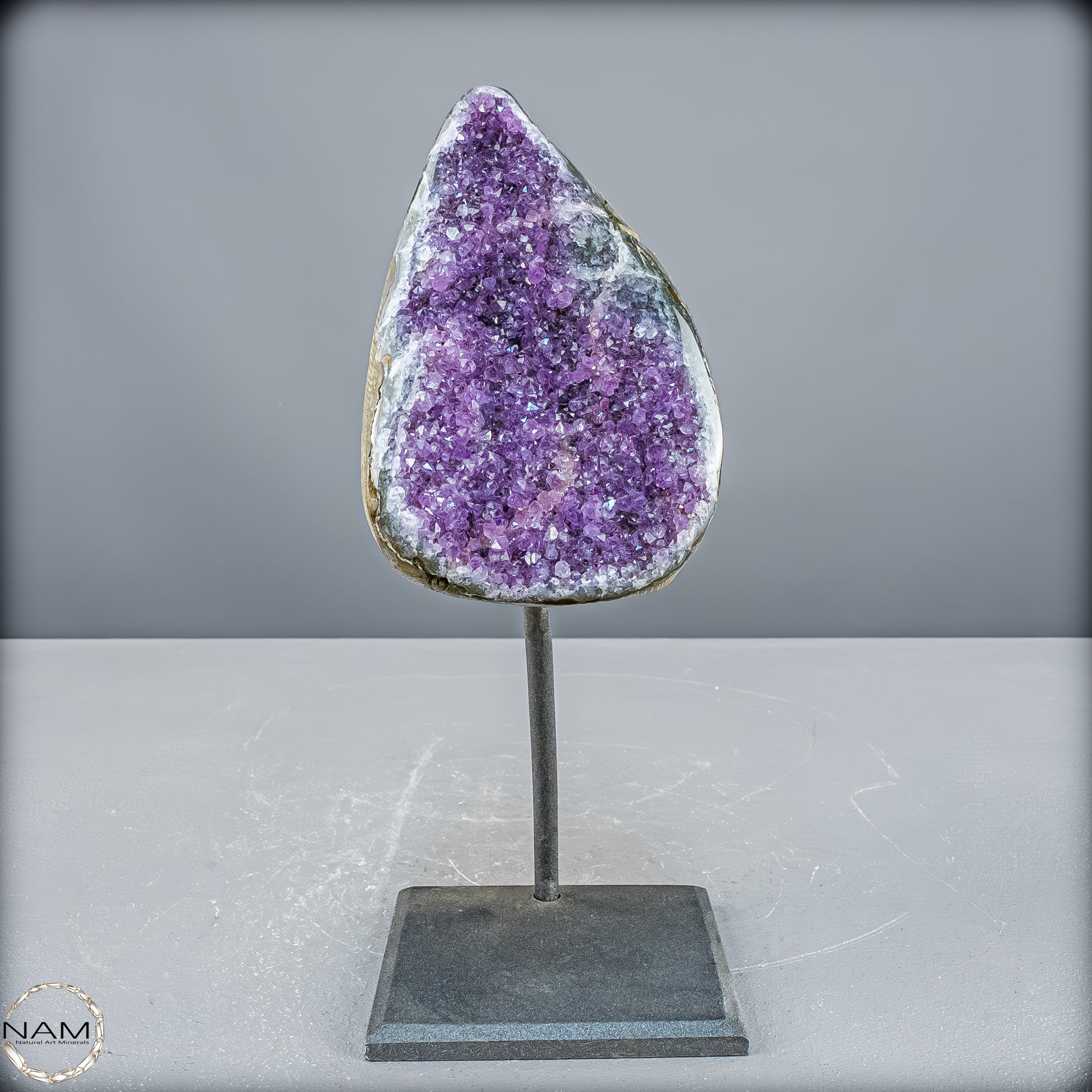 Diese Amethyst-Druse auf Ständer zeigt eine beeindruckende Fläche aus dichten, funkelnden Kristallen in kräftigem Violett. Die zahlreichen Spitzen reflektieren das Licht auf lebendige Weise und erzeugen ein faszinierendes Glitzern, das die Tiefe der Kristallstruktur besonders betont.