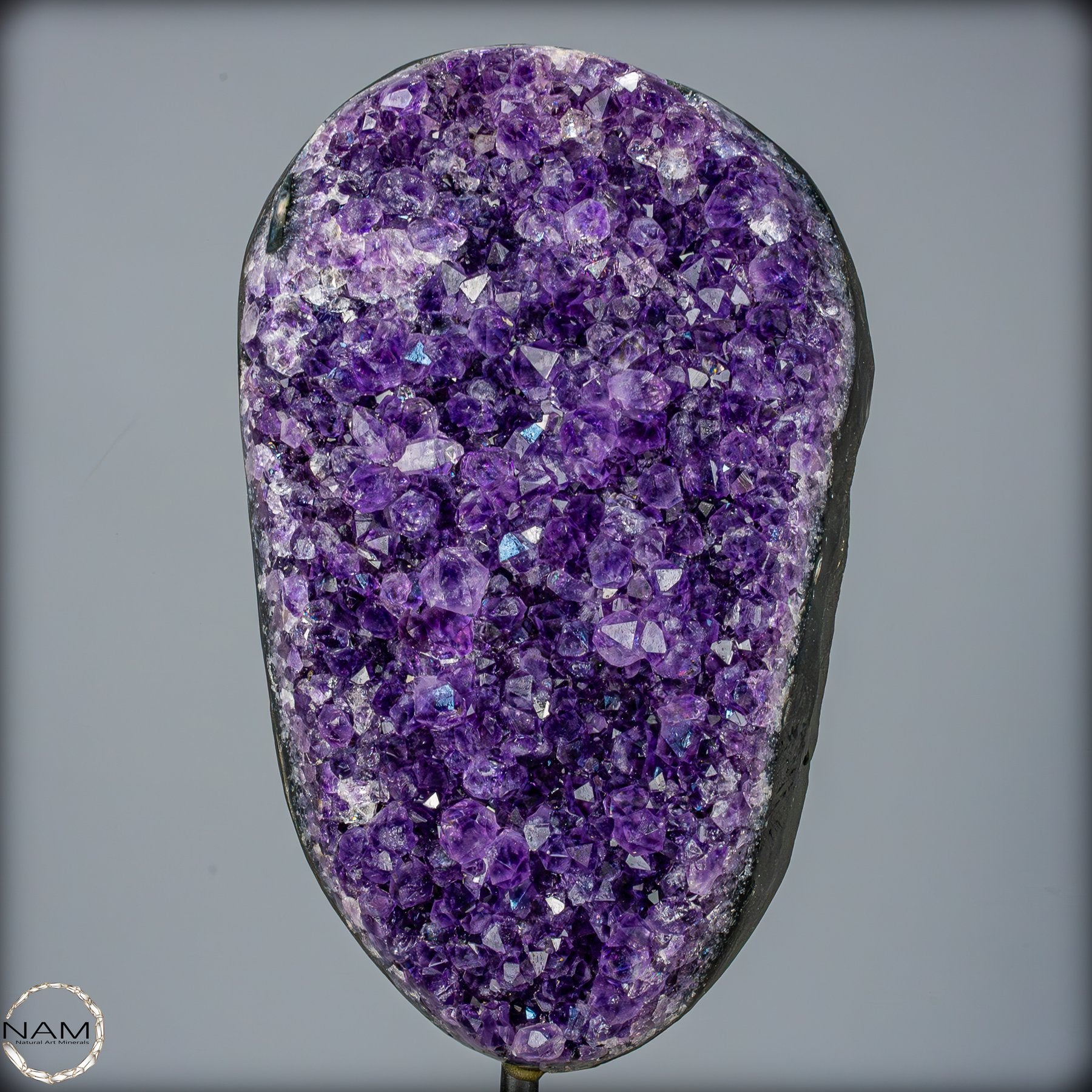 Diese Amethyst-Druse auf Ständer zeigt eine beeindruckende Fläche aus dichten, funkelnden Kristallen in kräftigem Violett. Die zahlreichen Spitzen reflektieren das Licht auf lebendige Weise und erzeugen ein faszinierendes Glitzern, das die Tiefe der Kristallstruktur besonders betont.