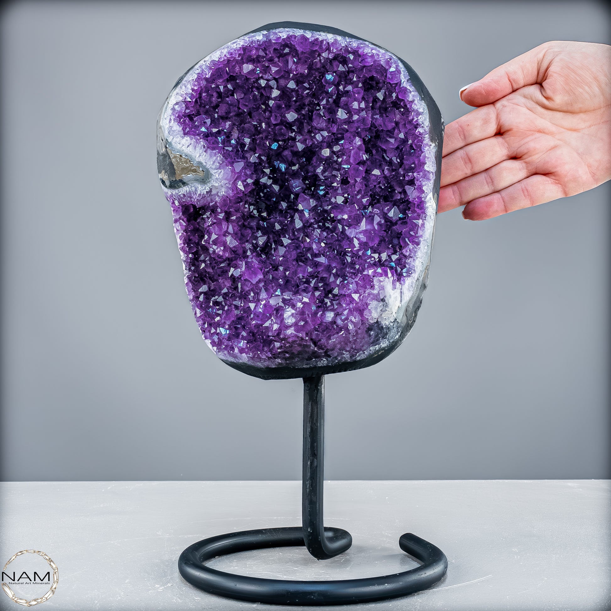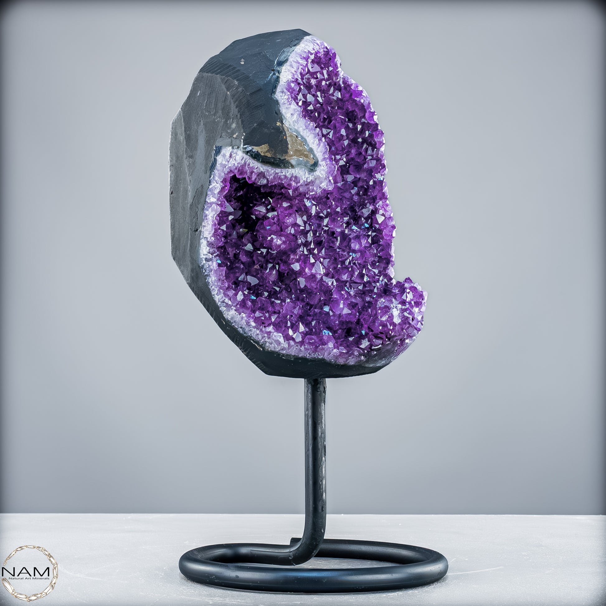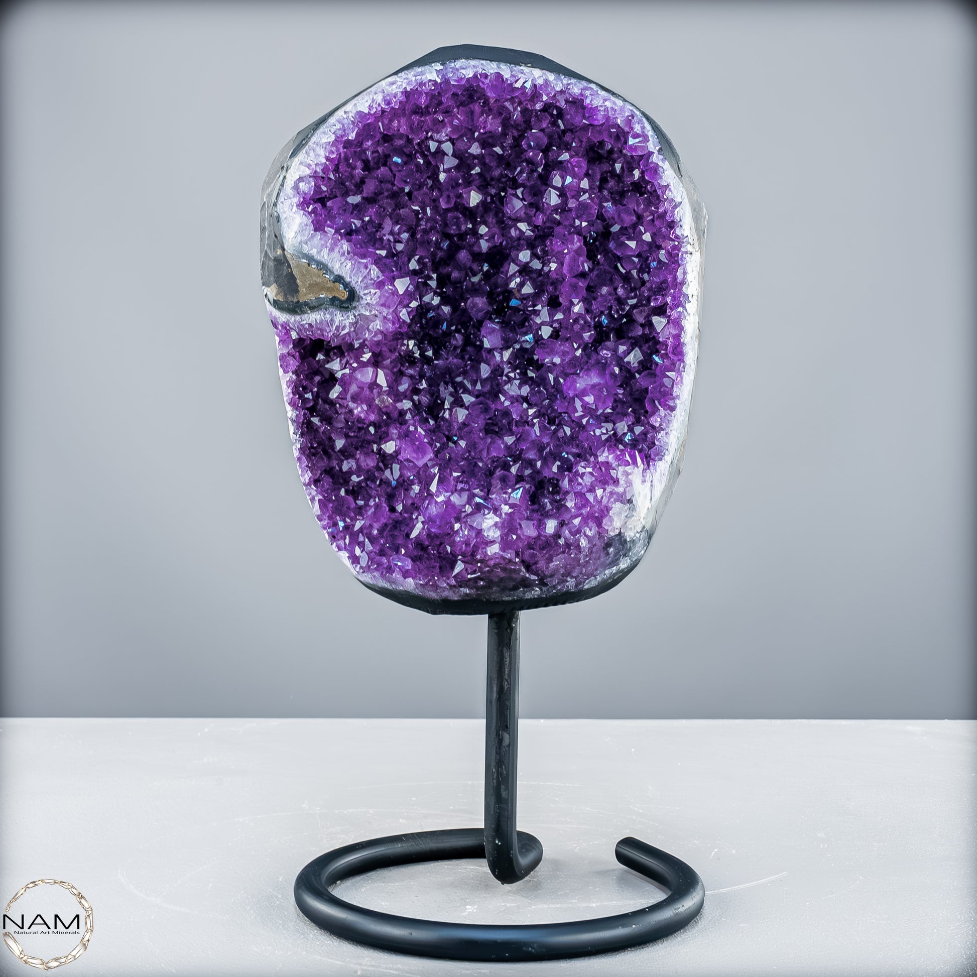 Die gezeigte Form – als Druse mit metallischem Standfuß – verbindet Natürlichkeit mit moderner Präsentation. So wird der Amethyst nicht nur zum energetischen Begleiter, sondern auch zu einem eleganten Blickfang in jedem Raum.