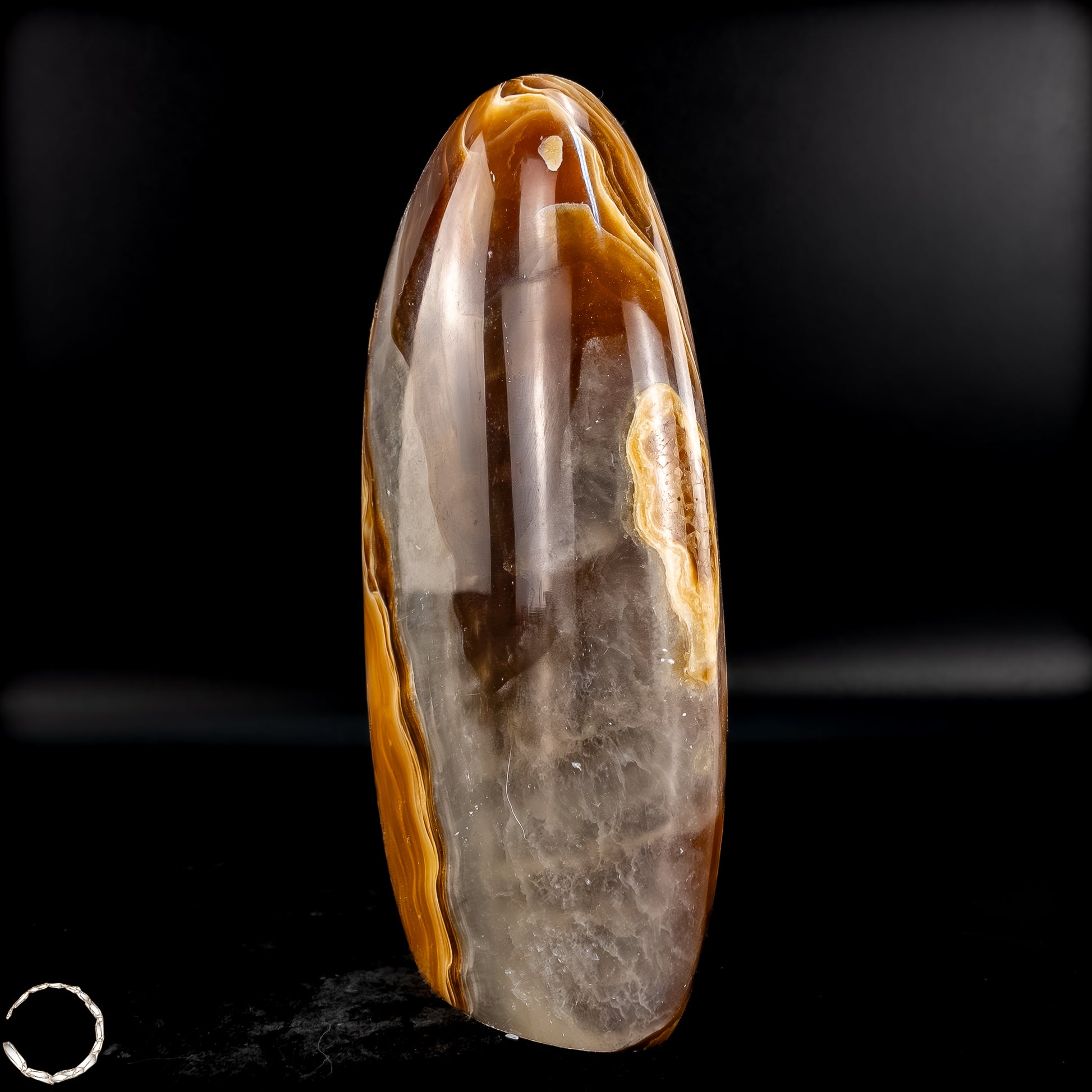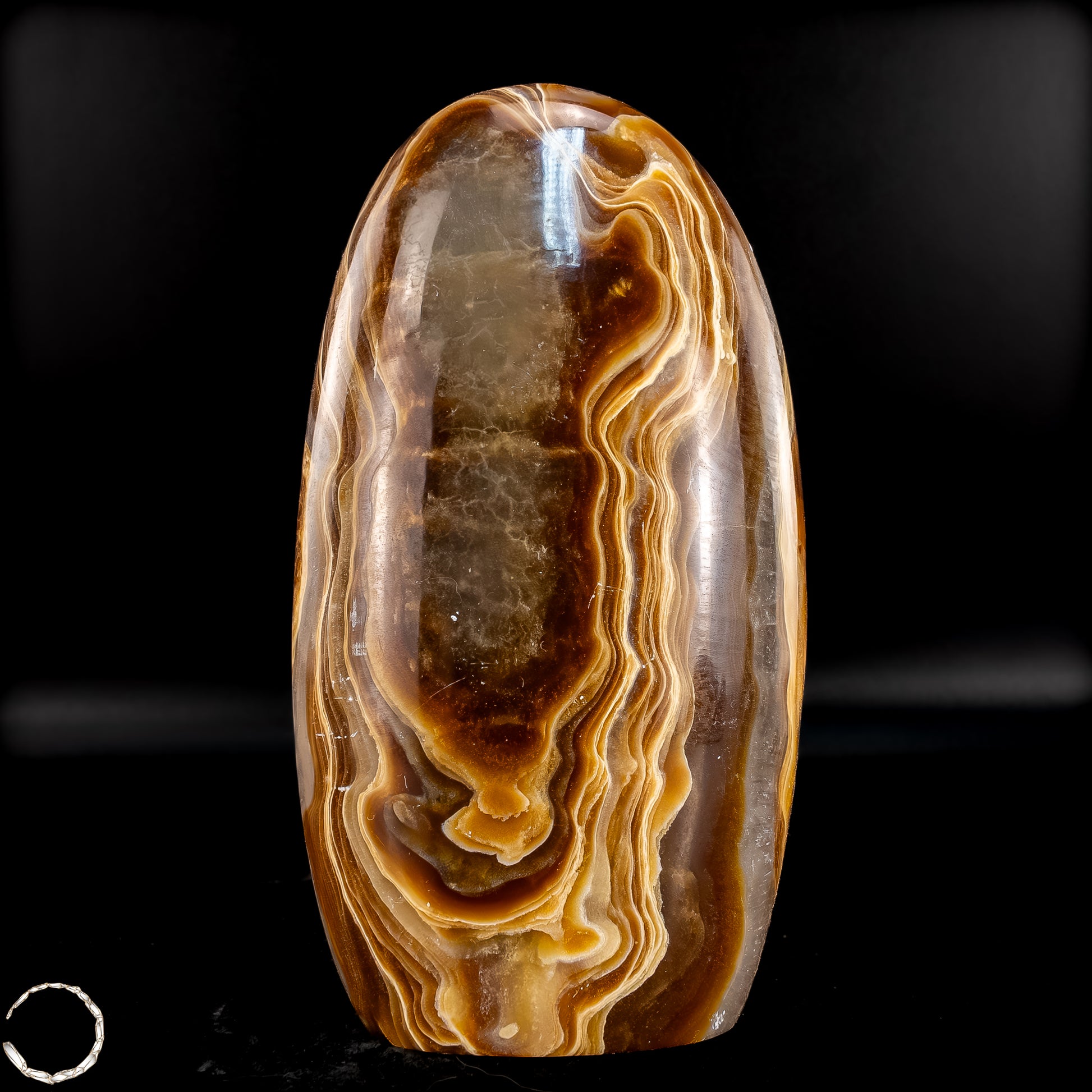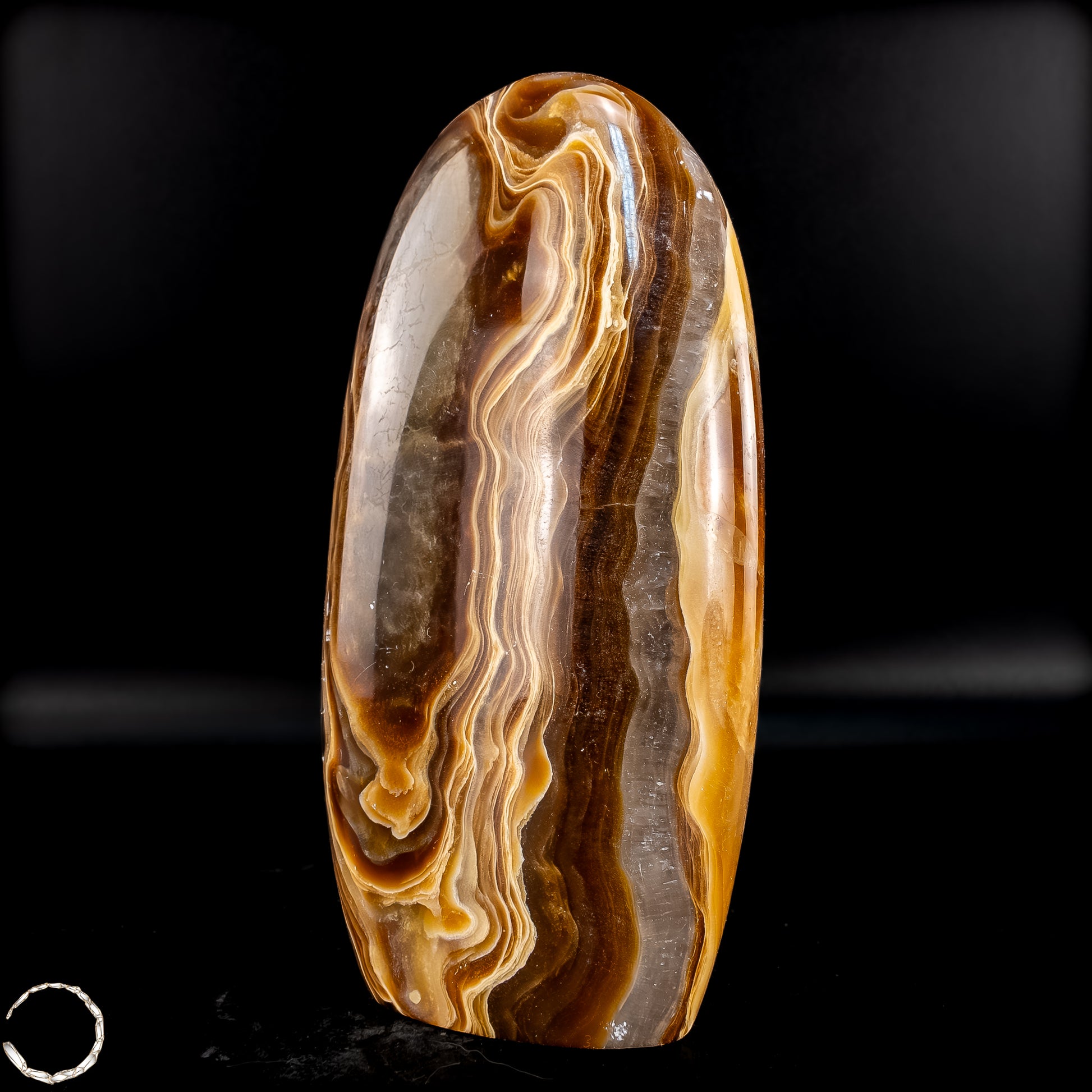 Diese beeindruckende Aragonit Freiform zeigt auf einzigartige Weise die Vielschichtigkeit und Tiefe der Natur. Mit ihren warmen Brauntönen, die von sanften Creme- und Weißschattierungen durchzogen sind, erinnert sie an die kraftvolle Energie der Erde selbst. Die fließenden Muster im Stein verleihen der Freiform eine besondere Dynamik, fast wie ein stillgelegter Fluss, der in Stein verewigt wurde.