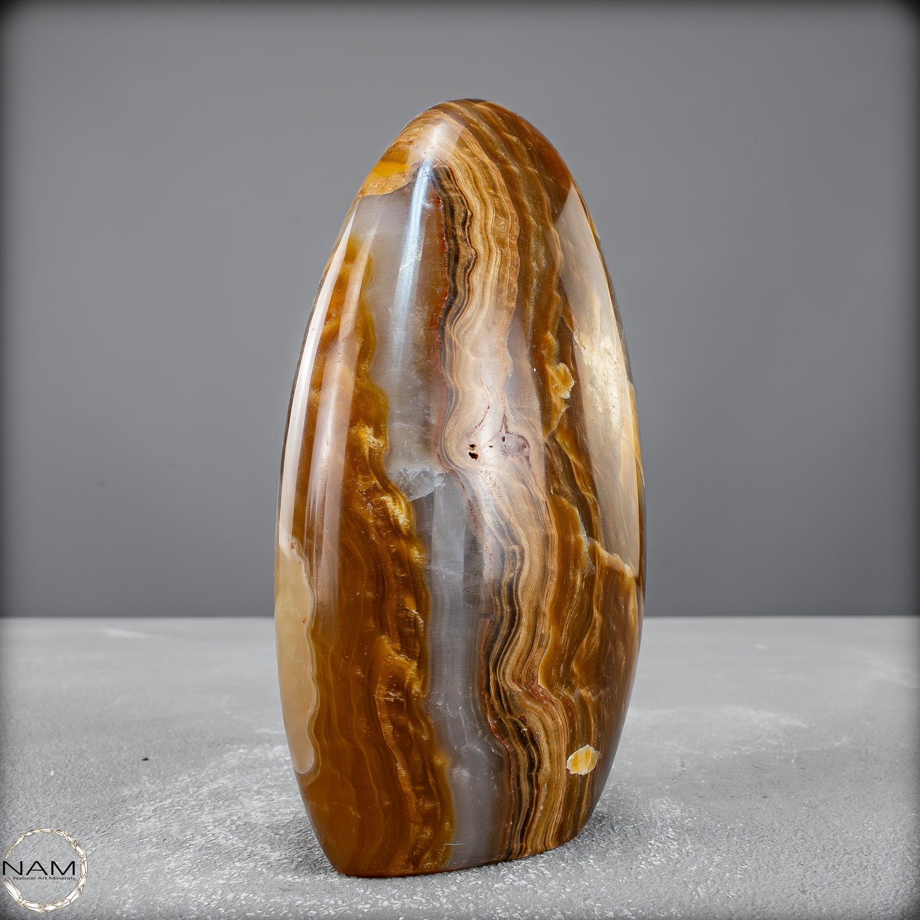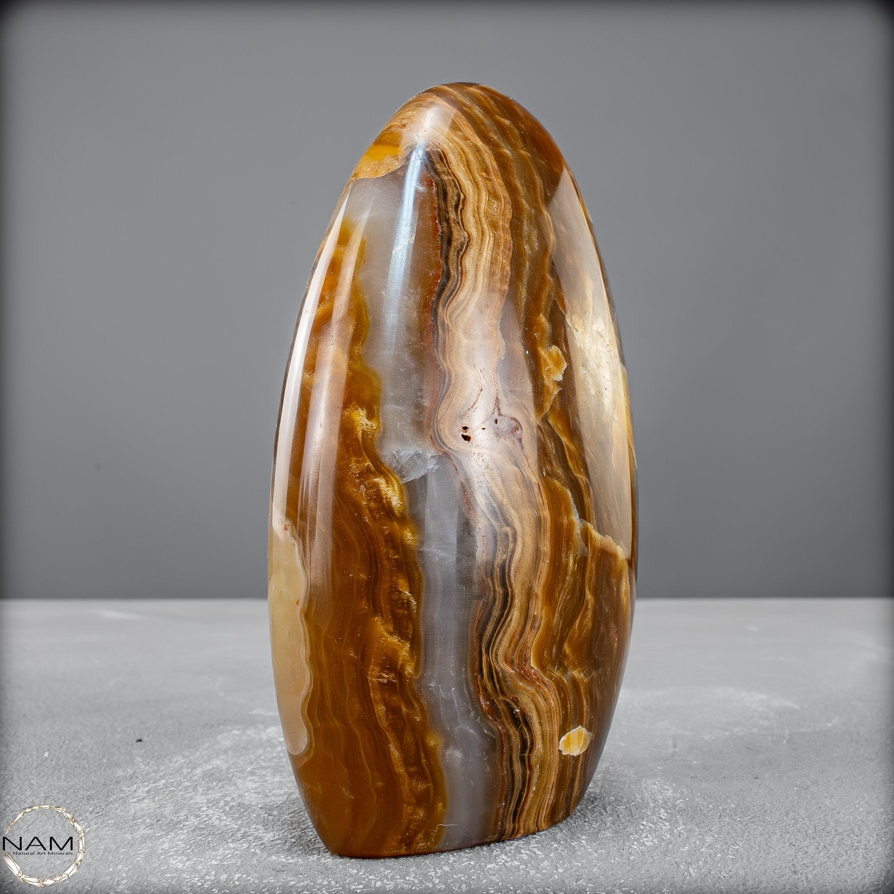 Diese beeindruckende Aragonit Freiform zeigt auf einzigartige Weise die Vielschichtigkeit und Tiefe der Natur. Mit ihren warmen Brauntönen, die von sanften Creme- und Weißschattierungen durchzogen sind, erinnert sie an die kraftvolle Energie der Erde selbst. Die fließenden Muster im Stein verleihen der Freiform eine besondere Dynamik, fast wie ein stillgelegter Fluss, der in Stein verewigt wurde.