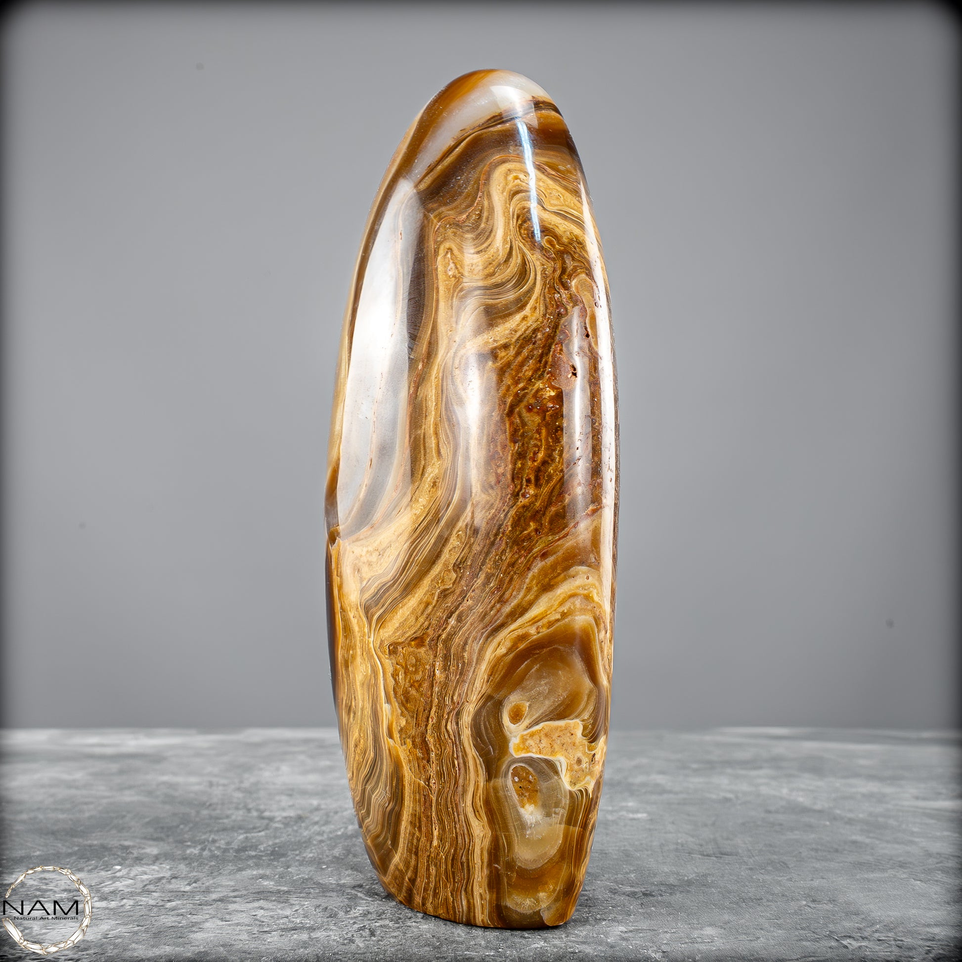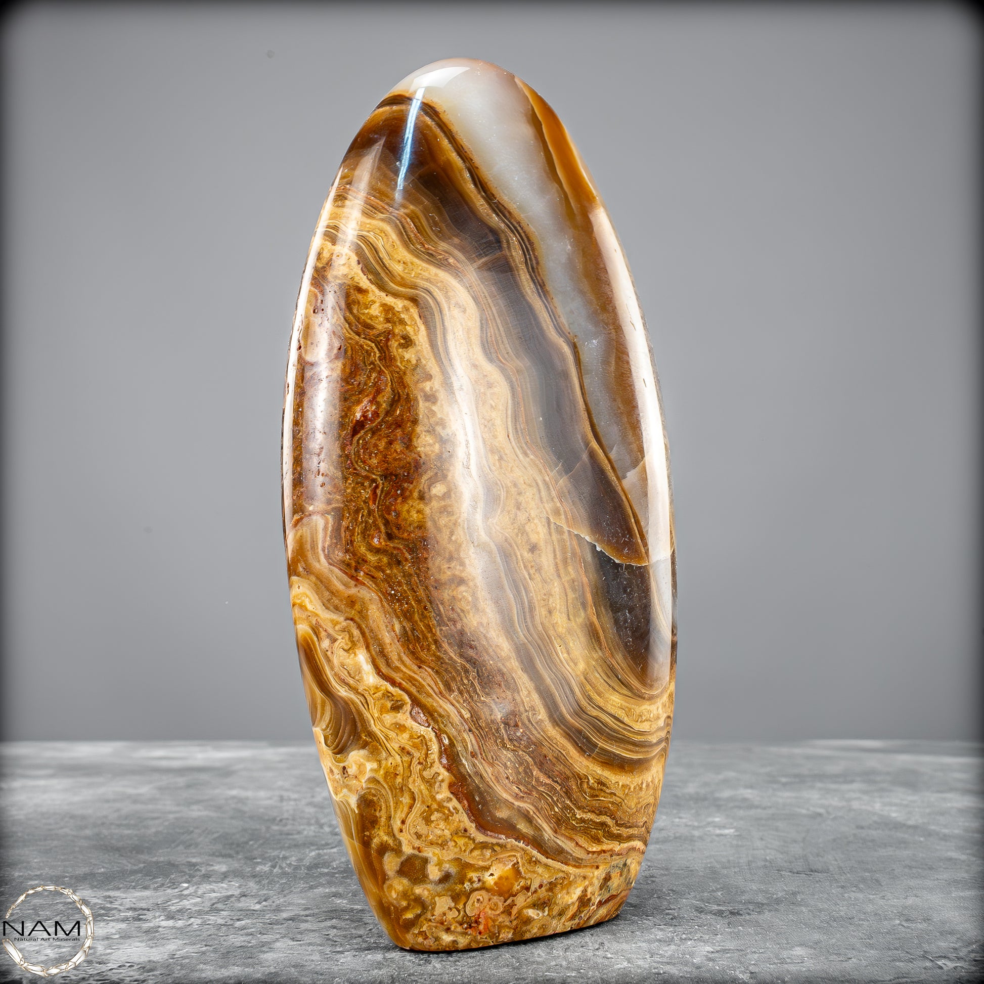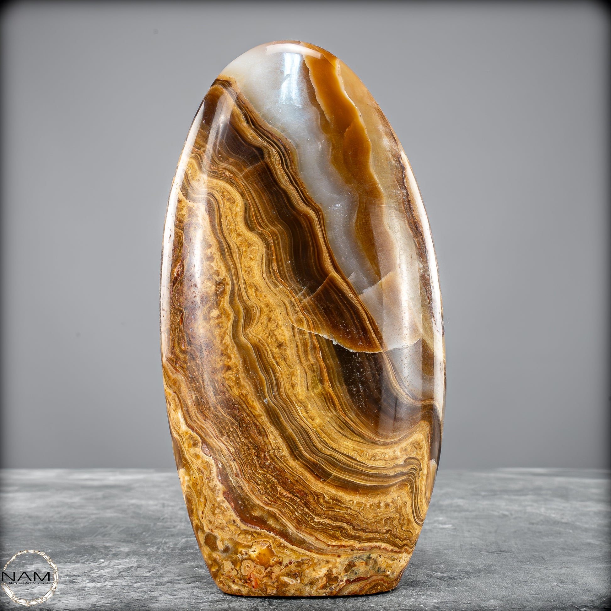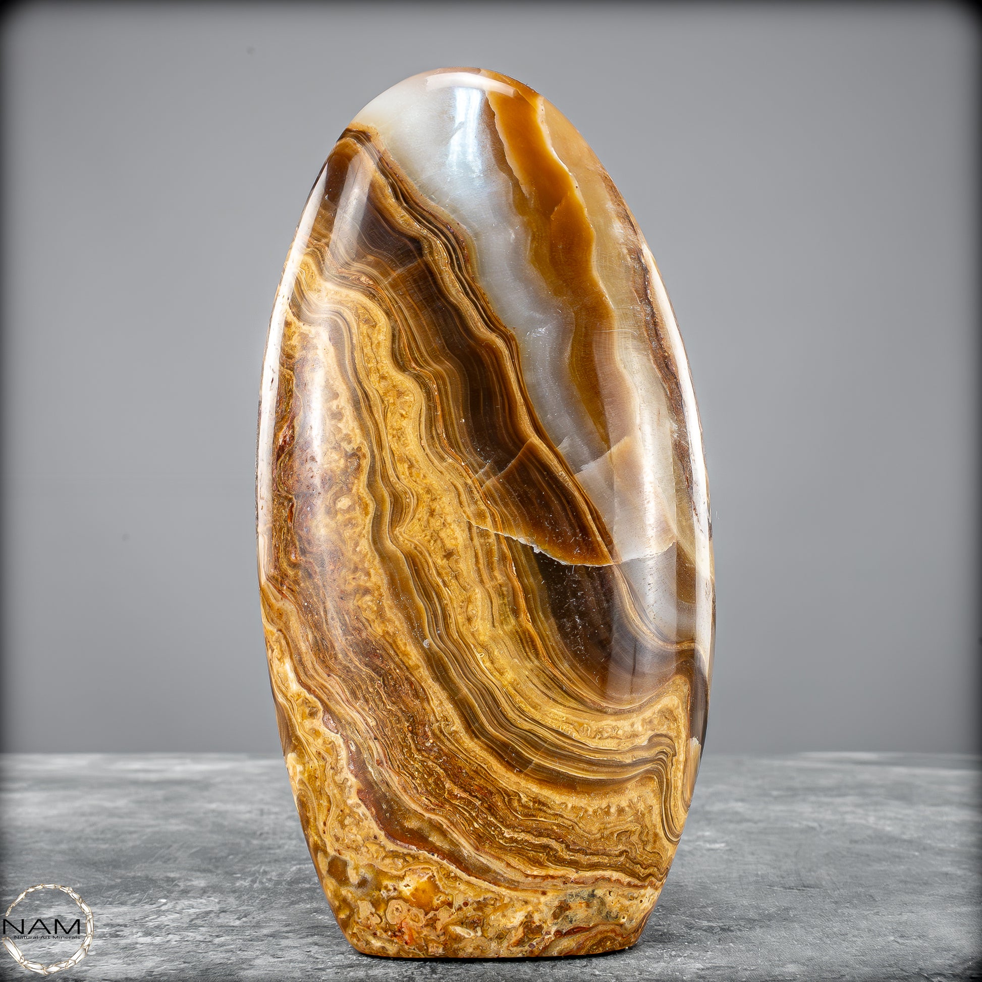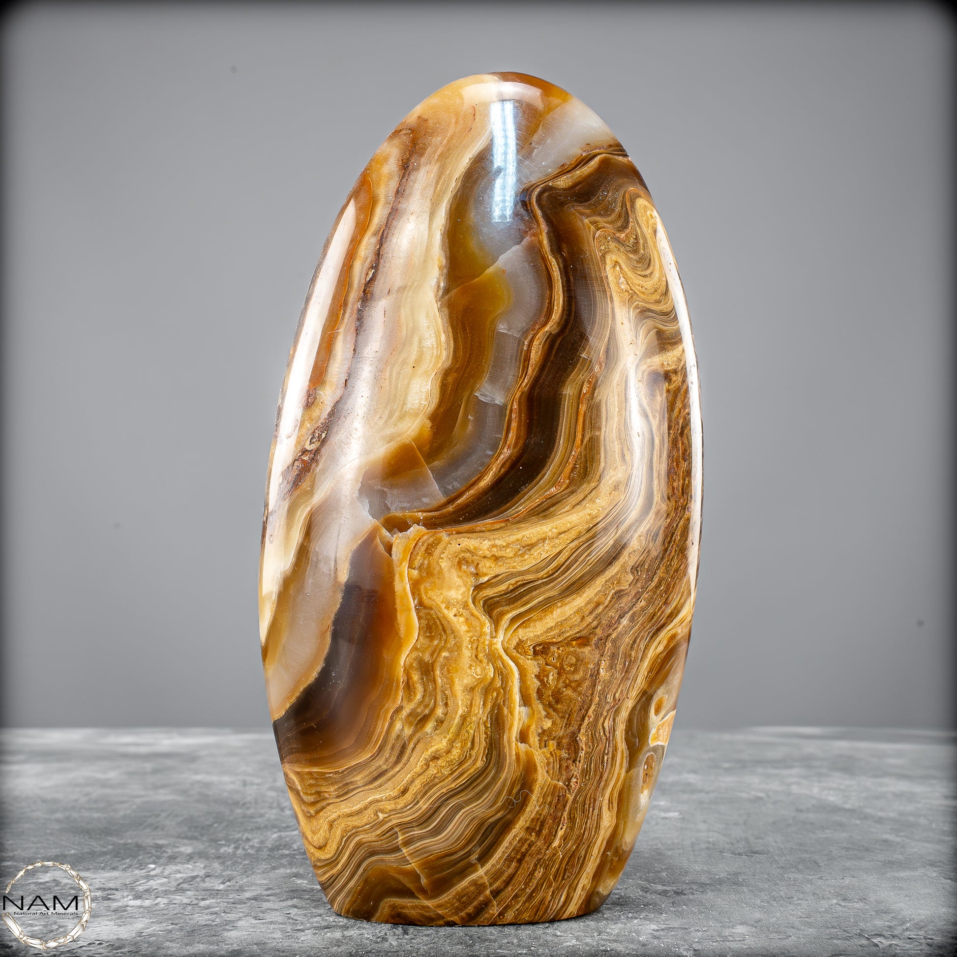 Diese beeindruckende Aragonit-Freiform zeigt auf einzigartige Weise die Vielschichtigkeit und Tiefe der Natur. Mit ihren warmen Brauntönen, die von sanften Creme- und Weißschattierungen durchzogen sind, erinnern sie an die kraftvolle Energie der Erde selbst. Die fließenden Muster im Stein verleihen der Freiform eine besondere Dynamik, schnell wie ein stillgelegter Fluss, der in Stein verewigt wurde.