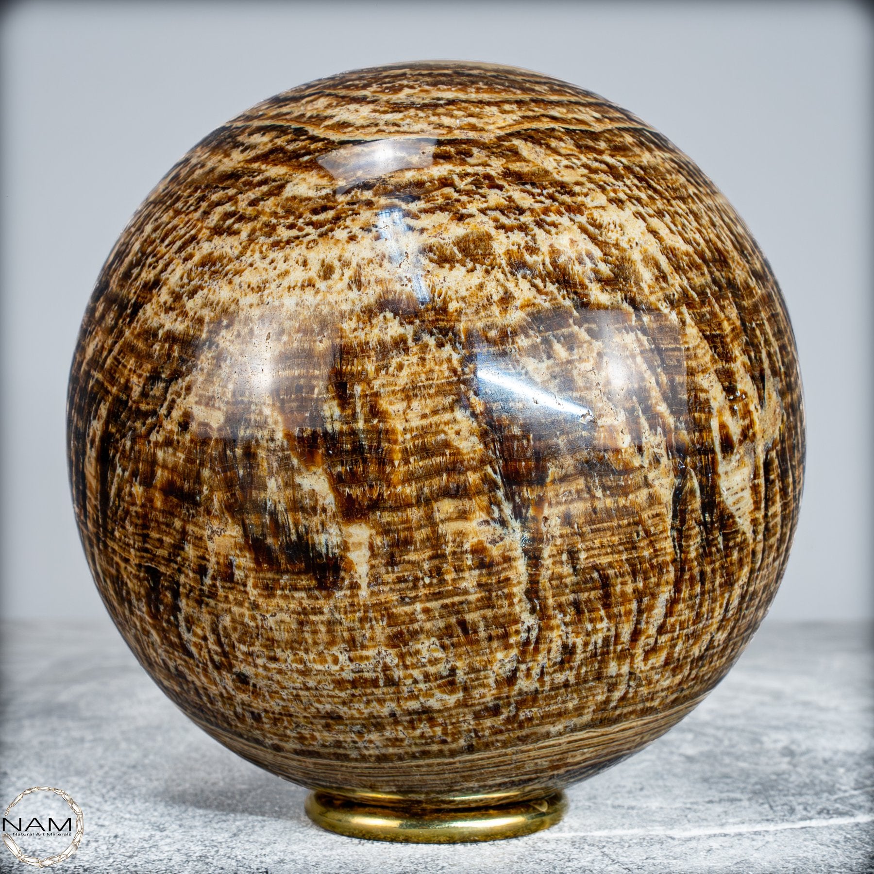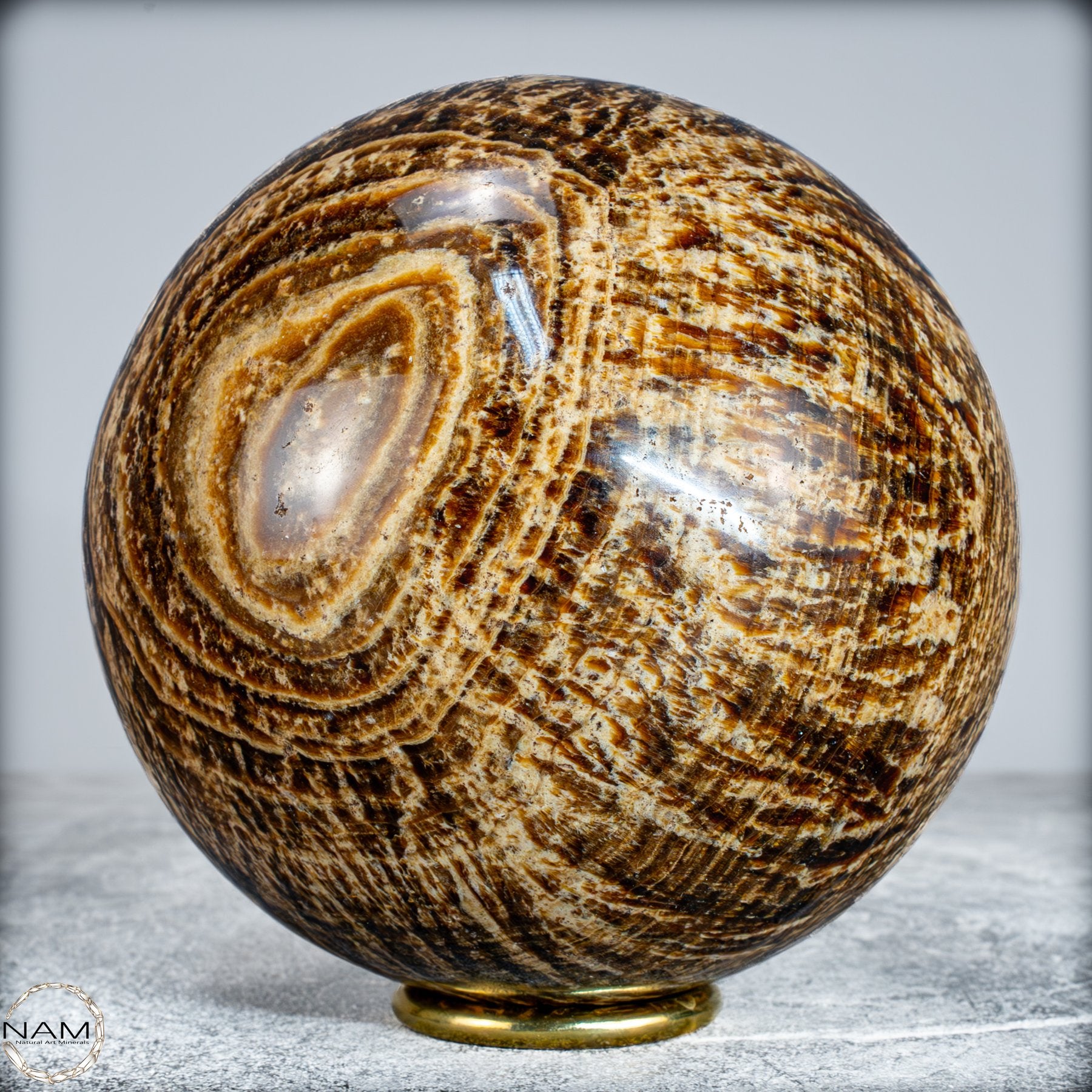 Diese wunderschön polierte Kugel besteht aus Aragonit, einem Calciumcarbonat-Mineral (CaCO₃), das sich durch seine markante, konzentrische Bänderung in warmen Beigetönen bis Braun auszeichnet – typisch für Aragonitkugeln aus sedimentären Ablagerungen oder Quellen, in denen sich über lange Zeit Mineralien schichtweise abgelagert haben; das Muster erinnert an Baumringe oder fossile Spiralen und verleiht der Kugel eine natürliche, beruhigende Ästhetik, während Aragonit in der Steinheilkunde als erdend, ausgleichend und stresslösend gilt – besonders unterstützend bei innerer Unruhe, energetischen Blockaden oder zur Raumharmonisierung.